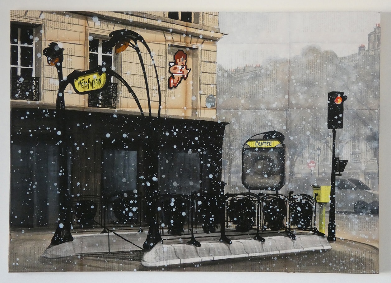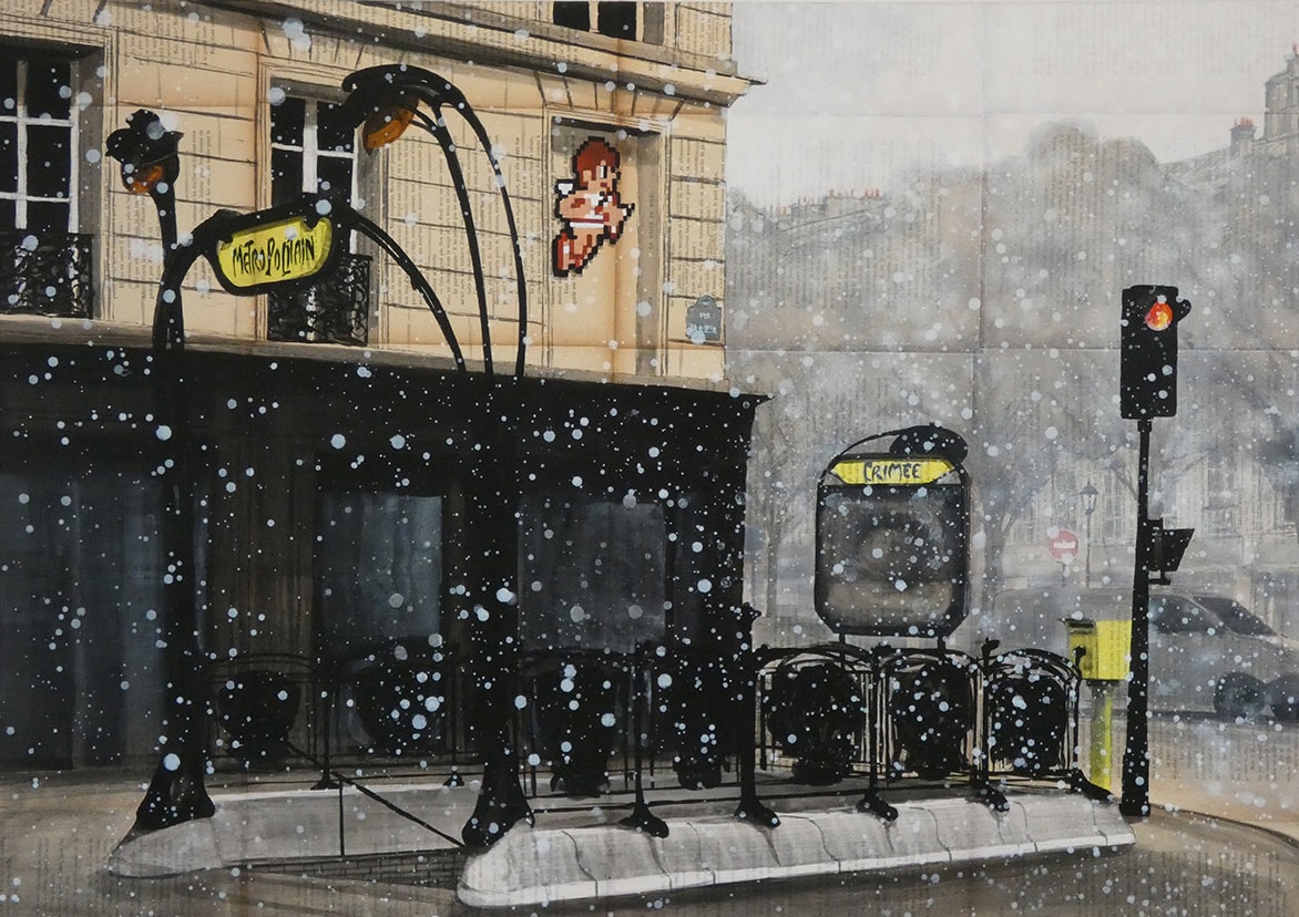 The ‘mise en abyme’ process consists of putting a smaller image within the same image. Here Guillaume Chansarel was inspired by ‘Invader’: he included the Parisian ‘Space Invaders’ in his canvases. Invader is a famous French street artist who has put up mosaic artworks (called ‘Space Invaders’) on the walls of major international cities. Guillaume Chansarel says: “Paris is a museum with bare walls just waiting to be decorated. The Space Invaders characters scattered here and there are signals, that whilst livening up the streets with their bright colours, seem to invite us to stop for a moment. Either in front of a theatrical perspective, or in front of a myriad of building facades, or even higher up on a chimney stack…”. The artwork’s associated video QR code is hidden in the canvas: the public are invited to look for the QR code in the artwork just as they would look for the city’s Space Invaders. ‘Mise en abyme’ is architecture meeting an artist, meeting another artist.