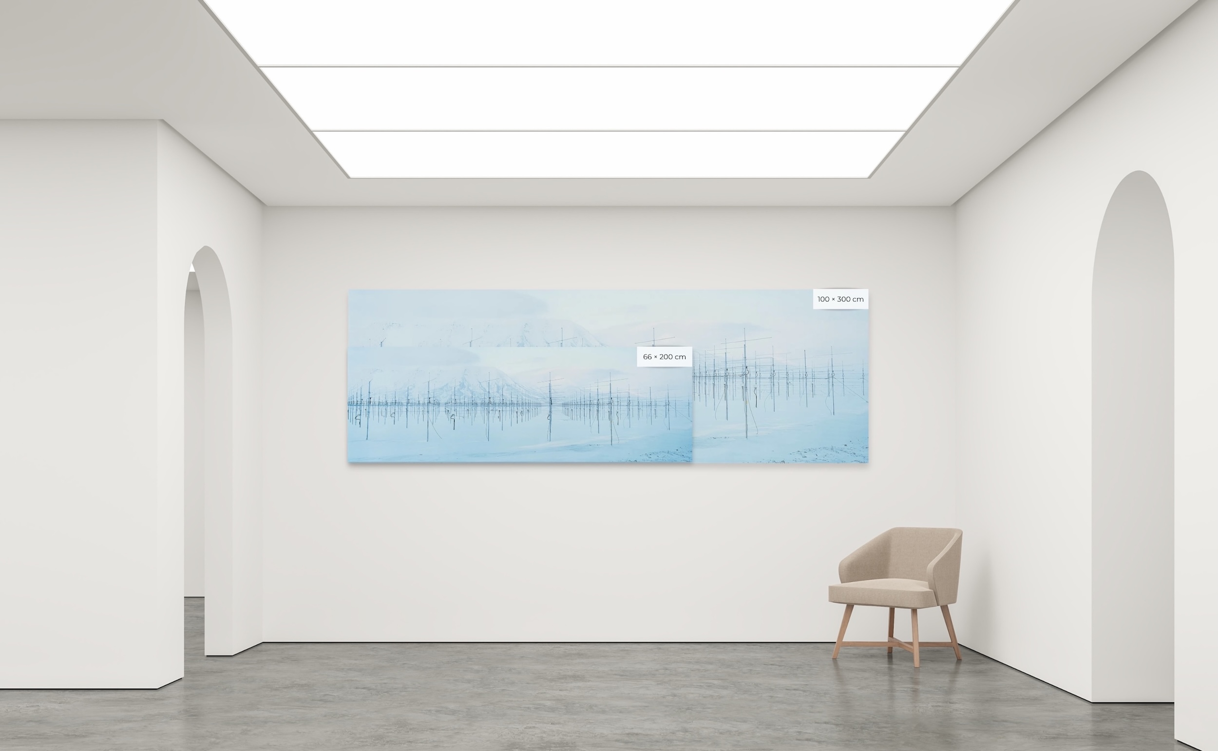 All of the photographs in the Arctic Technology series were taken on Spitsbergen, the largest island in the Svalbard archipelago, which is located between mainland Norway and the North Pole. This area is renowned for its untouched, moon-like landscape and magical light. It also has the cleanest atmosphere on Earth, making it particularly suitable for climate research and space observation. Gigantic technical installations, satellite receivers, and a Global Seed Vault containing biodiversity have been constructed on the island, blending with the pristine natural landscape while also interfering with it. While aesthetically captivating, Christian Houge’s photographs prompt reflection on the relationship between technology and nature. The panoramic format he has chosen for this series aims to create a sense of spatial disorientation.