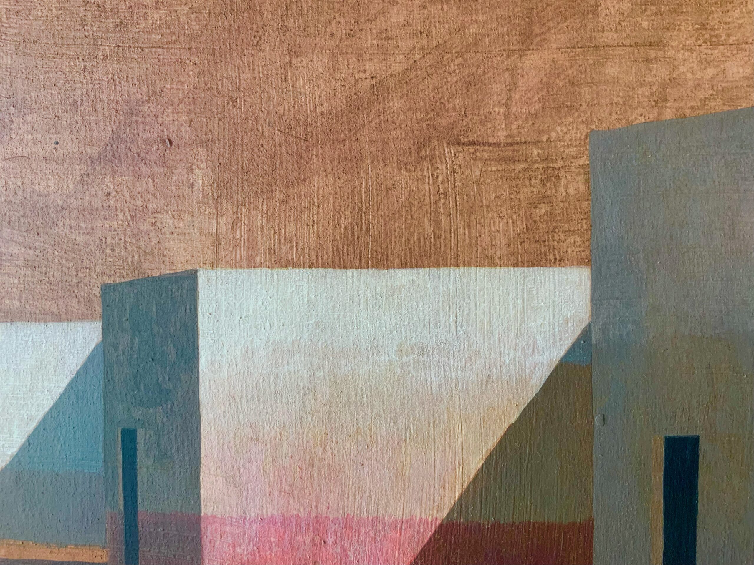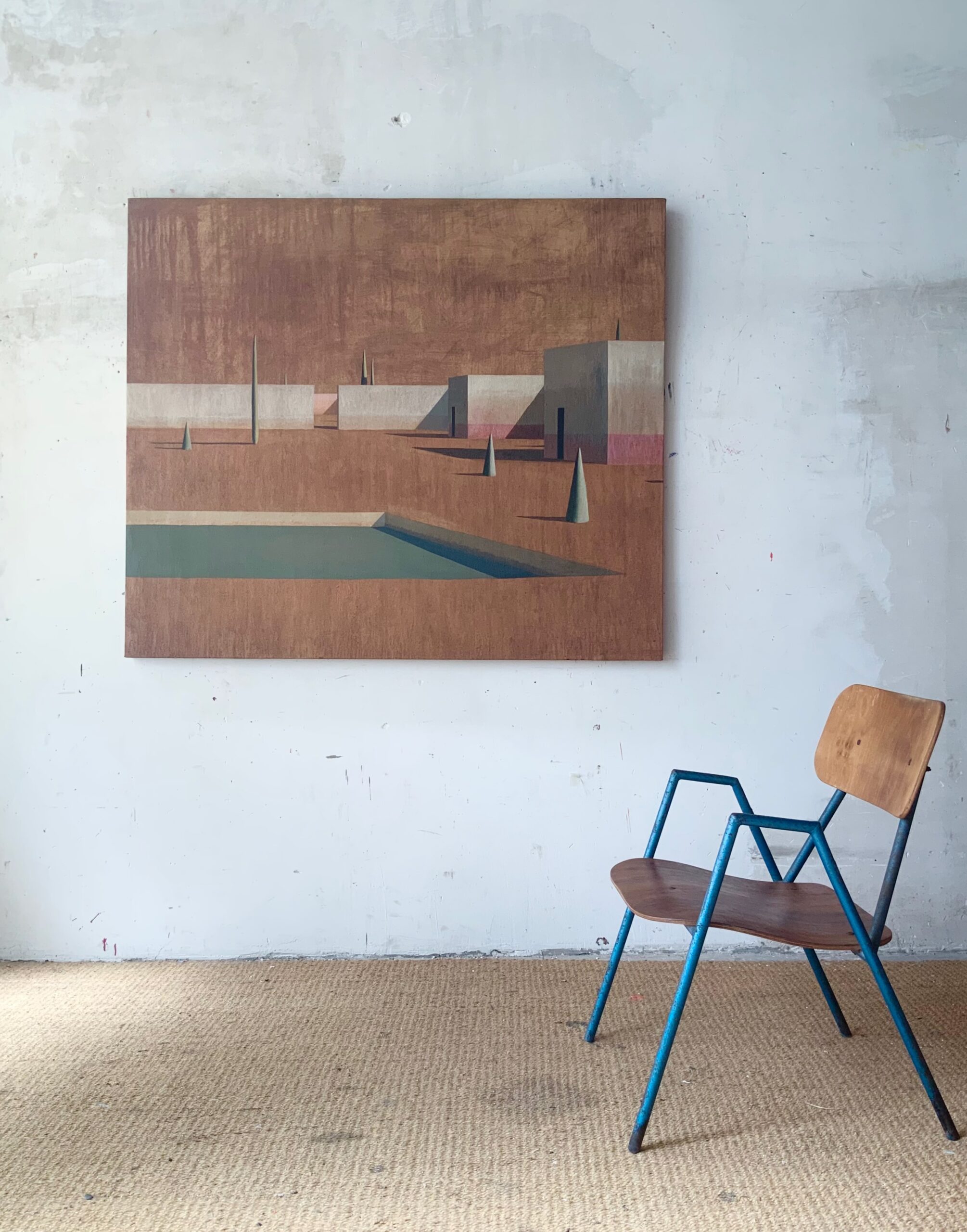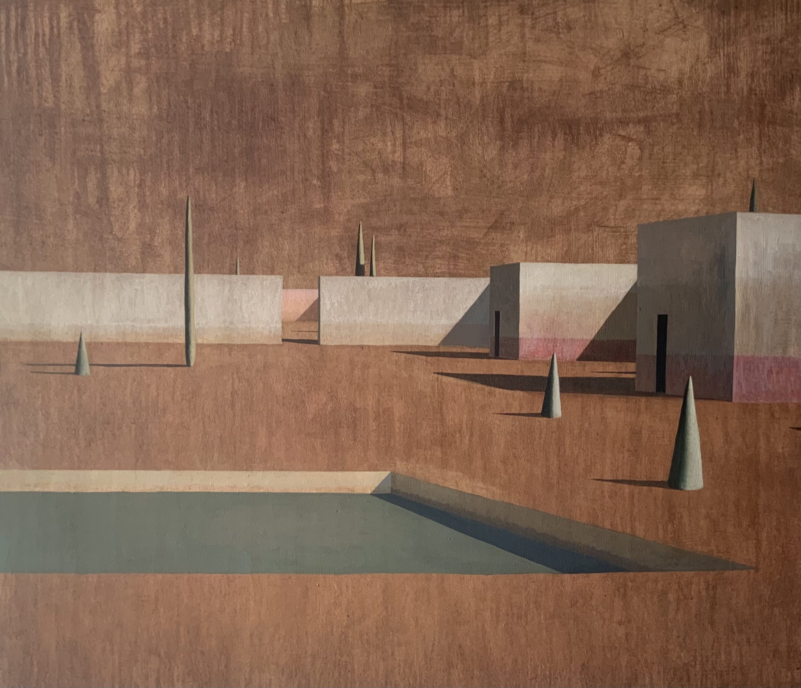 In these paintings, the artist establishes a conversation between architecture and landscape in a figurative work boasting geometric shapes and an enigmatic atmosphere. The landscapes and the simplicity of the forms (nearly abstract) make for a very theatrical view of architecture.