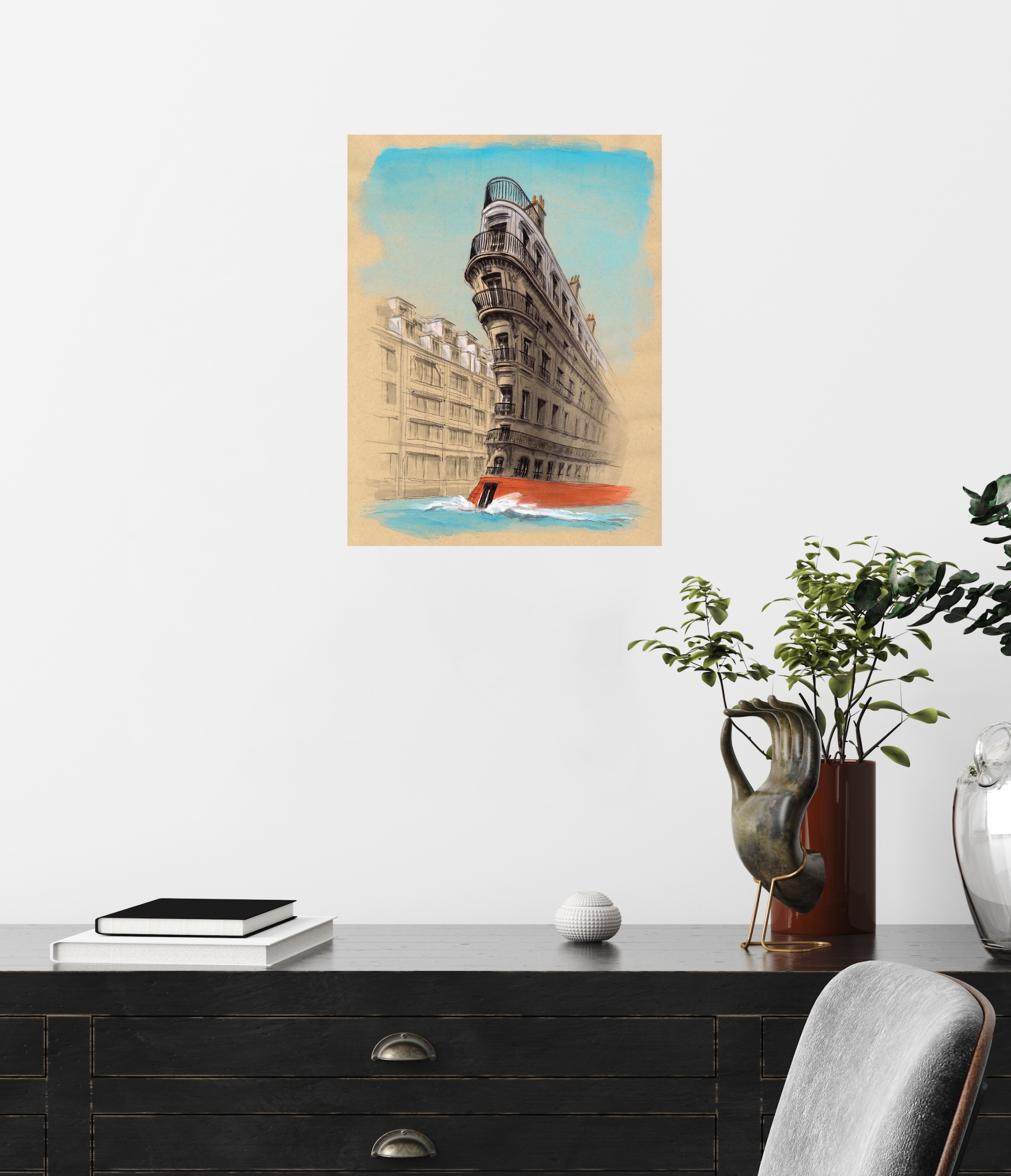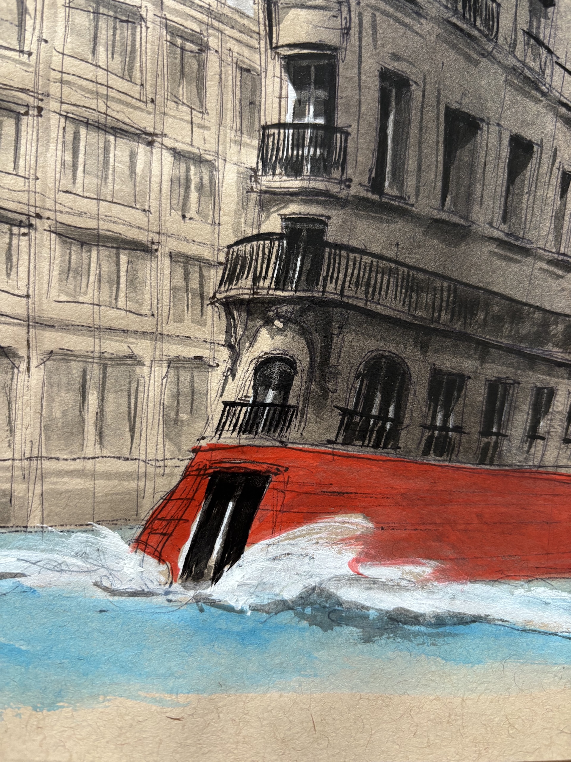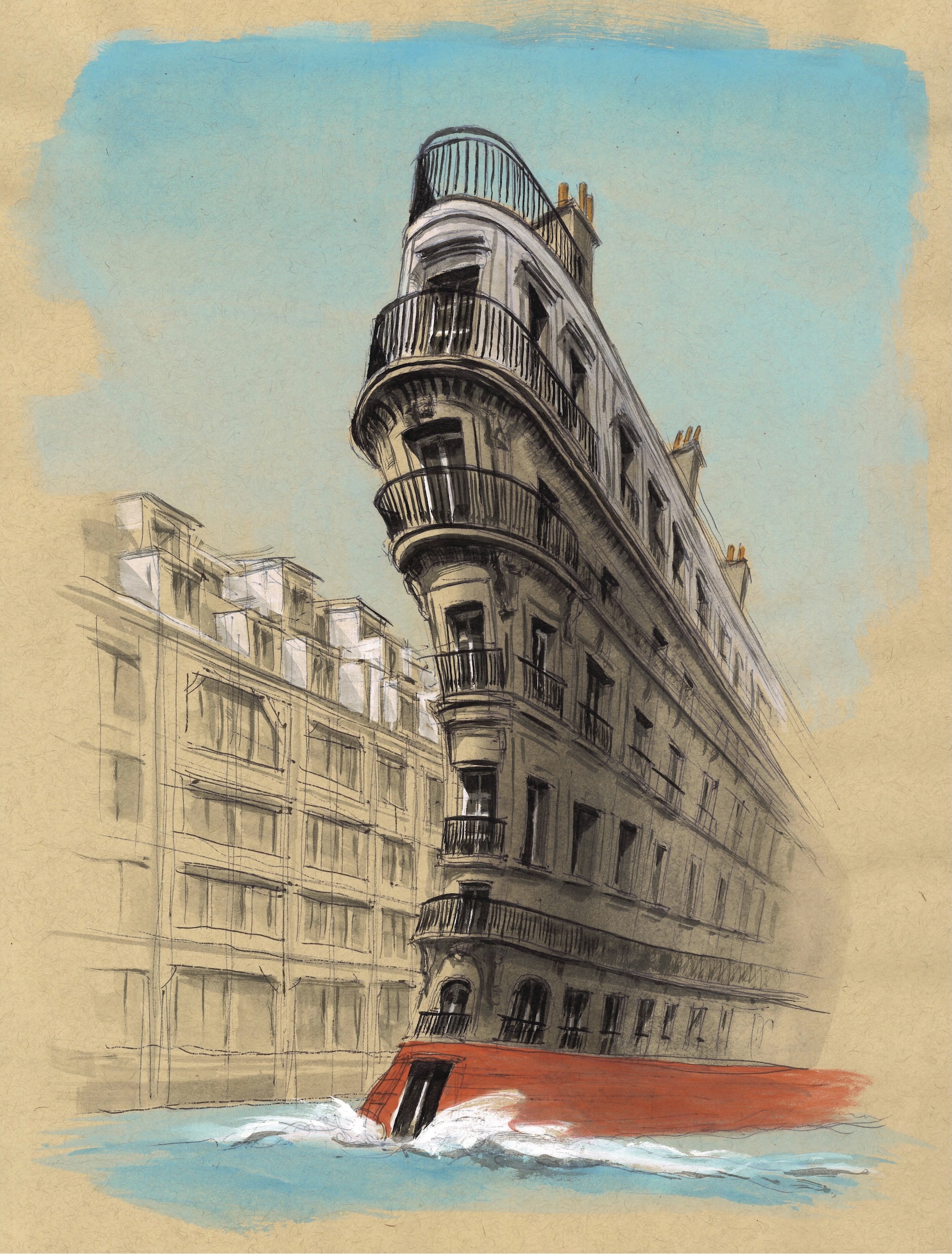 ArchiParis – Cruise liner (Utopia) is a drawing by contemporary French artist Guillaume Chansarel. This drawing depicts a fictional urban scene in which the facade of a Haussmann-style building takes on the appearance of a boat sailing on the waters of the Seine. Here, realism is subverted by the creation of an animated building-boat.