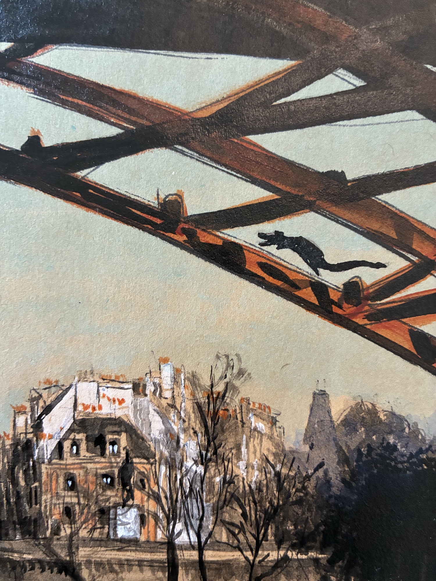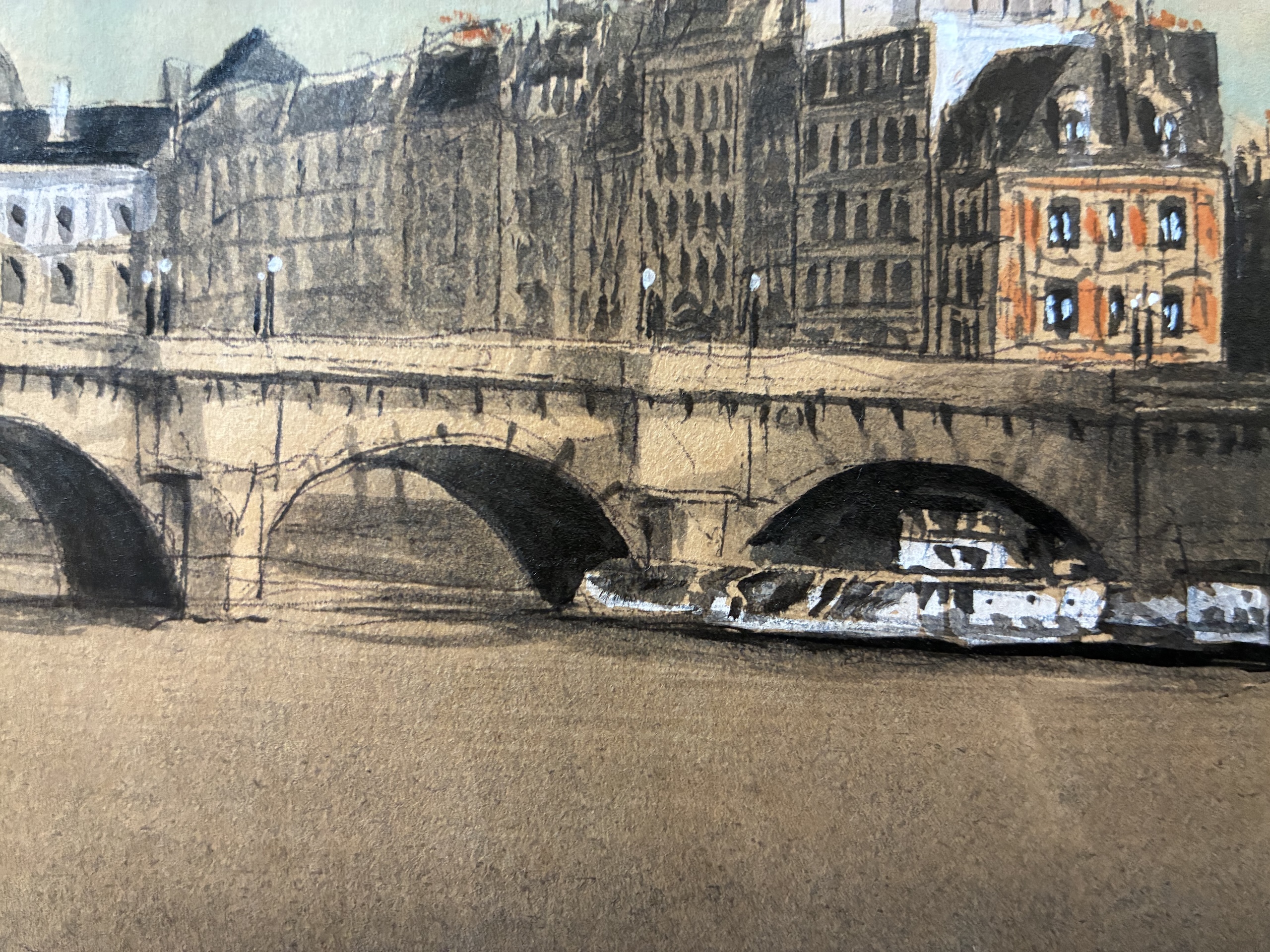 This drawing is part of a larger artistic project dedicated to Paris, in which the artist created 104 drawings depicting various locations across the city. These works are compiled in an artist book titled ArchiParis, presented in five volumes. Each volume explores a selection of alphabet letters, with each letter linked to a keyword that serves as inspiration for the drawings. For instance, the letter A corresponds to arrival, representing different ways of entering Paris—by plane, boat, train, or road. The letter G is associated with gallery, featuring tunnels and passageways. This particular drawing of the Île de la Cité falls under the letter X, linked to the word xérus (Xerus in French). Here, Guillaume Chansarel has hidden a small element that refers Xerus (a small rodent); in fact, you can spot a rodent running along the metal arch of the bridge. ArchiParis takes the reader on a Parisian stroll, a singular urban exploration through the eyes of the artist. This series of drawings aims to present and reveal Paris from a distinctive perspective: that of a true Parisian.