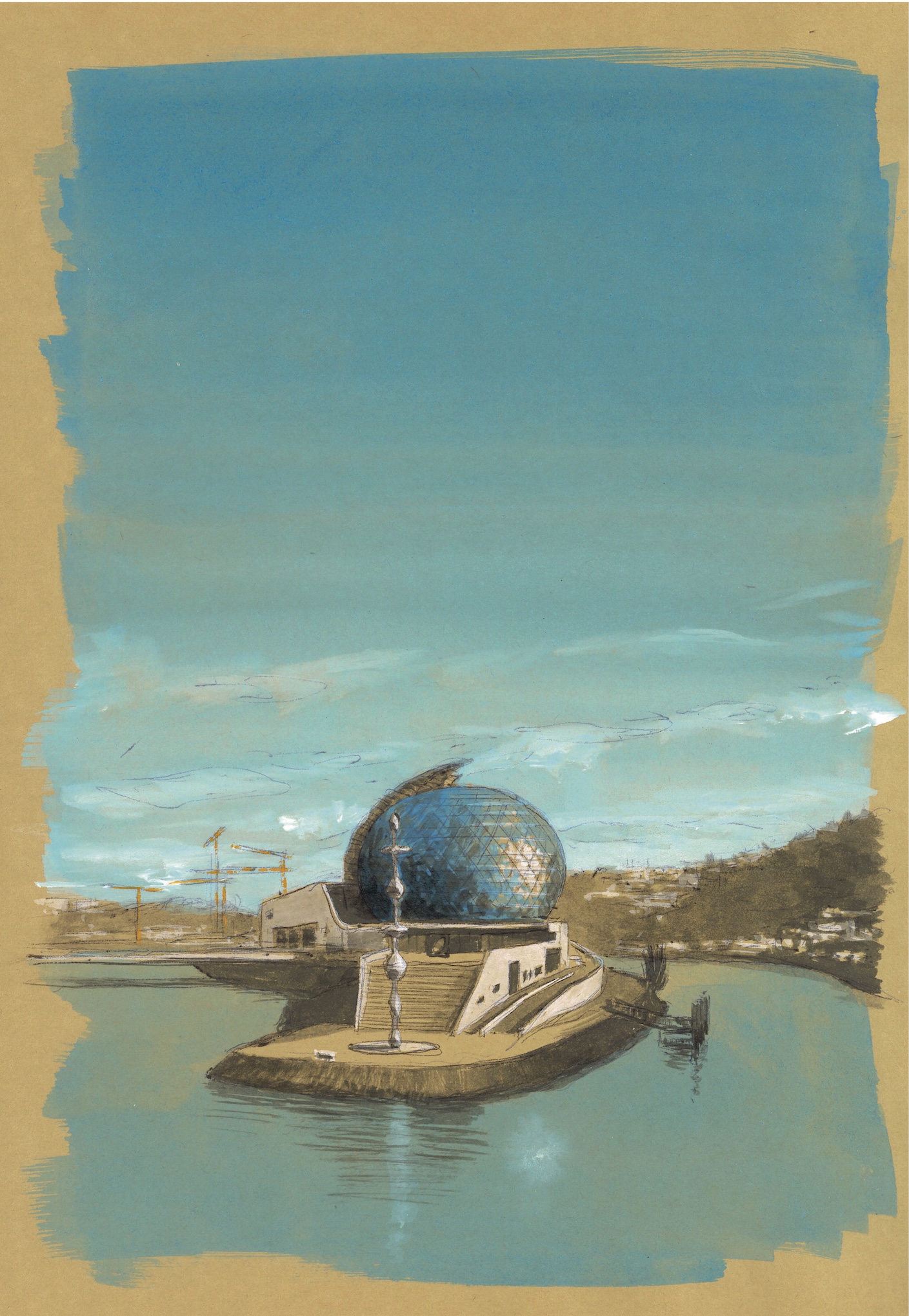 The clarity of the blue sky and the buildings creates a setting for this elevated, egg-shaped theater with a circular auditorium and a large rooftop garden. This view is portrayed with meticulousness and finesse, highlighting a cultural landmark that symbolizes French musical culture.