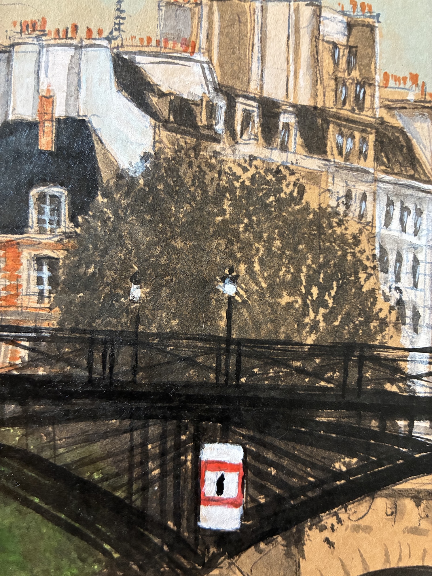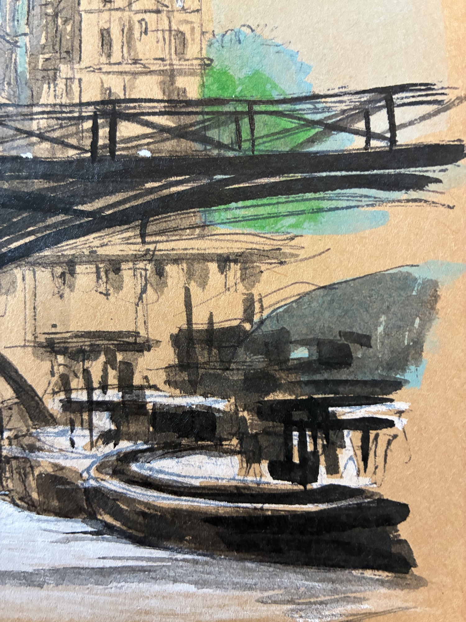 This drawing is part of a larger artistic project dedicated to Paris, in which the artist created 104 drawings depicting various locations across the city. These original works are reproduced in an artist book titled ArchiParis, presented in five volumes. Each volume explores a selection of alphabet letters, with each letter linked to a keyword that serves as inspiration for the drawings. For instance, the letter A corresponds to arrival, representing different ways of entering Paris—by plane, boat, train, or road. The letter G is associated with gallery, featuring tunnels and passageways. This particular drawing of the Pont des Arts falls under the letter Q, linked to the word quai (Riverbank in French). ArchiParis takes the reader on a Parisian stroll, a singular urban exploration through the eyes of the artist. This series of drawings aims to present and reveal Paris from a distinctive perspective: that of a true Parisian.