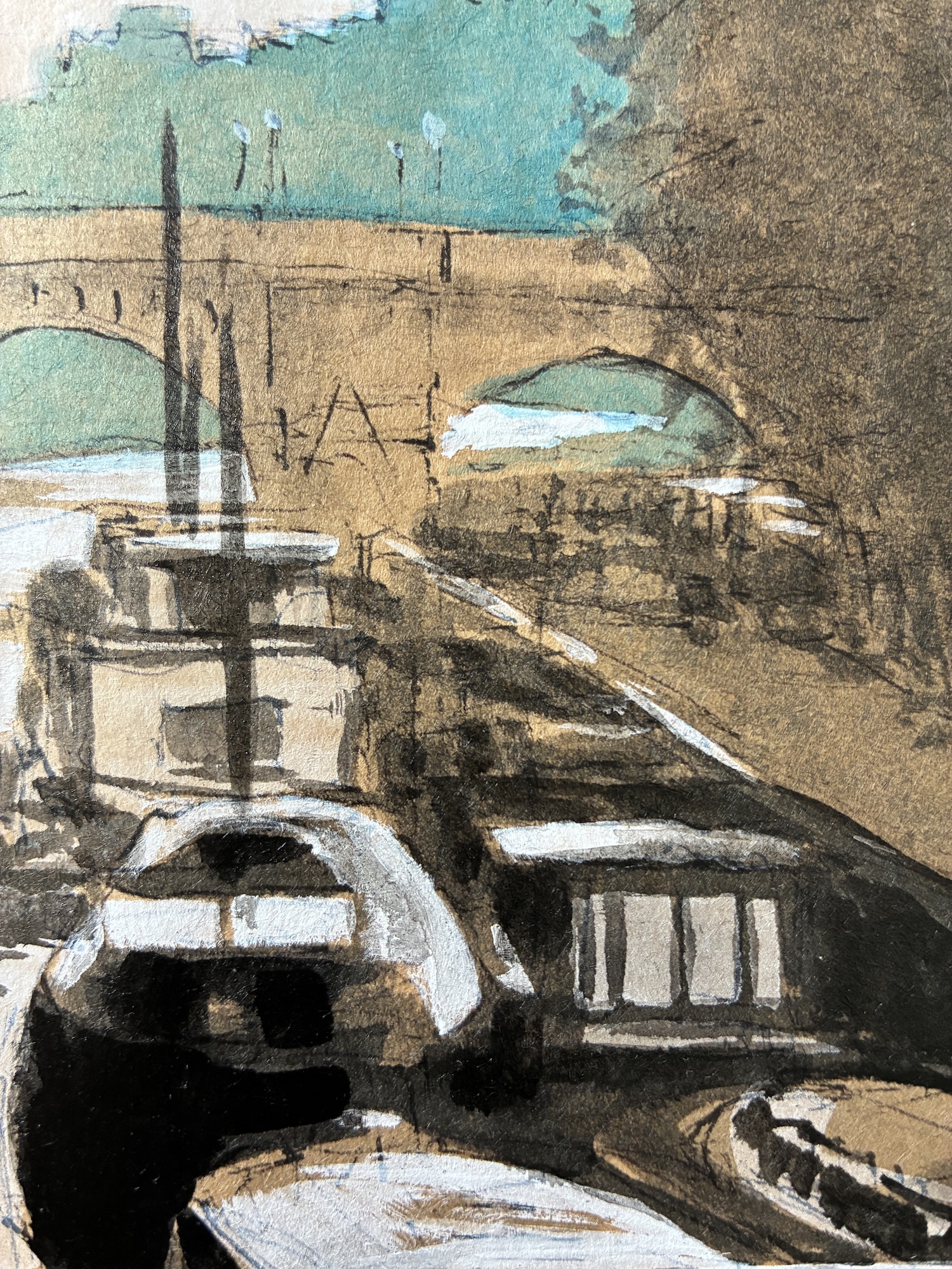 This drawing is part of a larger artistic project dedicated to Paris, in which the artist created 104 drawings depicting various locations across the city. These works are compiled in an artist book titled ArchiParis, presented in five volumes. Each volume explores a selection of alphabet letters, with each letter linked to a keyword that serves as inspiration for the drawings. For instance, the letter A corresponds to arrival, representing different ways of entering Paris—by plane, boat, train, or road. The letter G is associated with gallery, featuring tunnels and passageways. This particular drawing of the Pont Neuf (New Bridge) falls under the letter L, linked to the word lumière (Light in French). ArchiParis takes the reader on a Parisian stroll, a singular urban exploration through the eyes of the artist. This series of drawings aims to present and reveal Paris from a distinctive perspective: that of a true Parisian.