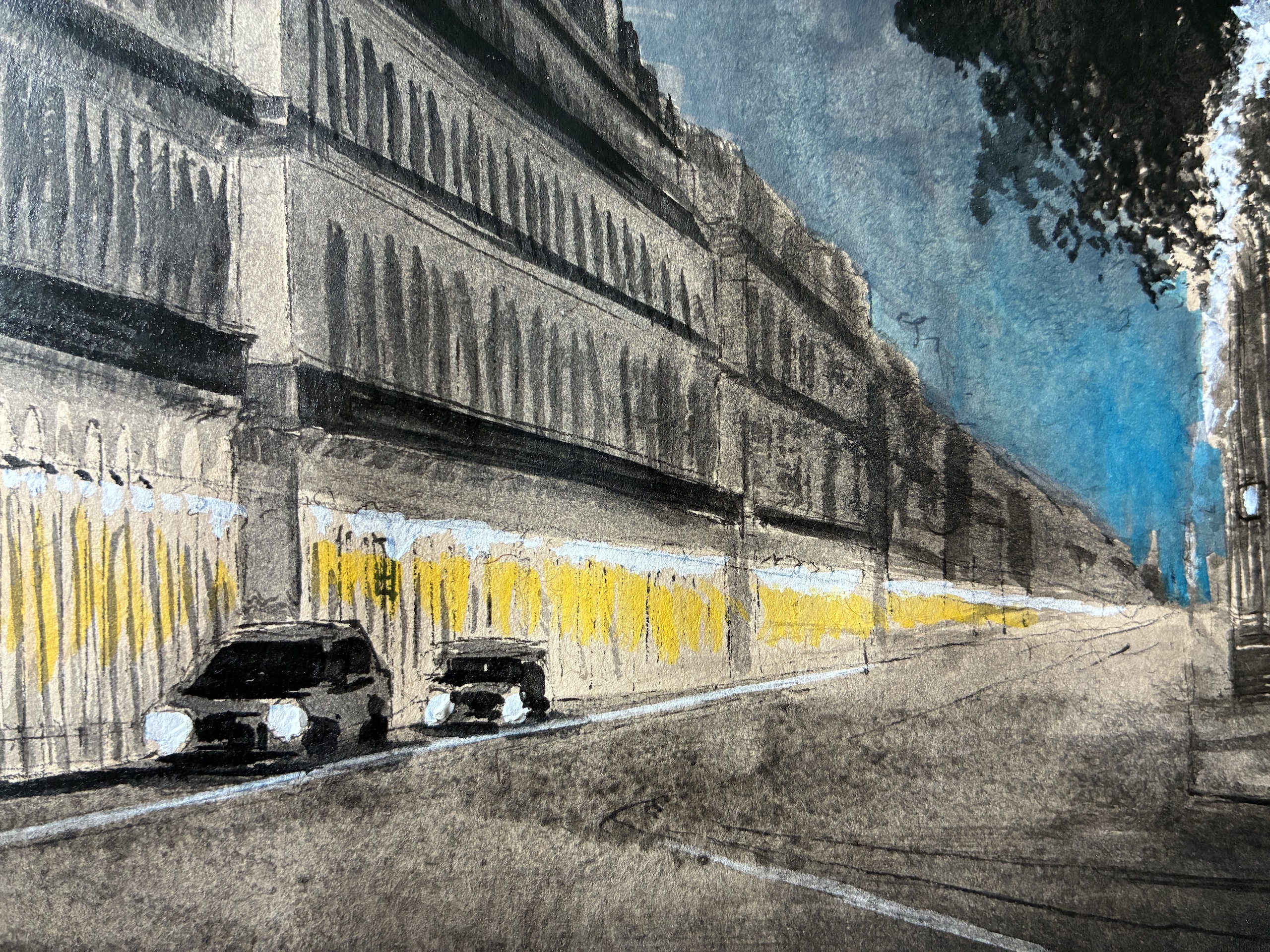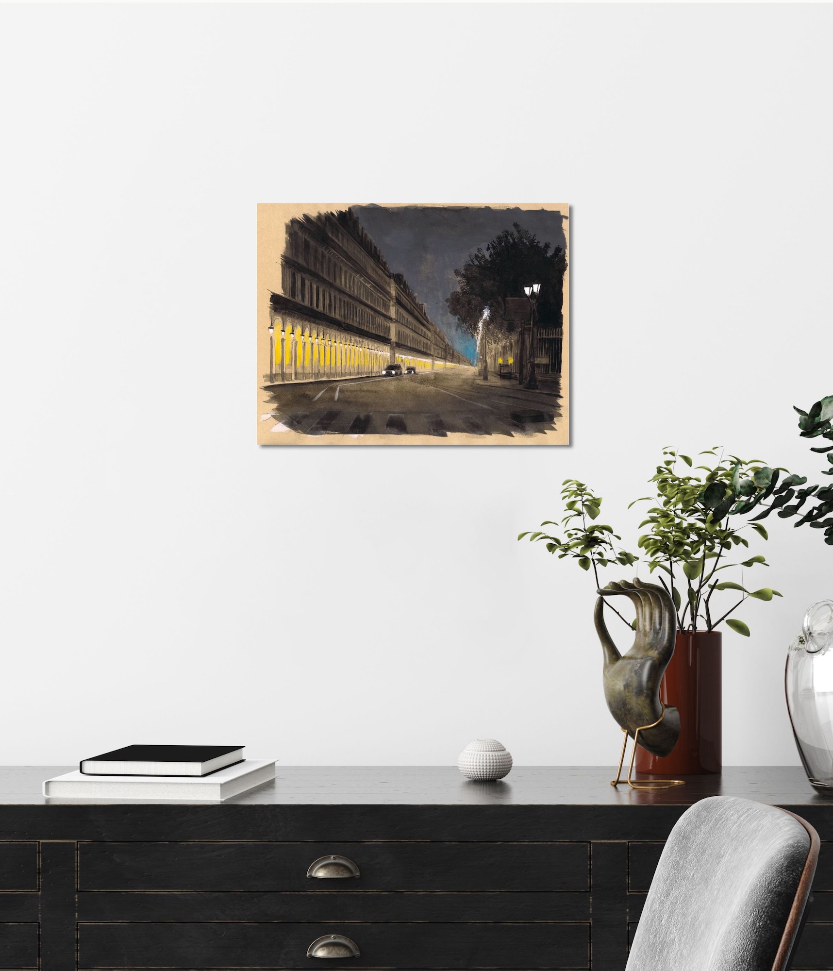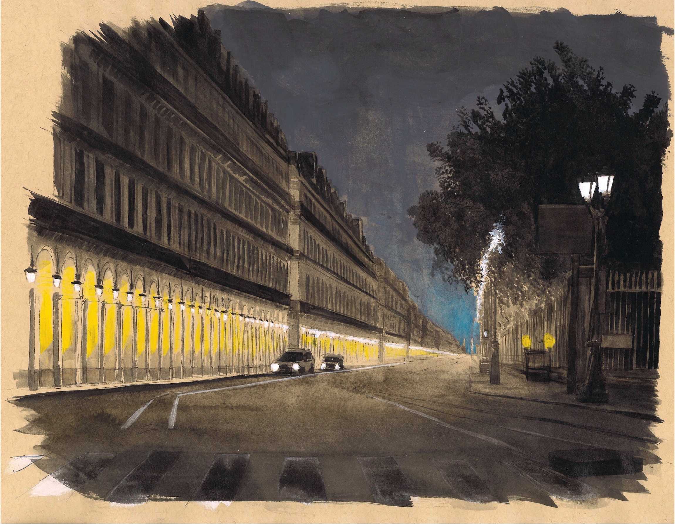 This drawing is part of a larger artistic project dedicated to Paris, in which the artist created 104 drawings depicting various locations across the city. These original works are reproduced in an artist book titled ArchiParis, presented in five volumes. Each volume explores a selection of alphabet letters, with each letter linked to a keyword that serves as inspiration for the drawings. For instance, the letter A corresponds to arrival, representing different ways of entering Paris—by plane, boat, train, or road. The letter G is associated with gallery, featuring tunnels and passageways. This particular drawing of the Rue de Rivoli falls under the letter M, linked to the word minuit (Midnight in French). ArchiParis takes the reader on a Parisian stroll, a singular urban exploration through the eyes of the artist. This series of drawings aims to present and reveal Paris from a distinctive perspective: that of a true Parisian.