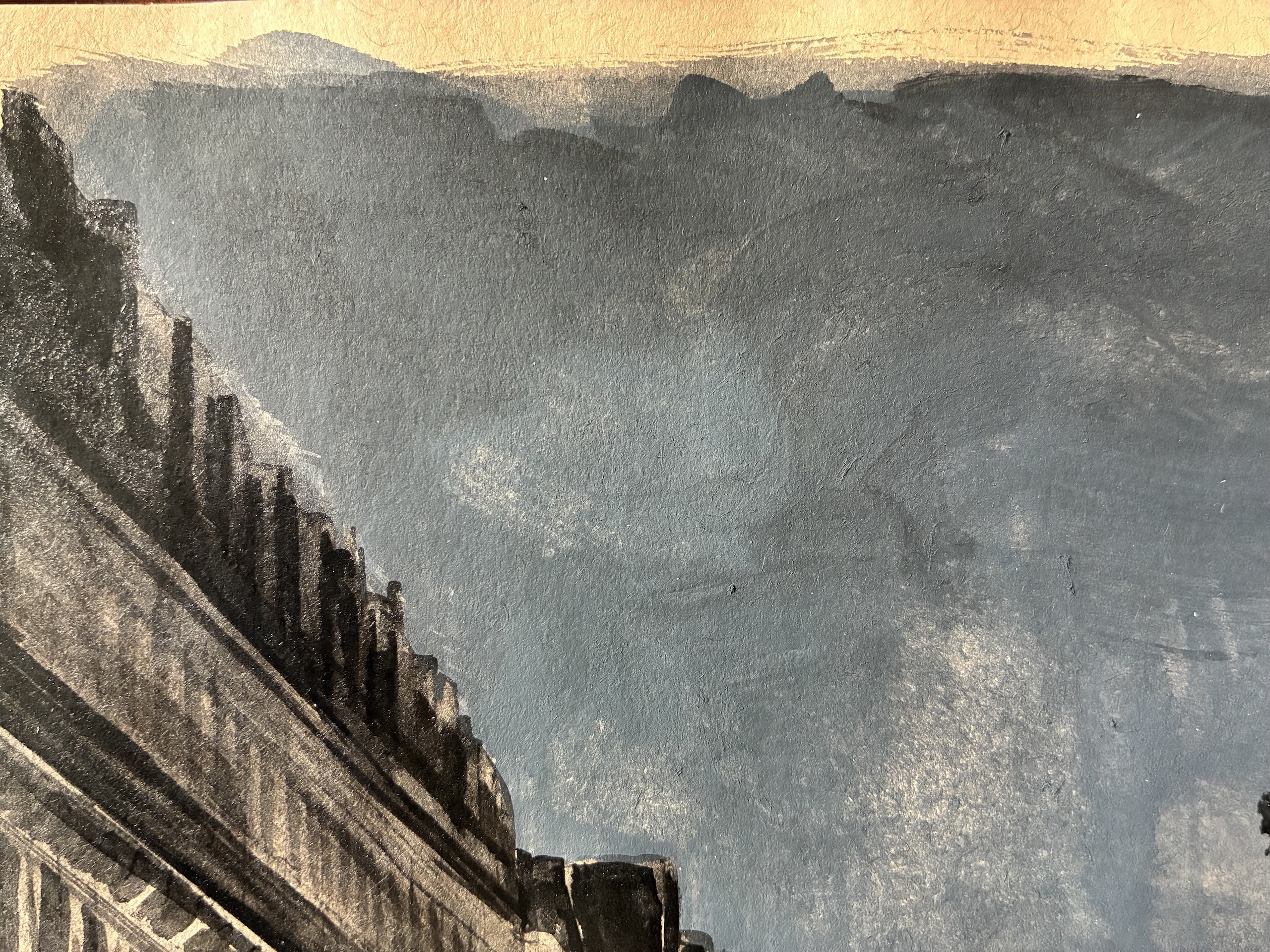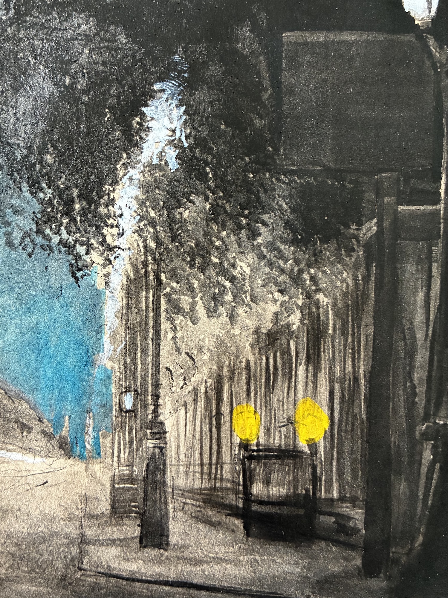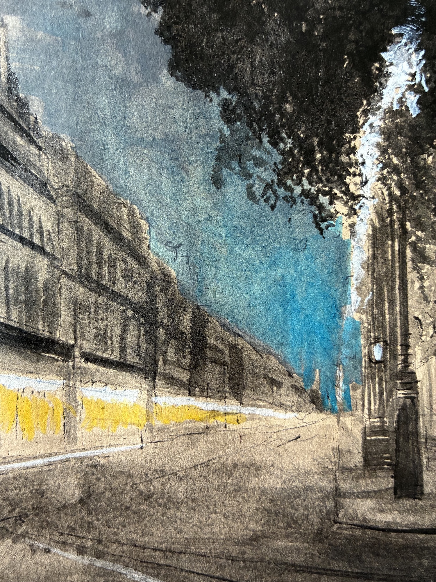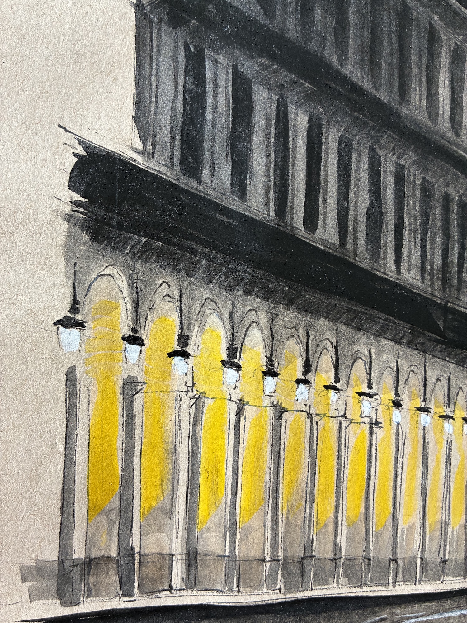 This drawing is part of a larger artistic project dedicated to Paris, in which the artist created 104 drawings depicting various locations across the city. These original works are reproduced in an artist book titled ArchiParis, presented in five volumes. Each volume explores a selection of alphabet letters, with each letter linked to a keyword that serves as inspiration for the drawings. For instance, the letter A corresponds to arrival, representing different ways of entering Paris—by plane, boat, train, or road. The letter G is associated with gallery, featuring tunnels and passageways. This particular drawing of the Rue de Rivoli falls under the letter M, linked to the word minuit (Midnight in French). ArchiParis takes the reader on a Parisian stroll, a singular urban exploration through the eyes of the artist. This series of drawings aims to present and reveal Paris from a distinctive perspective: that of a true Parisian.