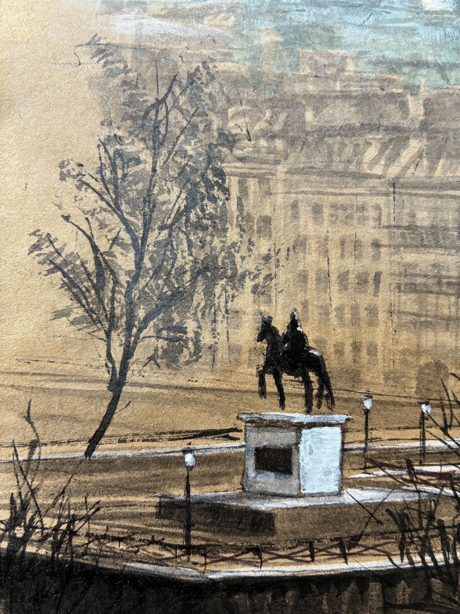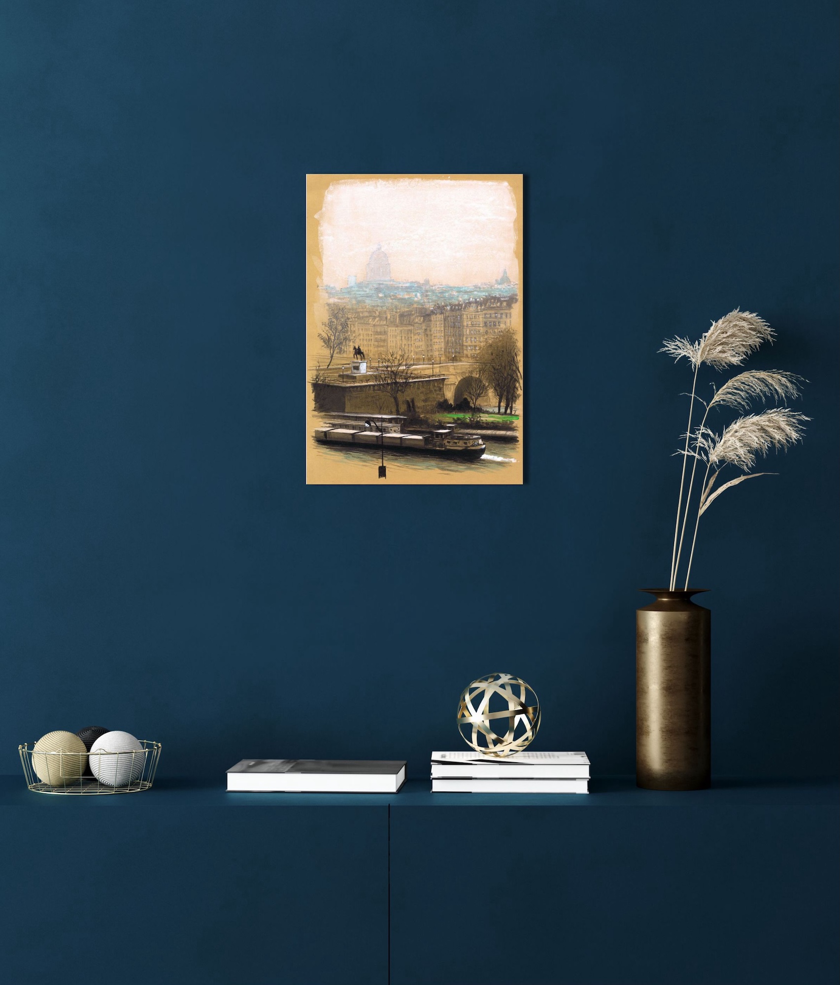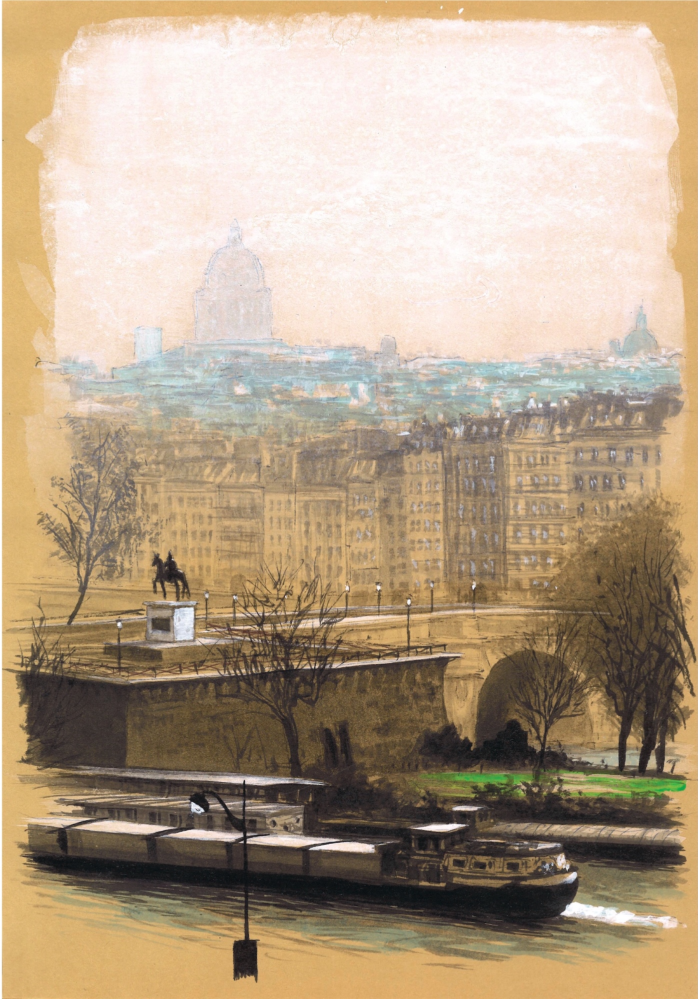 ArchiParis – Square du Vert-Galant is a drawing by contemporary French artist Guillaume Chansarel. This drawing shows a high-angle view of the Square du Vert-Galant and the statue of Henry IV. The square is surrounded by elements that are highly representative of Paris: a barge on the Seine, Haussmann-style buildings, and in the distance, the rooftops and monuments of Paris, softened by a light bluish mist. This drawing reveals the artist’s great attention to detail in the way he depicts the city of Paris.