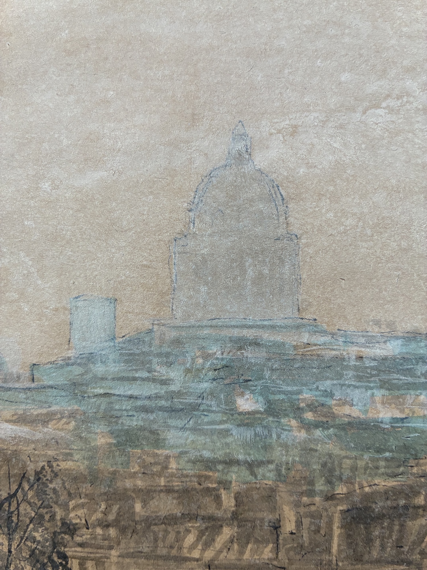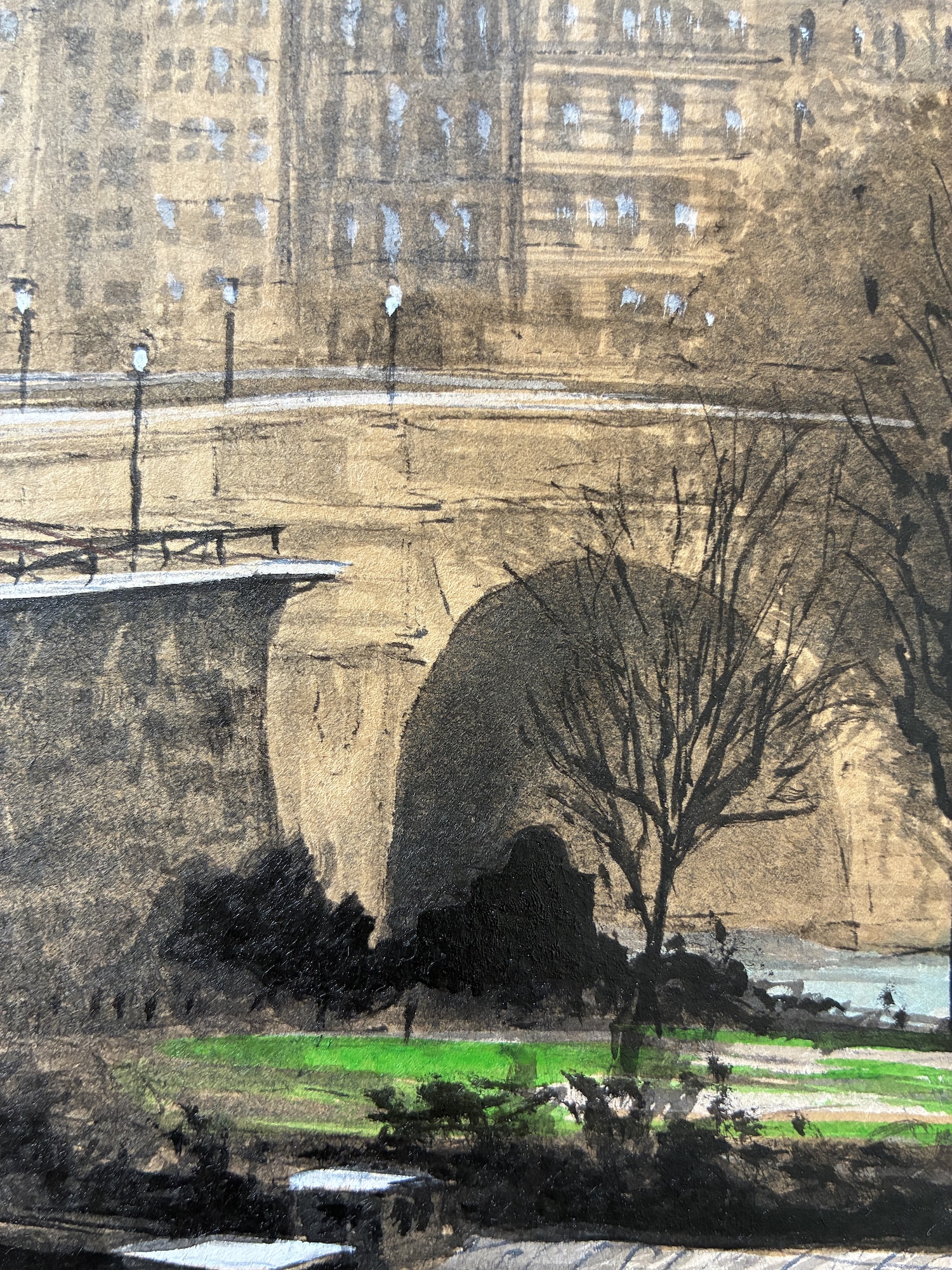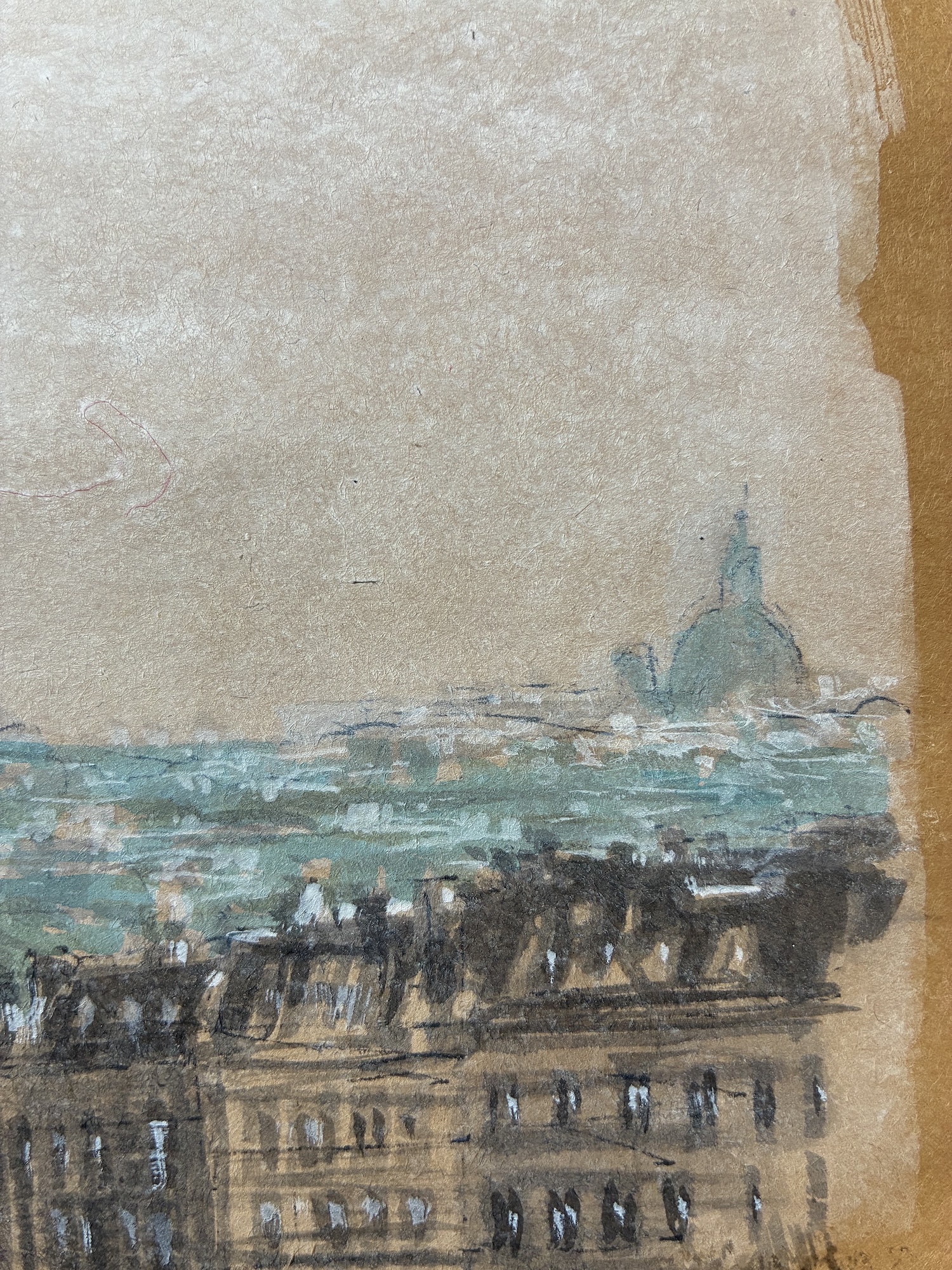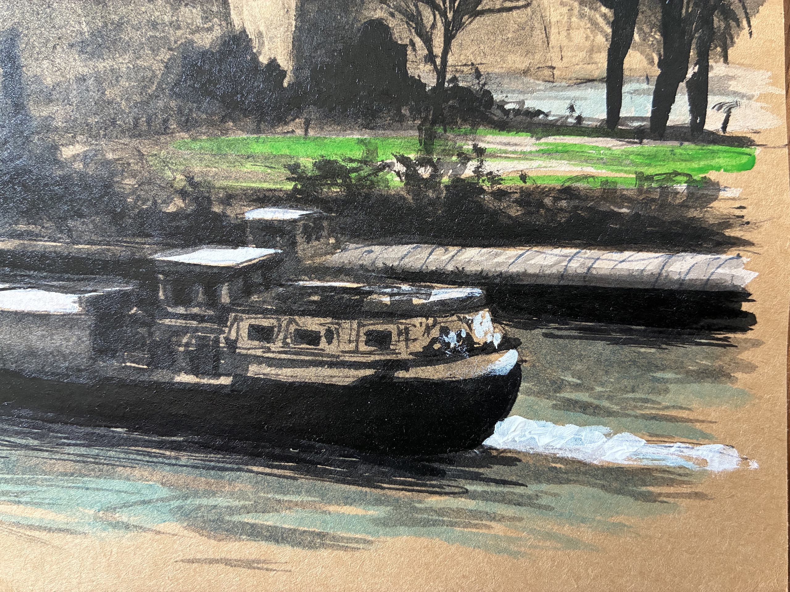 This drawing is part of a larger artistic project dedicated to Paris, in which the artist created 104 drawings depicting various locations across the city. These original works are reproduced in an artist book titled ArchiParis, presented in five volumes. Each volume explores a selection of alphabet letters, with each letter linked to a keyword that serves as inspiration for the drawings. For instance, the letter A corresponds to arrival, representing different ways of entering Paris—by plane, boat, train, or road. The letter G is associated with gallery, featuring tunnels and passageways. This particular drawing of the Square du Vert-Galant falls under the letter F, linked to the word fantôme (Ghosts in French). ArchiParis takes the reader on a Parisian stroll, a singular urban exploration through the eyes of the artist. This series of drawings aims to present and reveal Paris from a distinctive perspective: that of a true Parisian.