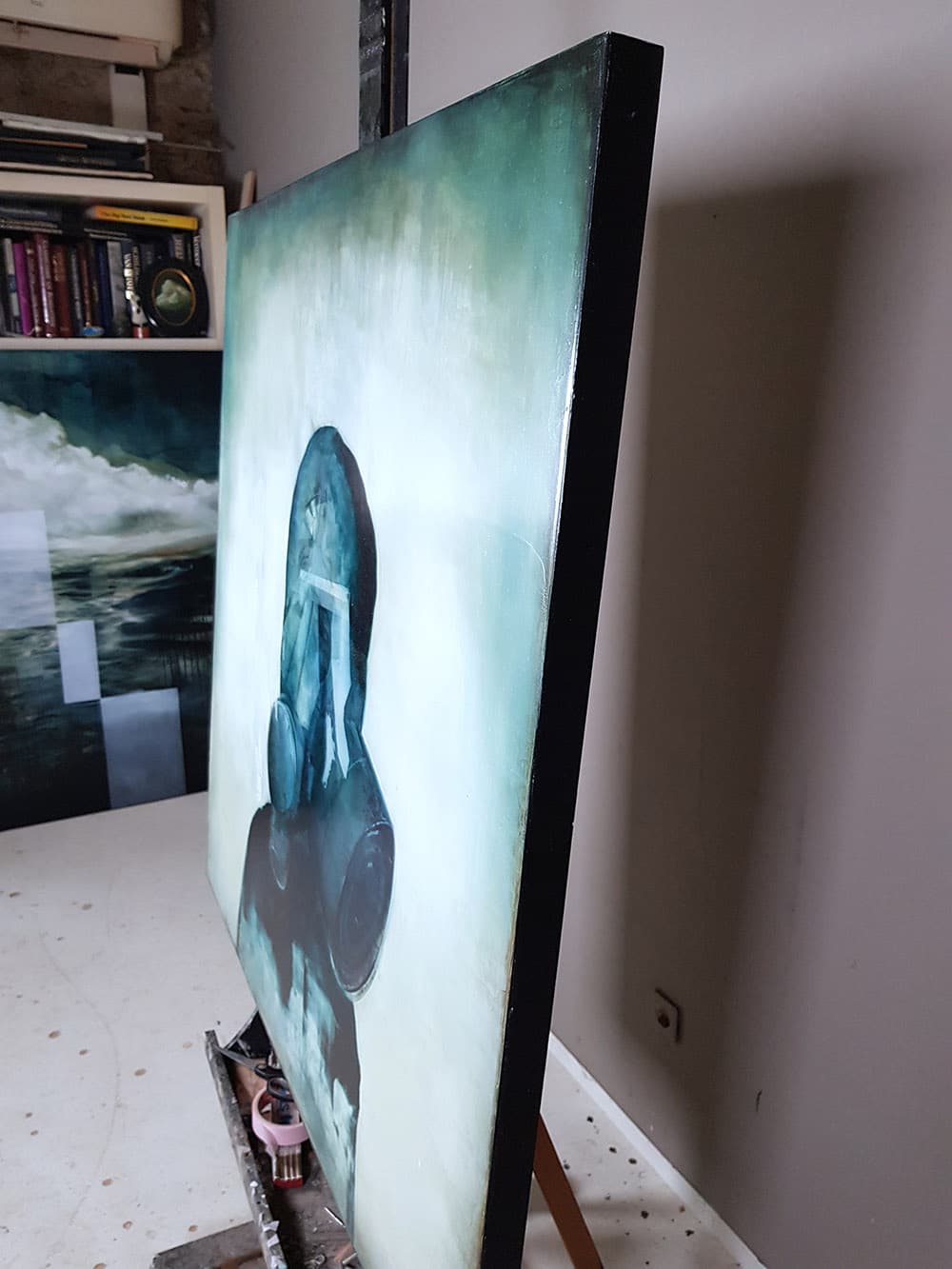 Together with a voluntarily restricted palette of colours, black and white, brown, beige and blue, the artist paints a succession of layers. He gradually brings out the nuances and intensity of light. He then integrates different shapes and geometric forms.