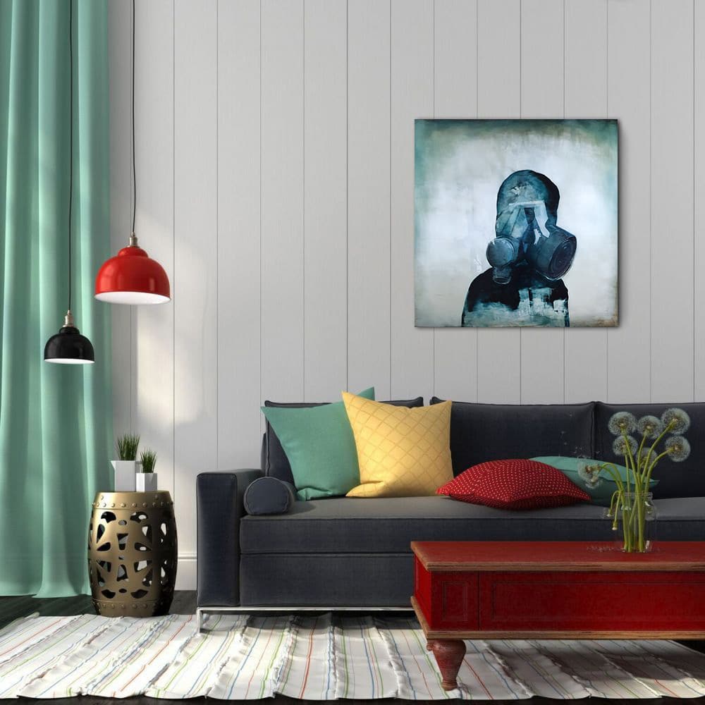 This painting on wood represents a man portrait wearing a gas mask.