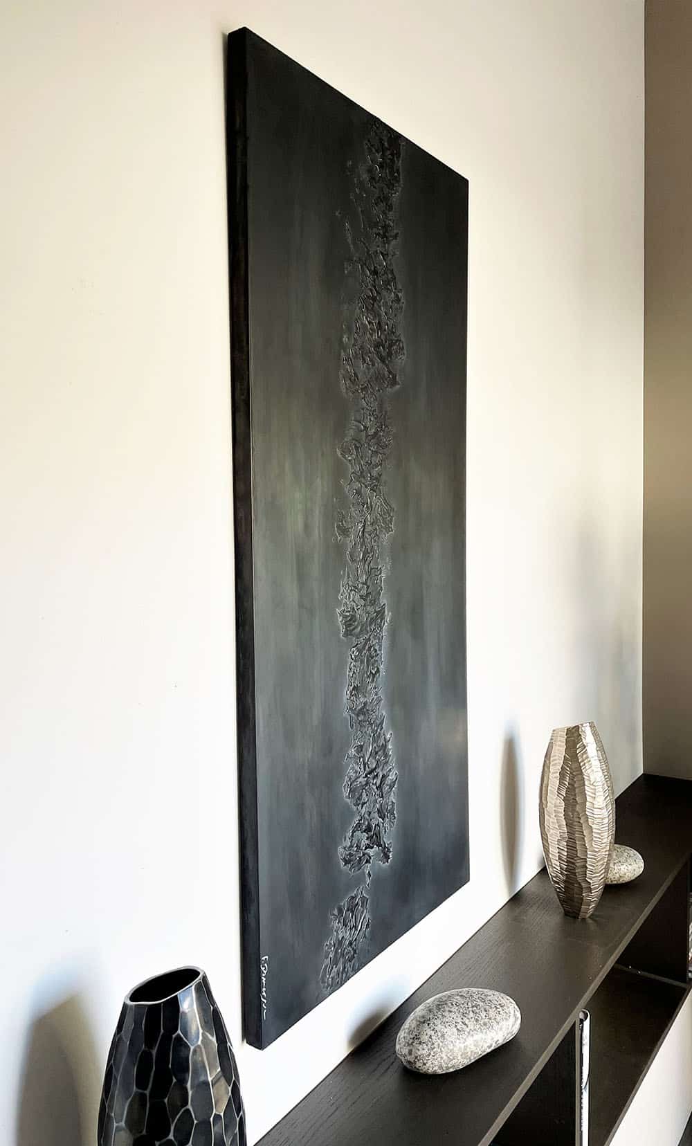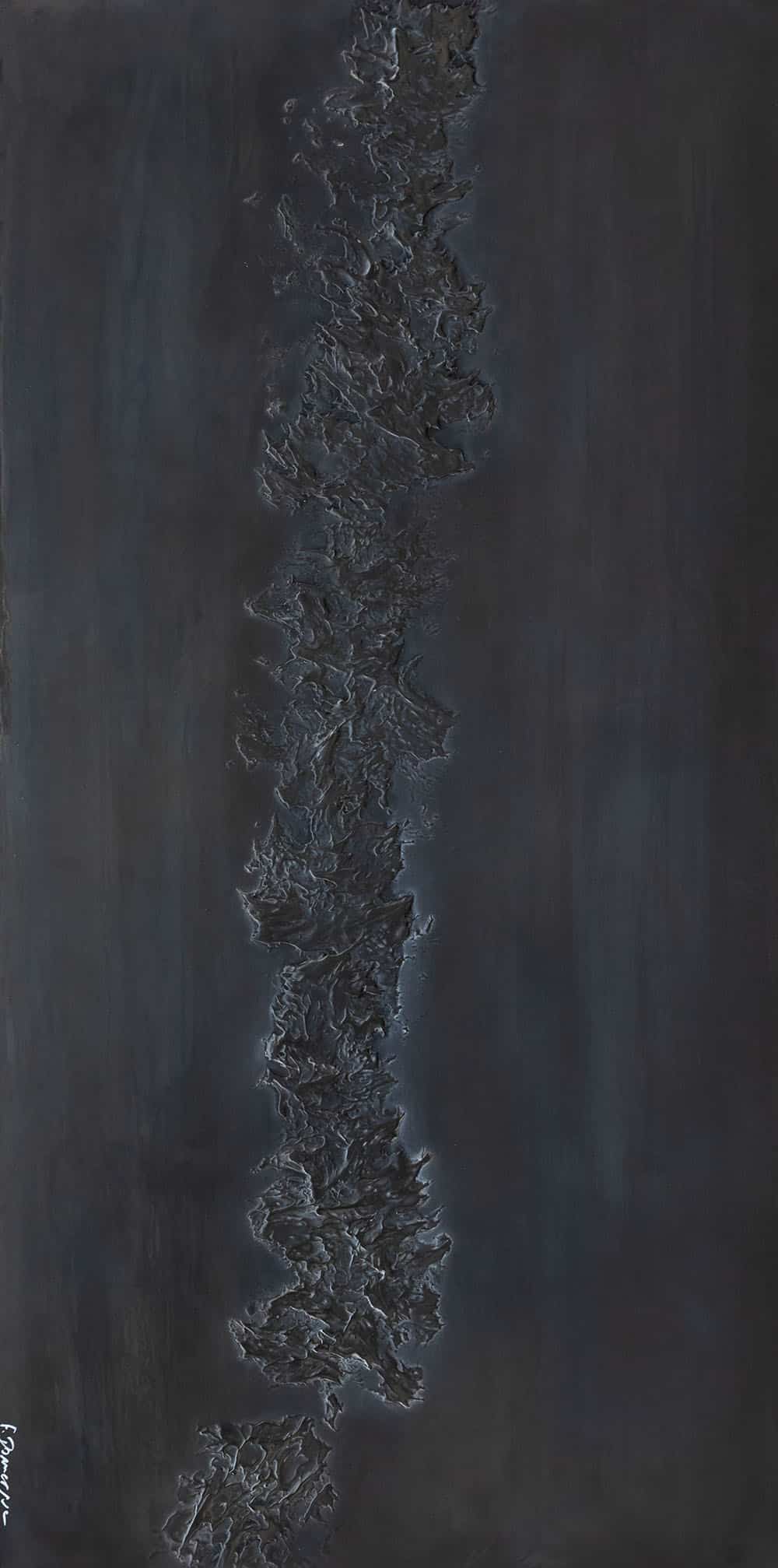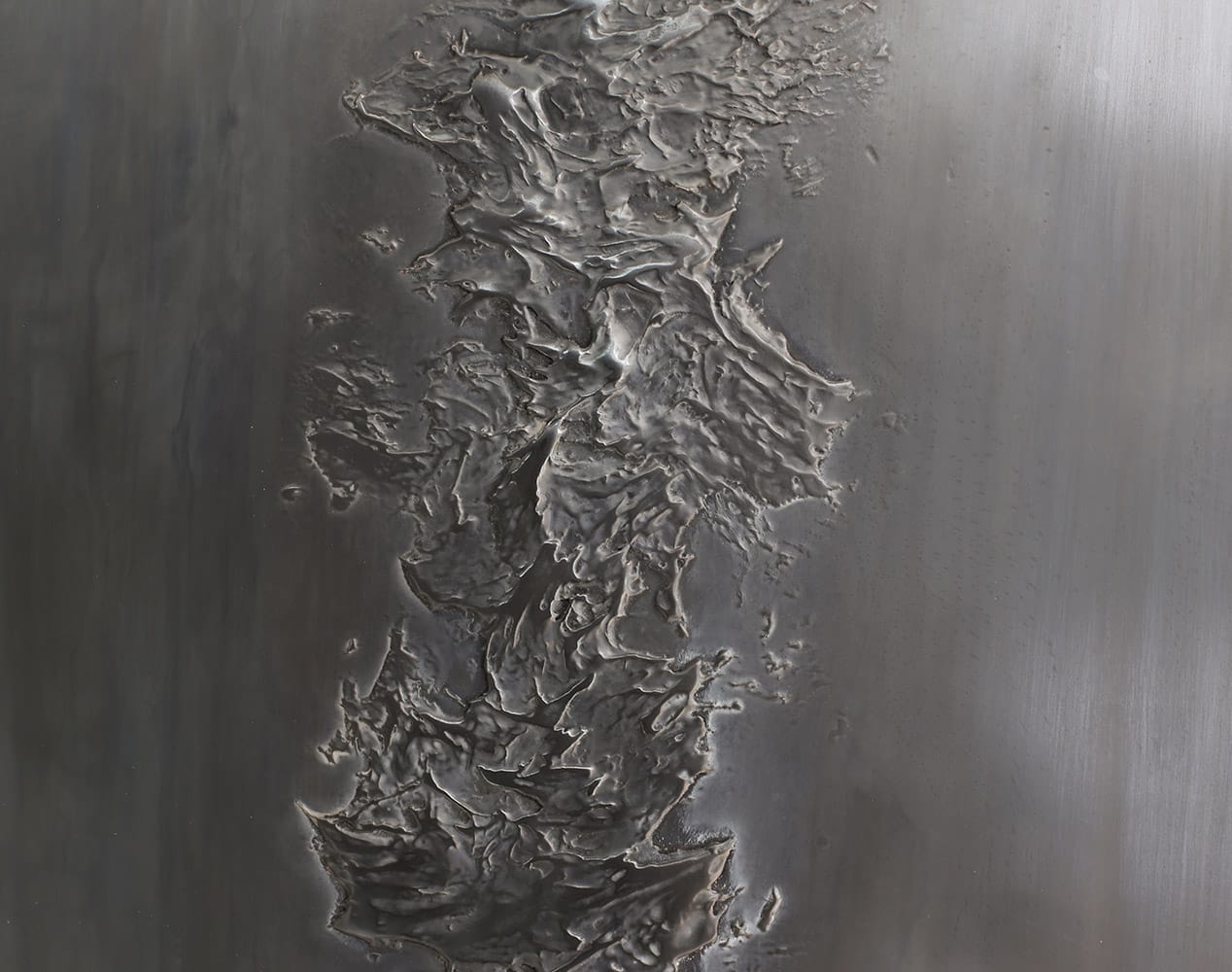 In this painting, the artist is trying out a new creative method, where she does not oxidise the metal, in this case the zinc. The aesthetic result is quite different from her other paintings: the central relief stands out very clearly from the aluminium support with dark and deep tones.