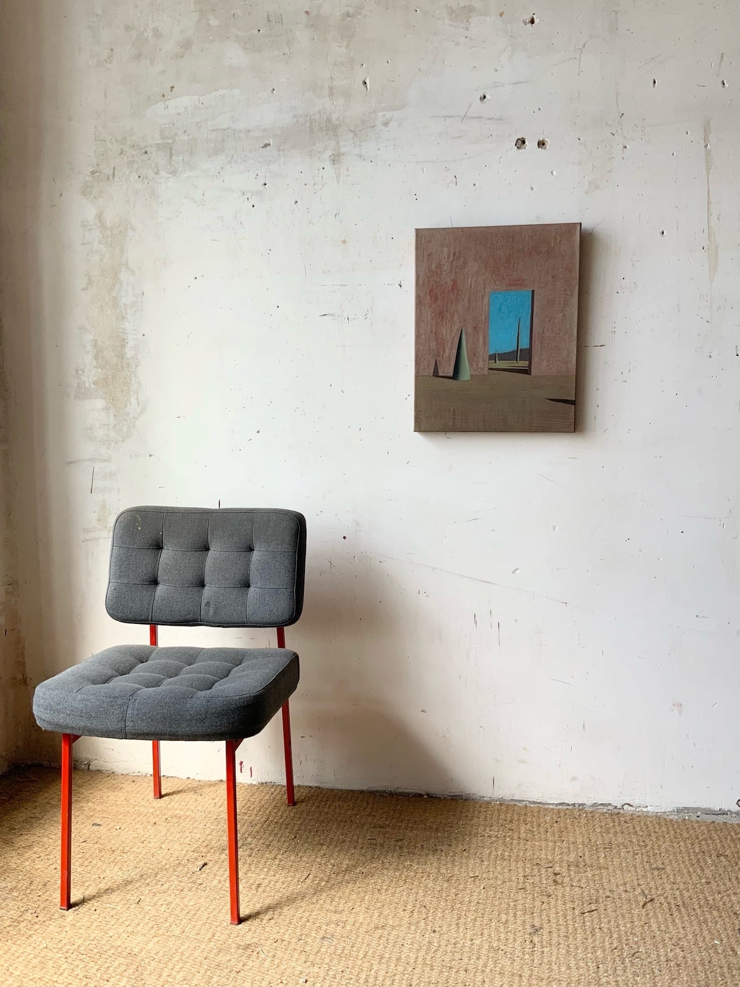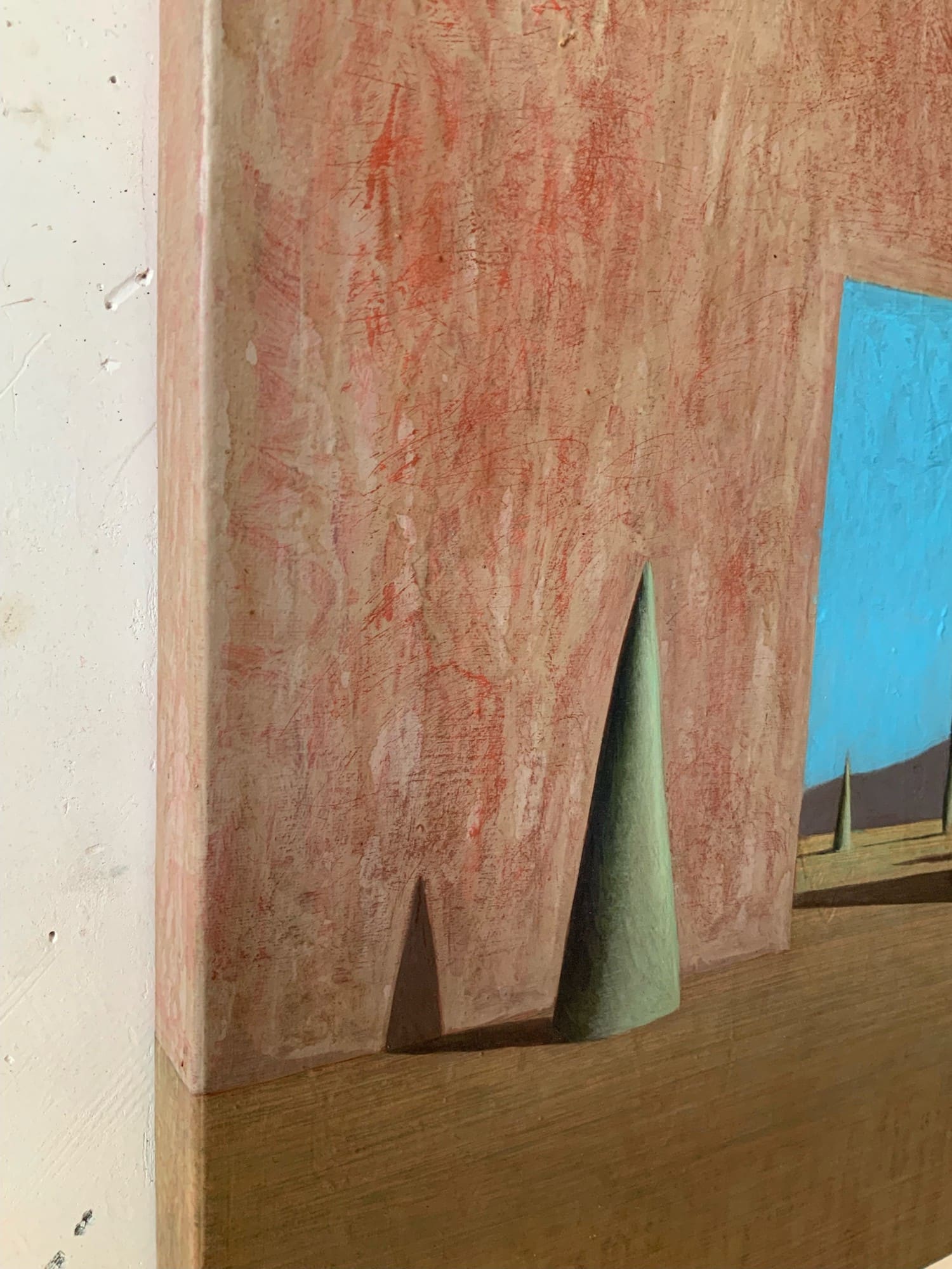 In these paintings, the artist establishes a conversation between architecture and landscape in a figurative work boasting geometric shapes and an enigmatic atmosphere. The landscapes and the simplicity of the forms (near abstract) make for a very theatrical view of architecture.