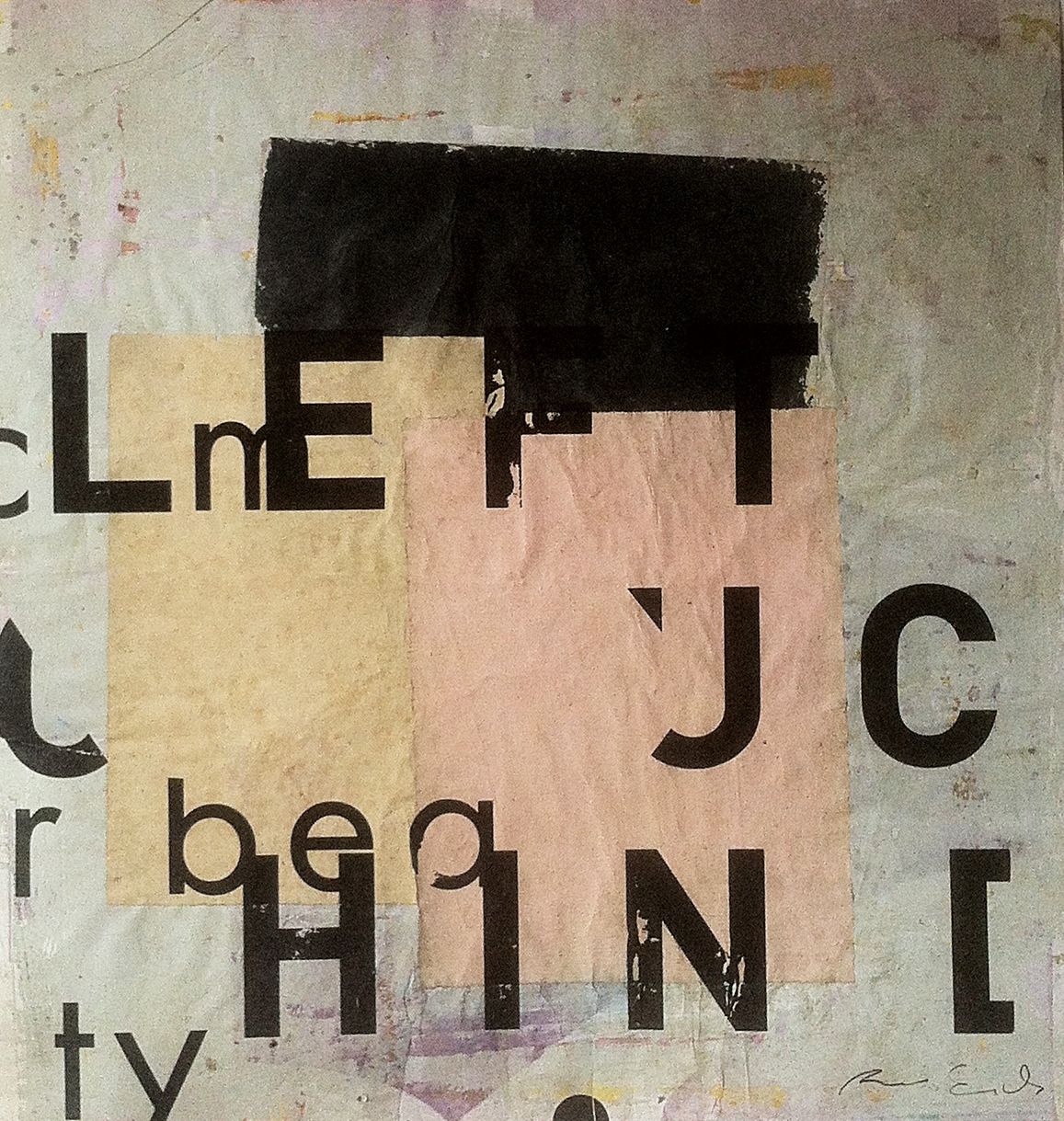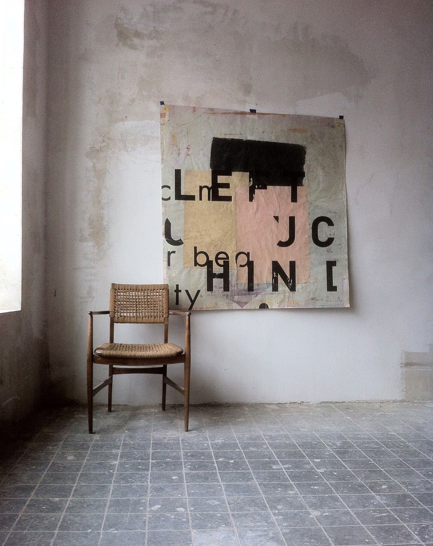 The artist composes a space by placing these typographical forms onto a support (canvas, paper, plastic support) that he has previously painted in an abstract fashion with an autonomy of colors and shapes.