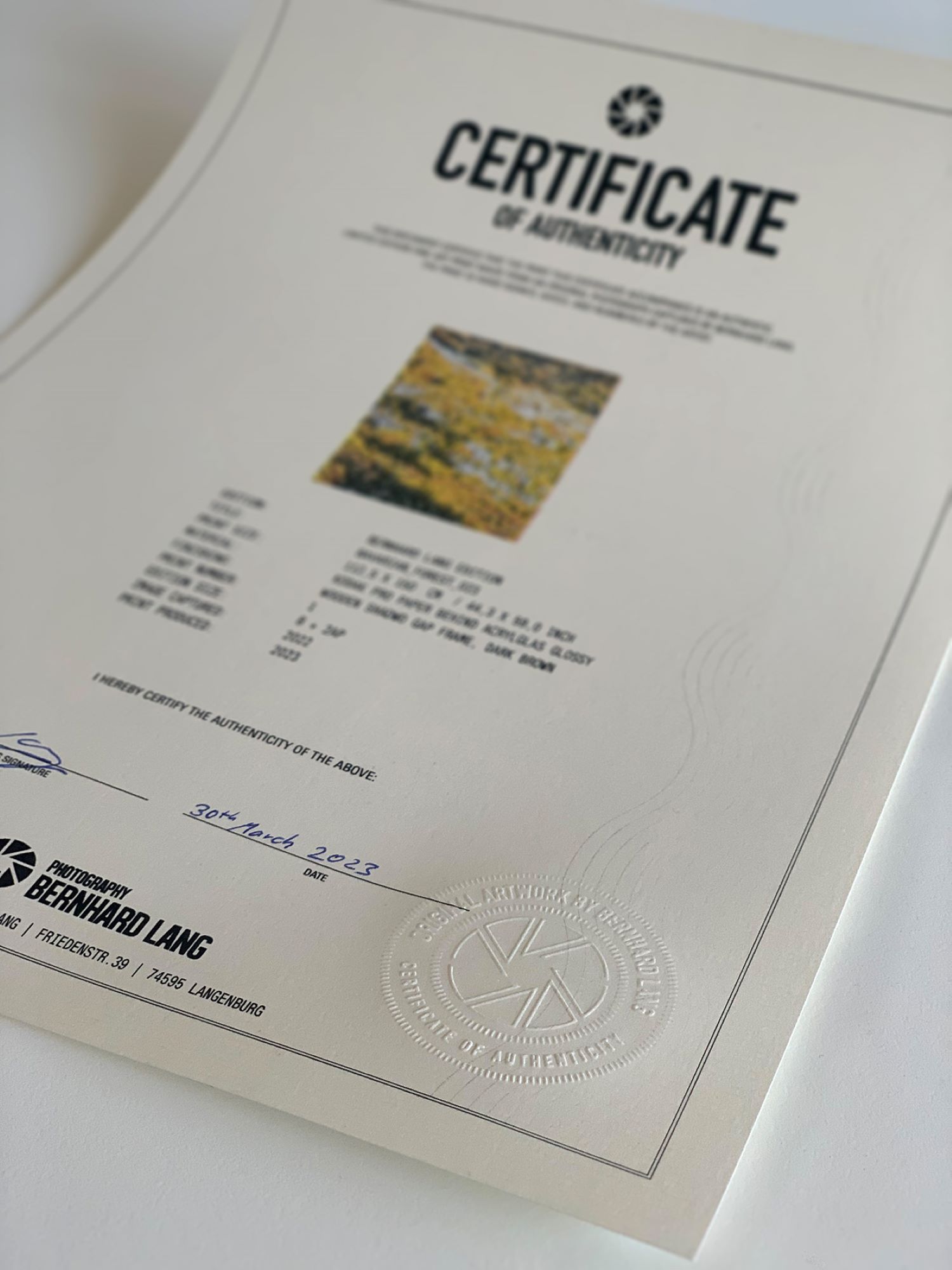 | Certificate of authenticity | The artwork is sold with a certificate of authenticity signed by the artist. |
