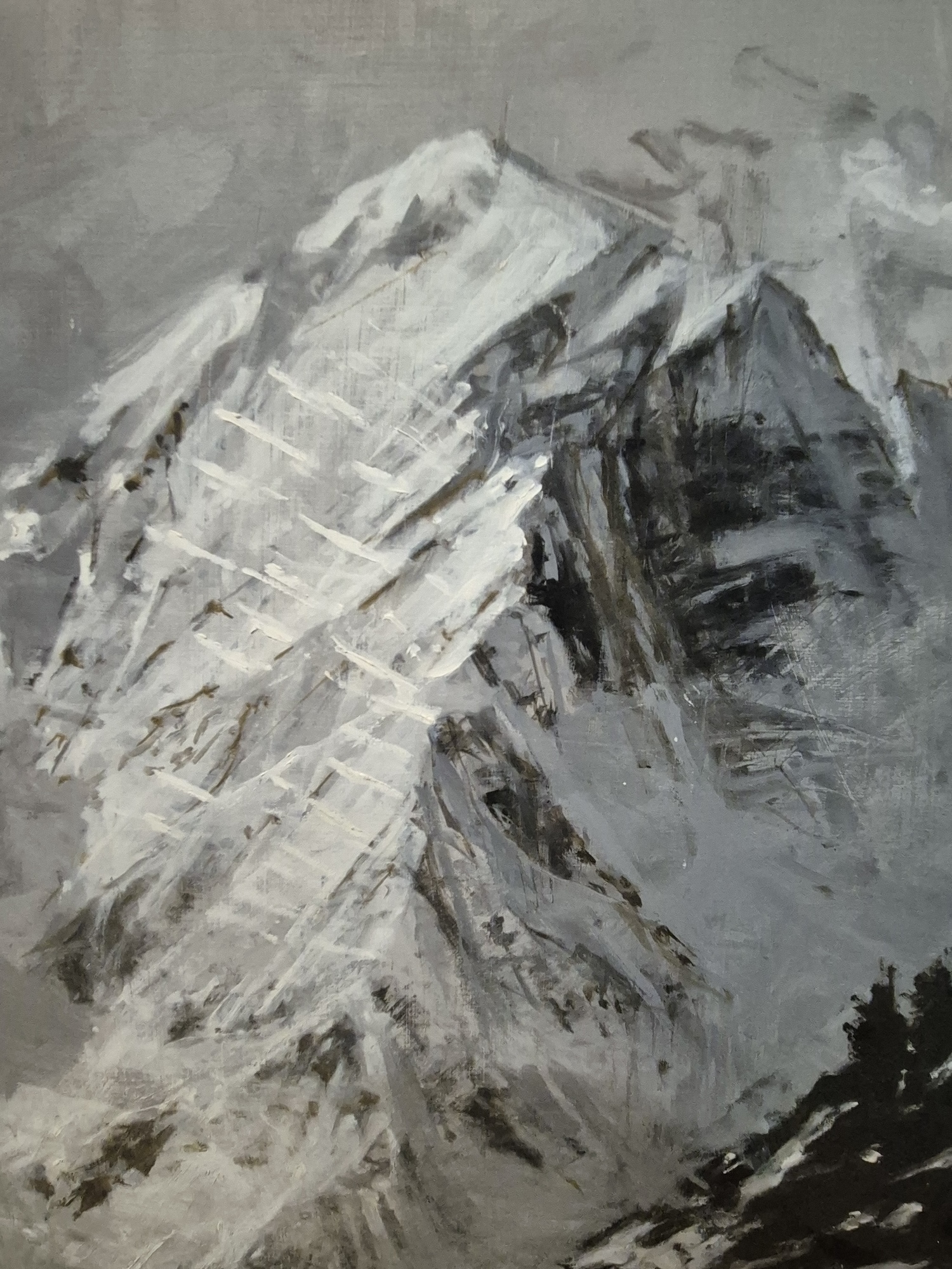 Benasque 3 bis, from the Snow collection is a painting by contemporary Spanish artist Calo Carratalá. This work of art represents a mountainous winter landscape in the Spanish Pyrenean valley of Benasque. This high mountain peak, imposing and rocky, appears to blend into the grey clouds illuminated by a gentle sunlight. This painting is an oil on canvas in which white and grey tones are dominant.