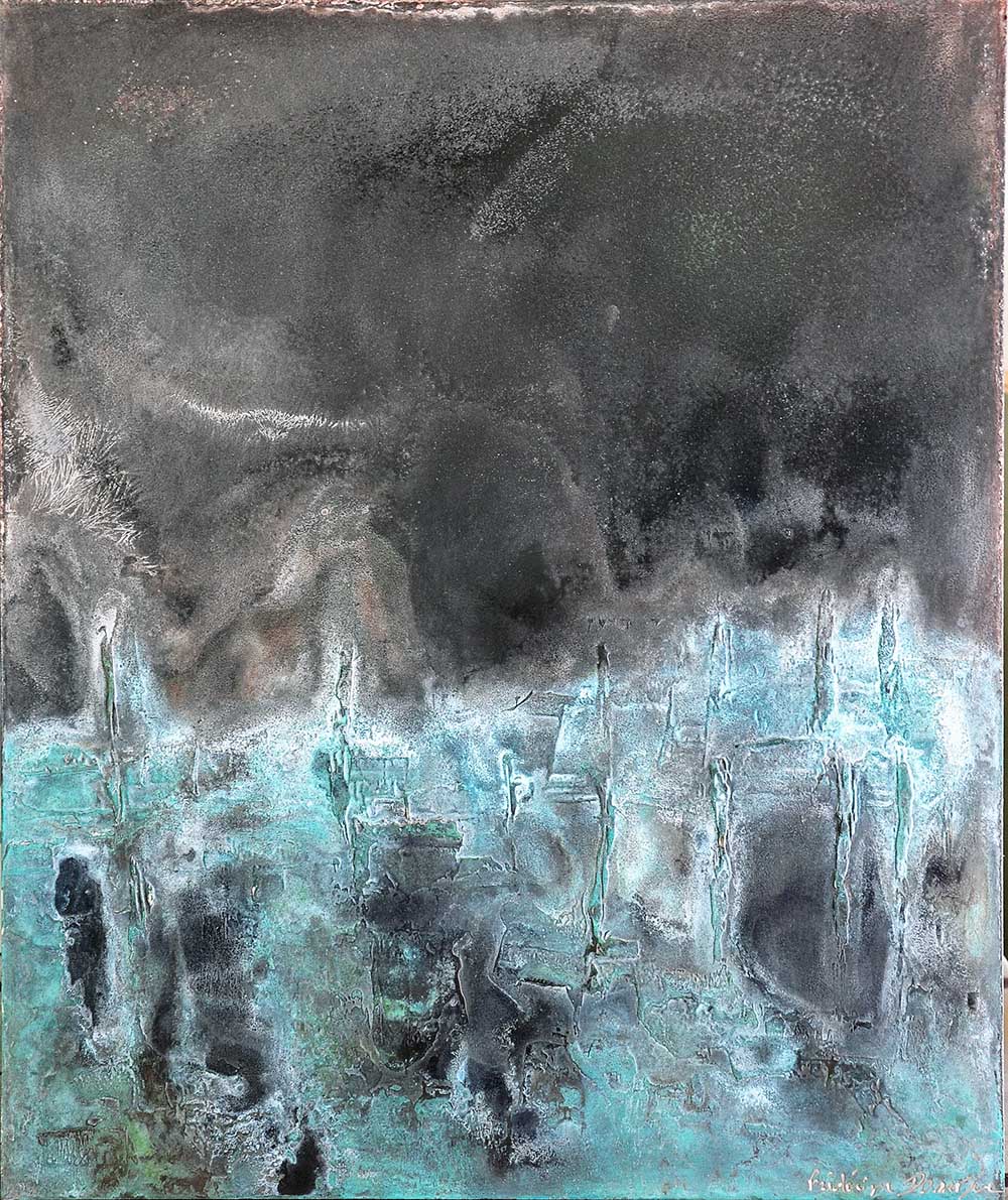 Frédérique Domergue uses thin sheets of metal applied on wood or aluminum panels. Through a patient process of polishing and oxidation the artist manages to confer a warmth and sensuality which tempts the observer to caress the oxidized surface of her paintings, now become all radiant and silky.
