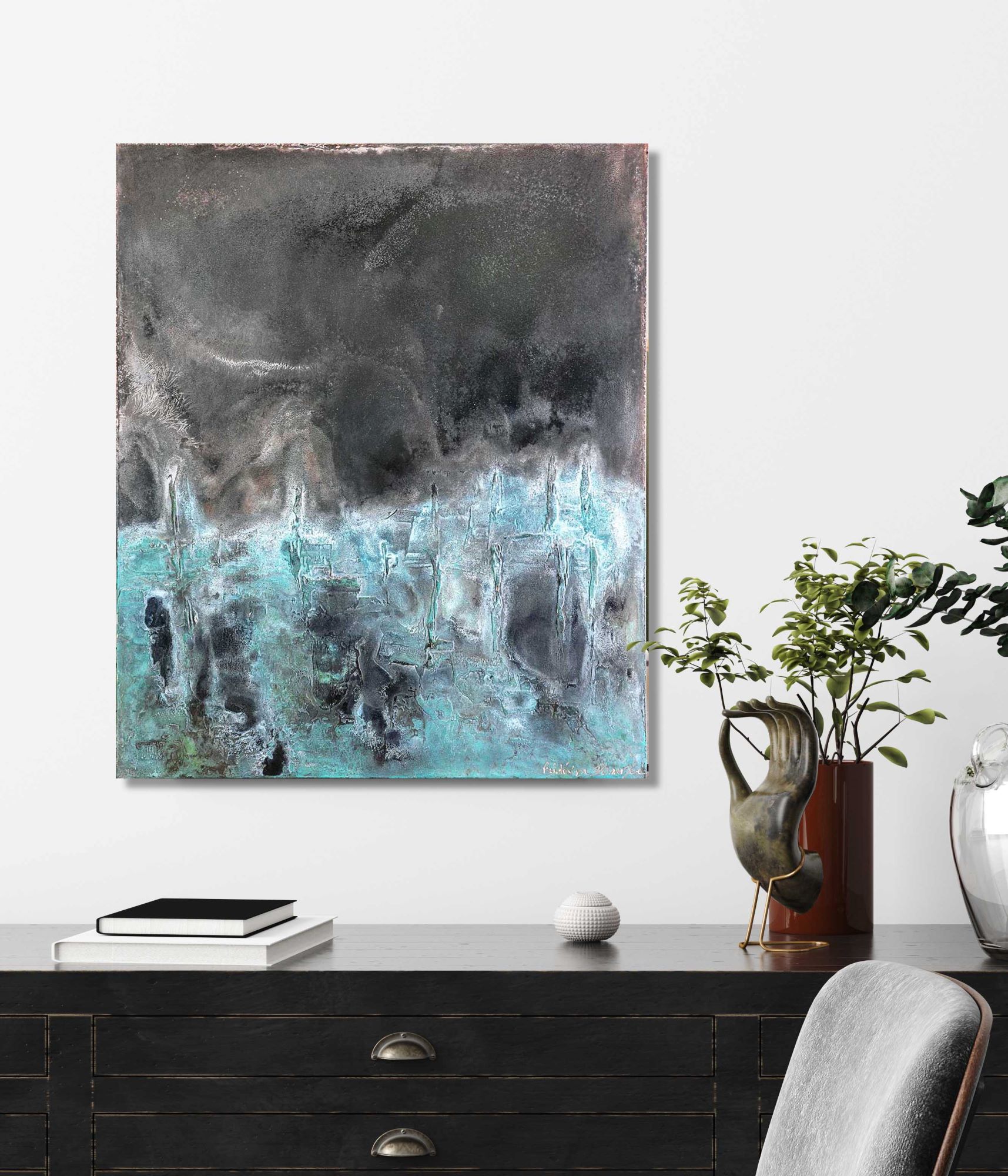 Frédérique Domergue finds her inspiration in nature and especially in the seaside. Her paintings evoke landscapes, skies and seas that are sometimes calm and tranquil, sometimes dark and turbulent. Here, the artist’s abstract piece could be of a turquoise wave breaking under a dark sky.