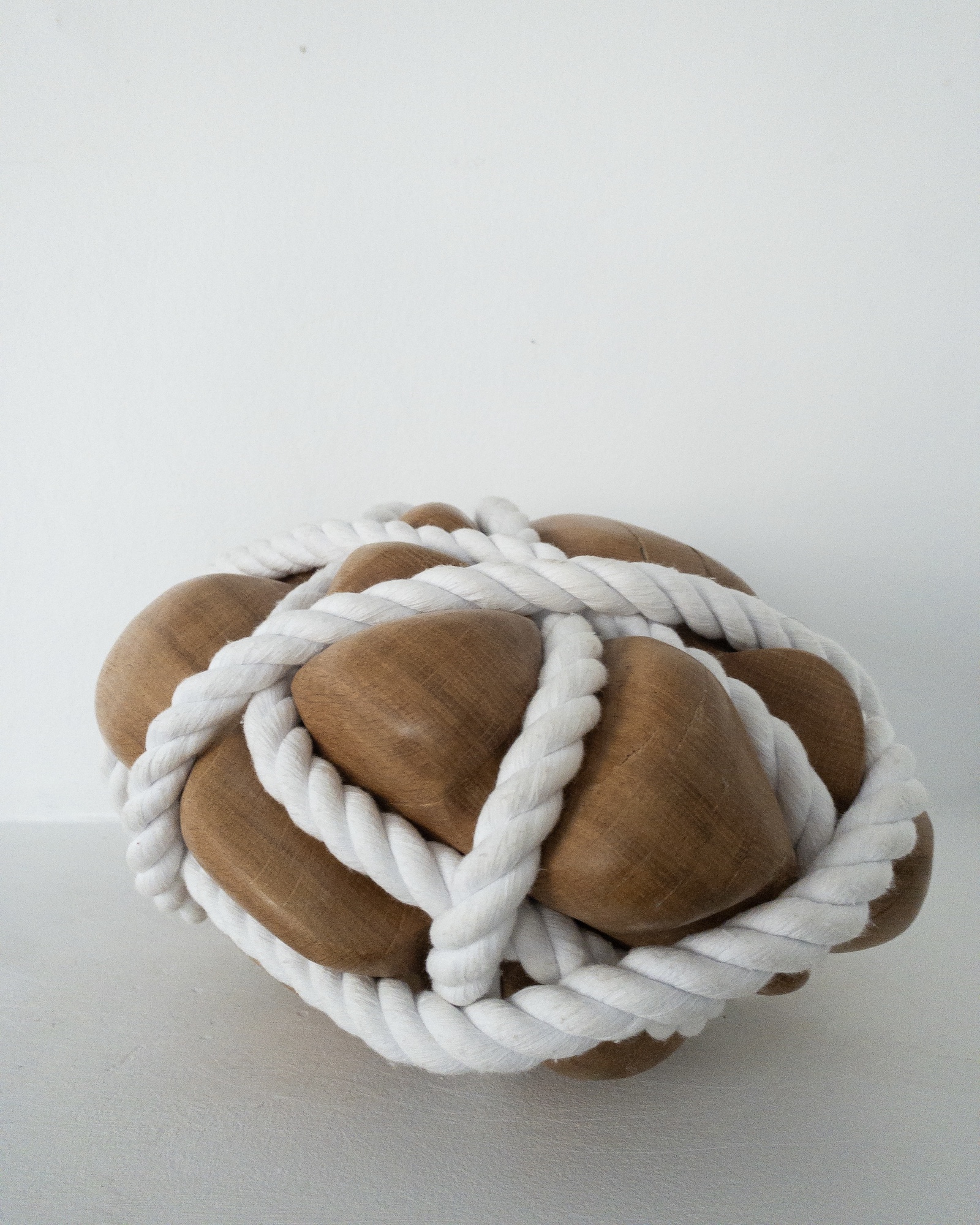 In this work, the artist initiates a visual dialogue between two materials that are very different in their appearance and characteristics. Rope, as if containing the strong pressure exerted by a piece of wood that has become dynamic, transforms the latter into a material that is both supple and malleable, bringing its hardness into question. This alliance is both striking and curious: is it the rope pressing on the wood, or the wood pressing on the rope?