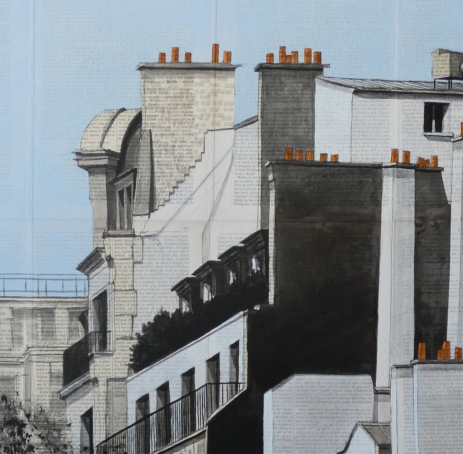 Megacities are the artist’s favorite subject. Through his paintings, Guillaume Chansarel attempts to capture the city’s graphic identity, as a photographer would press the shutter button on his camera. The uniqueness of the artist’s work lies in the realistic aspect of his work but also on the original use of an innovative support: pages of print from antique books onto which he draws and then paints, and consequently which tells a completely new story.