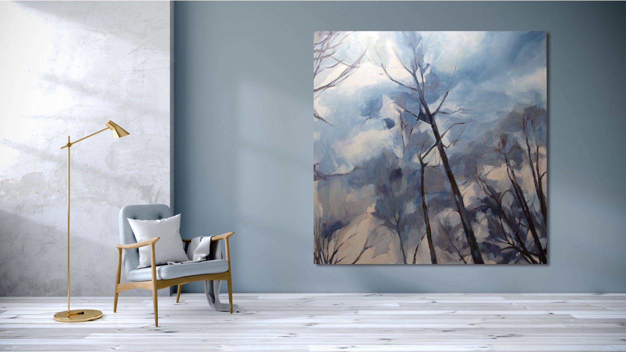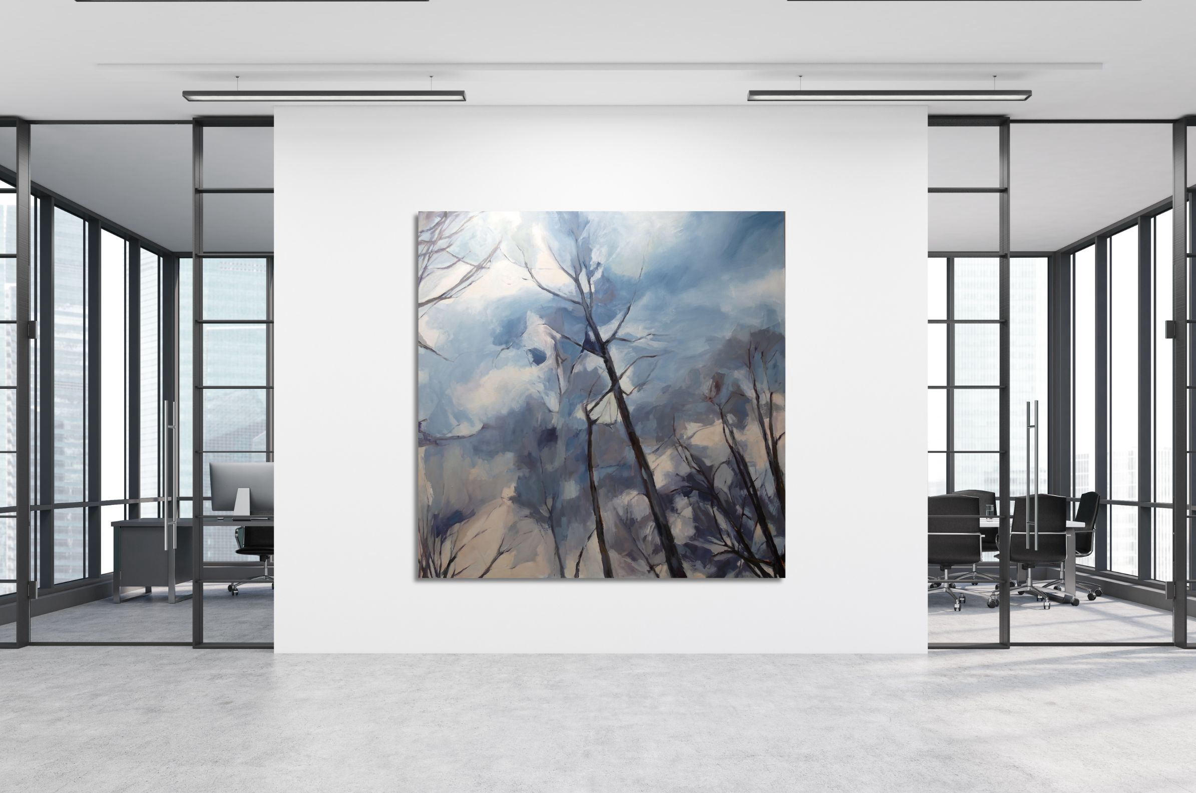 Ramures is a work by the artist Valerie de Sarrieu. This oil painting is part of the “Branches” series. This painting depicts trees seen from a low angle, standing out against a cold, bright blue-gray sky.