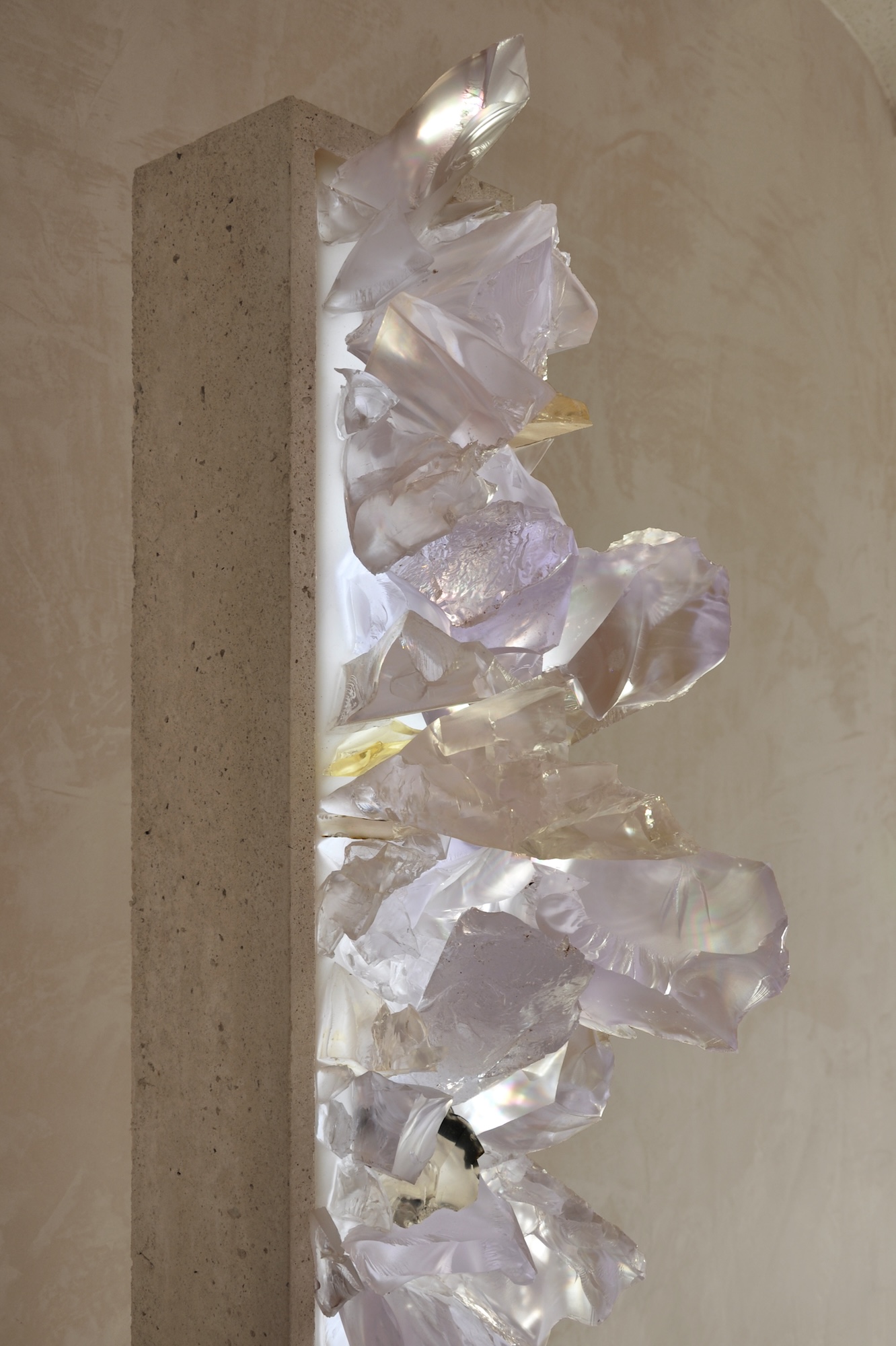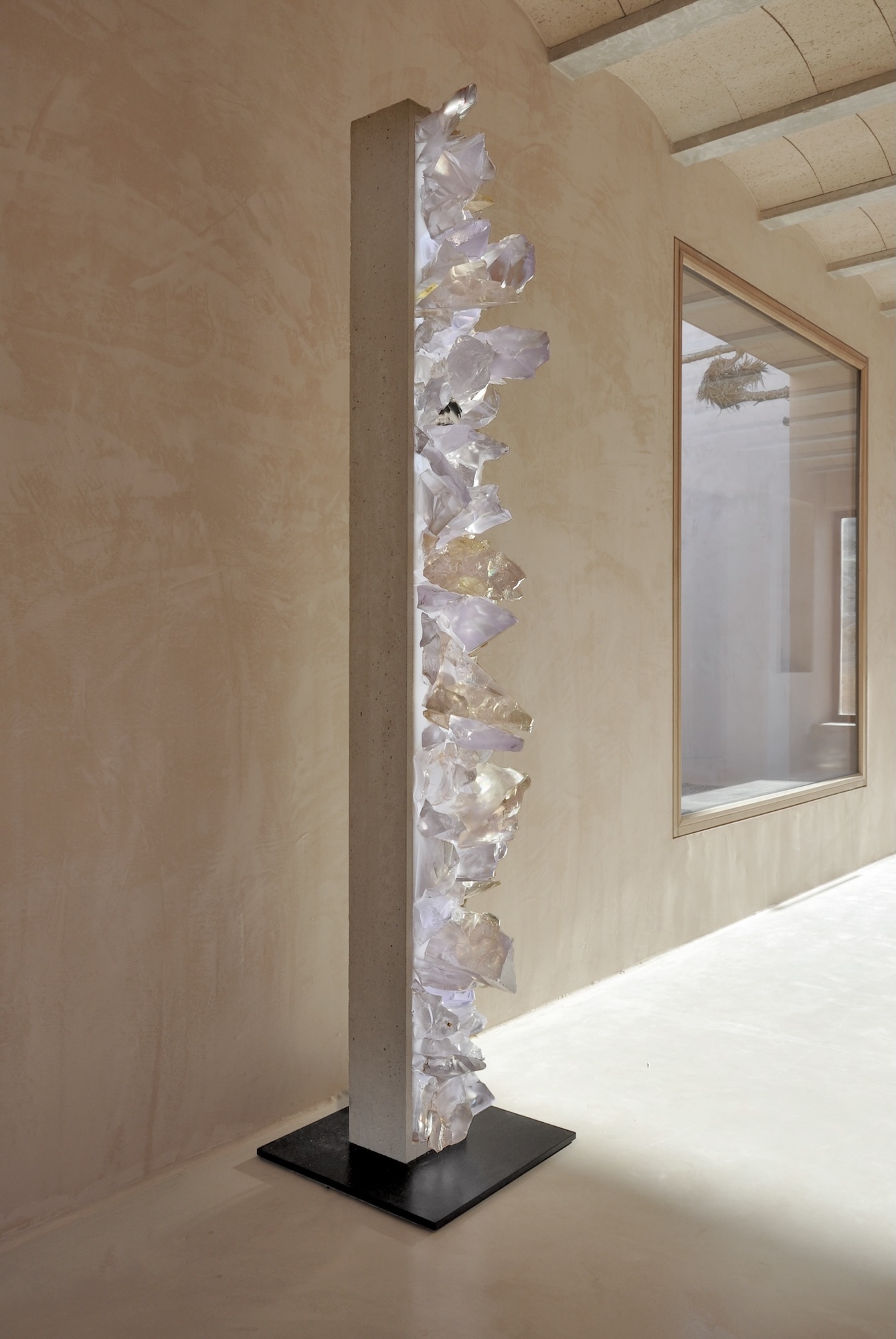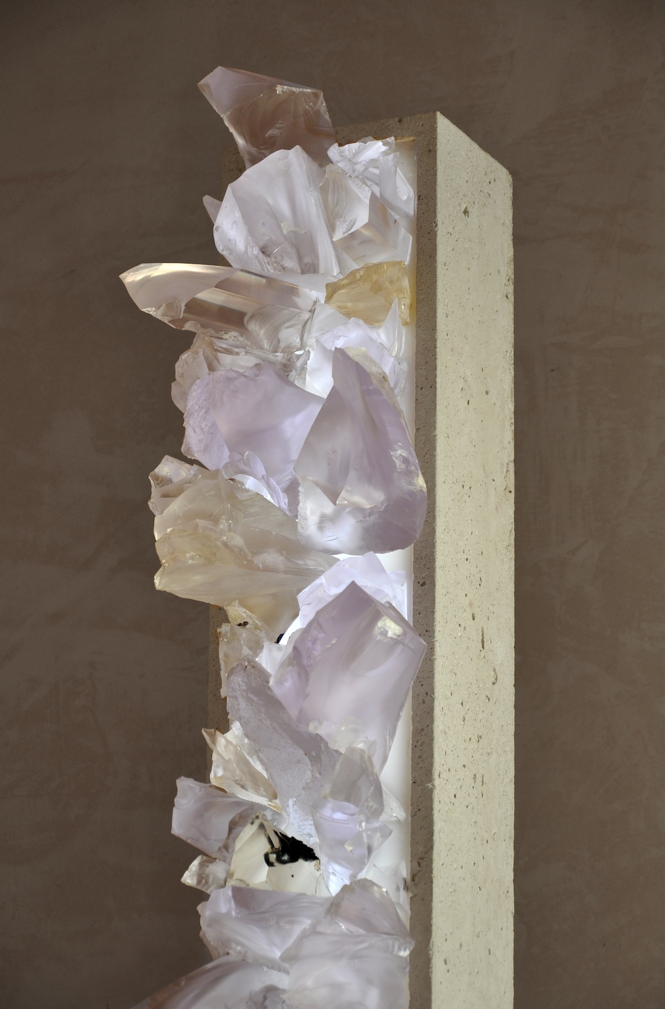 The artist uses a stark, contemporary column constructed from concrete as a host for a synthetic growth, an eruption of meticulously crafted mineral-like formations mainly composed of resin. These crystalline forms, with their translucent, lavender and amber hues, mimic the organic geometry of geodes or natural rock formations, and can be illuminated by LED light. Breach evokes a powerful reflection on the Anthropocene, the current geological epoch defined by humanity’s dominant impact on Earth’s geology and ecosystems. Price speculates on a future where synthetic materials, the residues of human industry — have been absorbed and transformed by nature, becoming indistinguishable from genuine geological deposits.