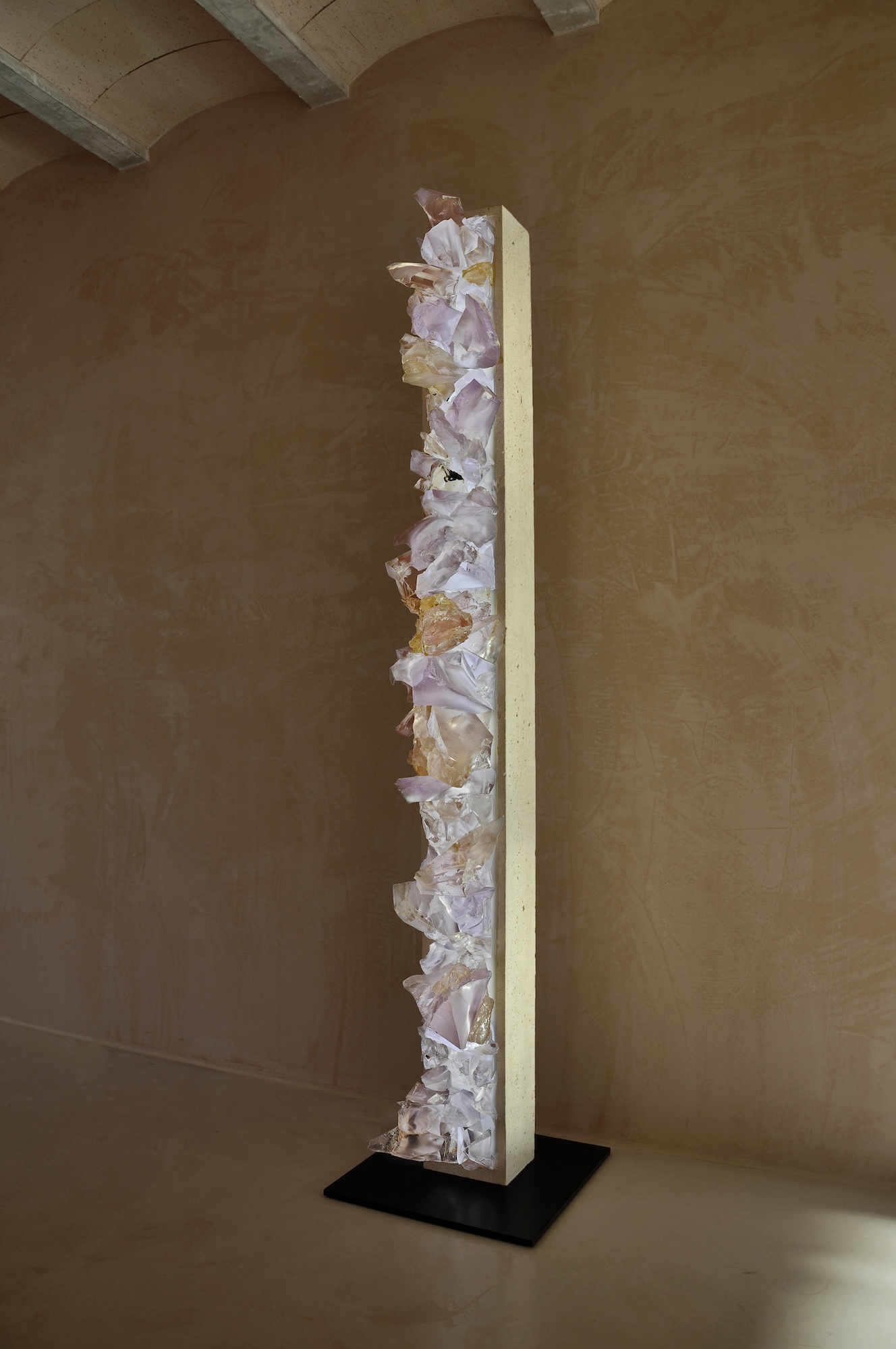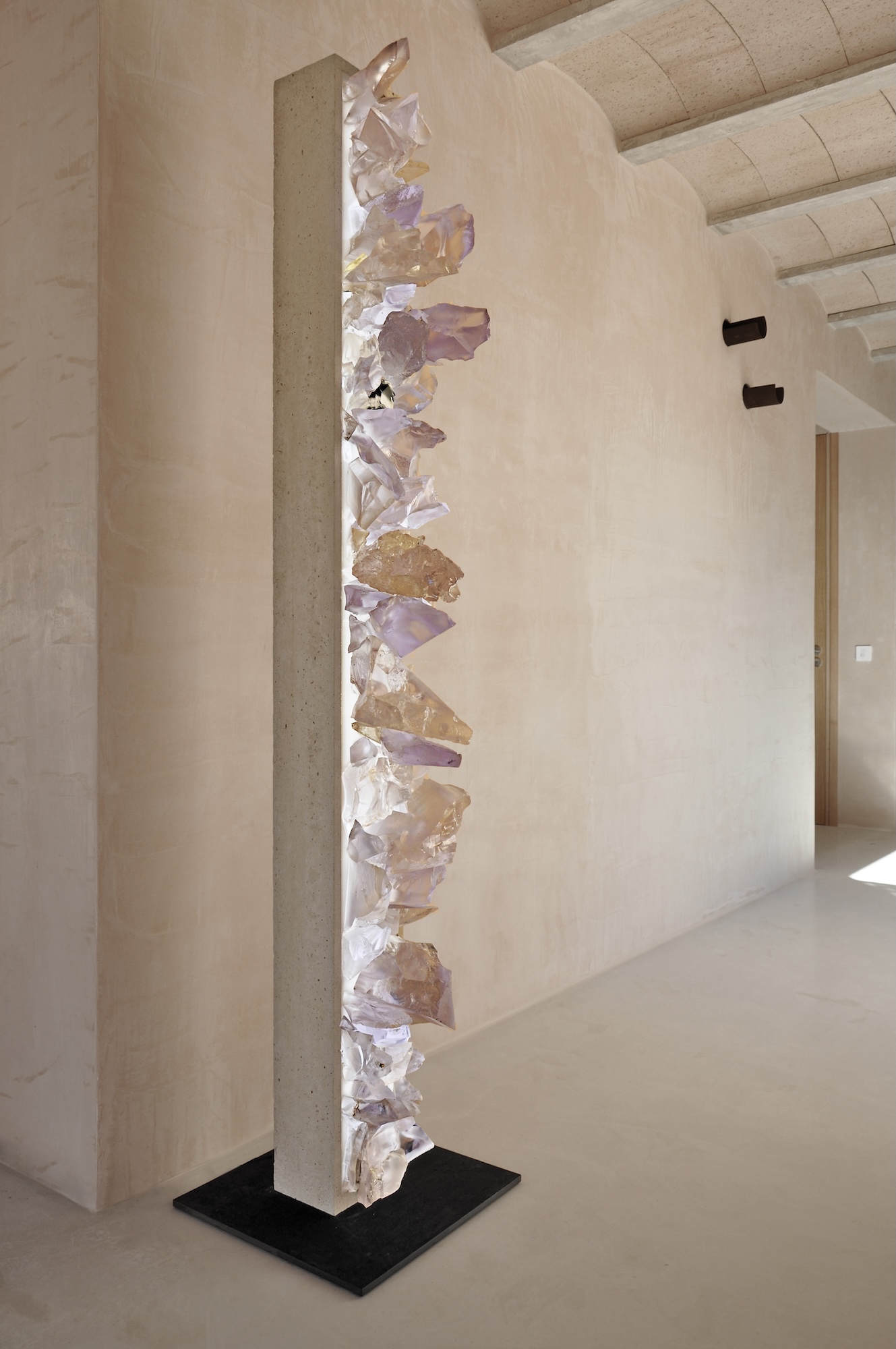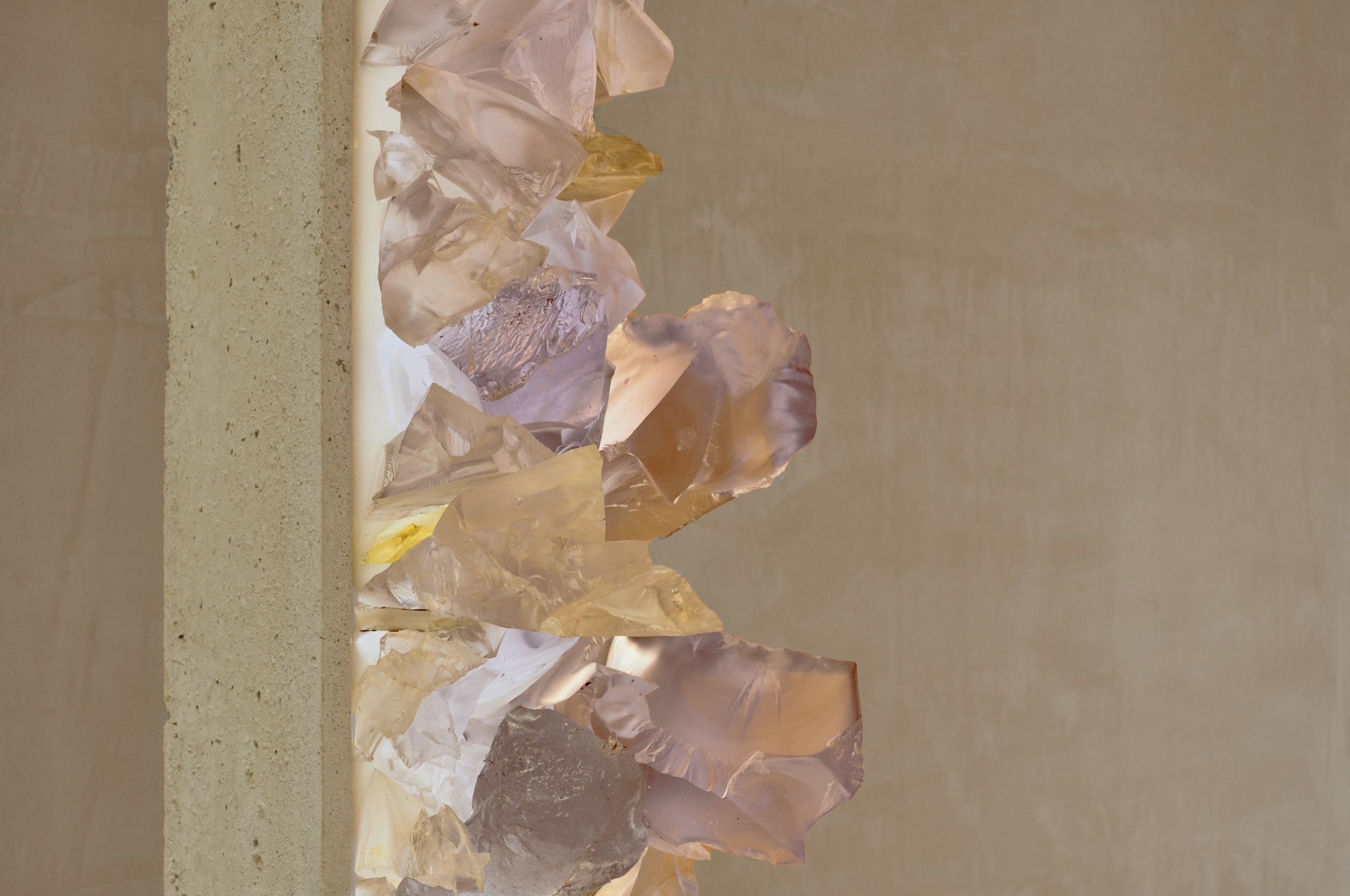 The artist uses a stark, contemporary column constructed from concrete as a host for a synthetic growth, an eruption of meticulously crafted mineral-like formations mainly composed of resin. These crystalline forms, with their translucent, lavender and amber hues, mimic the organic geometry of geodes or natural rock formations, and can be illuminated by LED light. Breach evokes a powerful reflection on the Anthropocene, the current geological epoch defined by humanity’s dominant impact on Earth’s geology and ecosystems. Price speculates on a future where synthetic materials, the residues of human industry — have been absorbed and transformed by nature, becoming indistinguishable from genuine geological deposits.