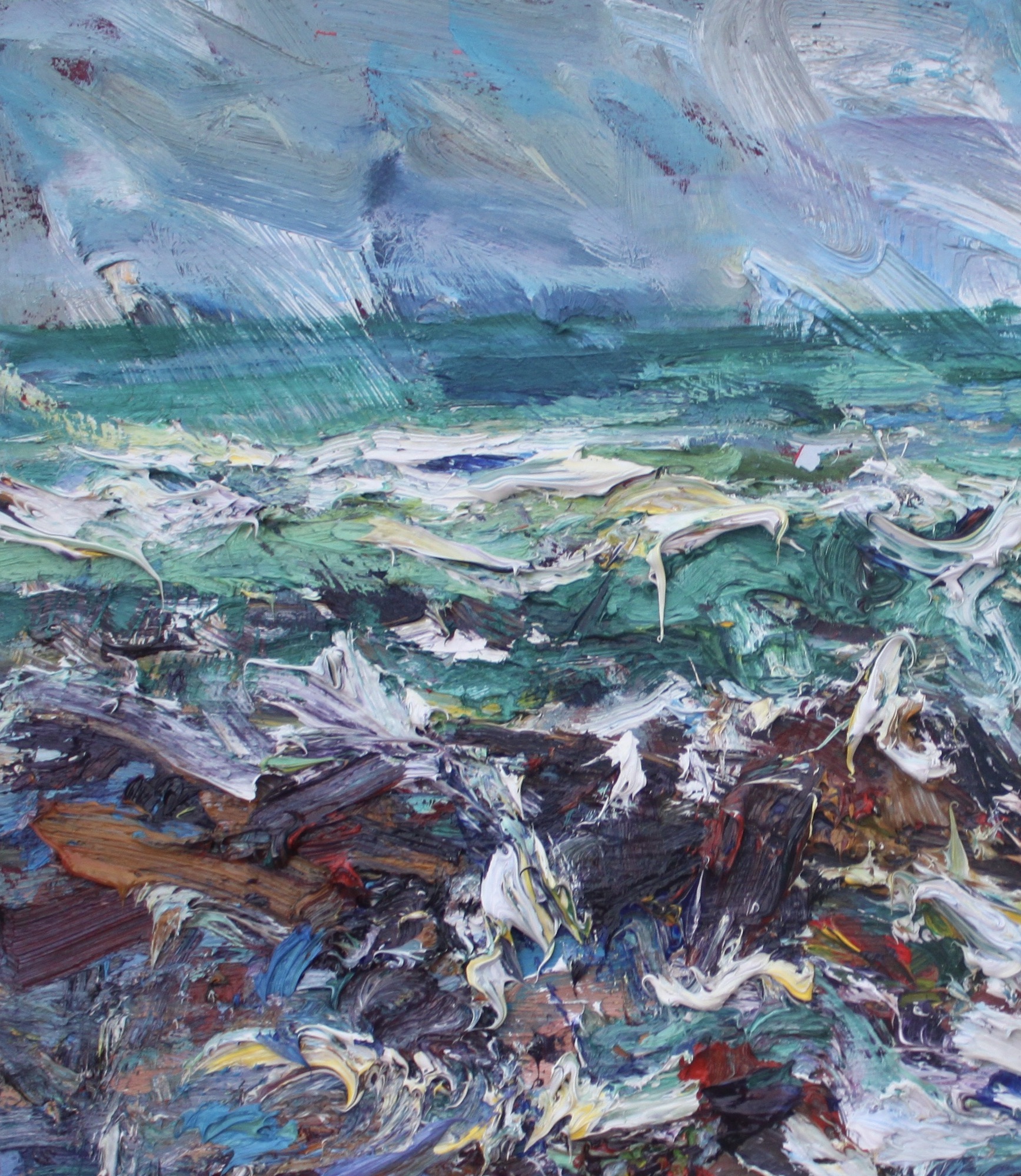 Breakers on Shandwick Beach is a landscape painting by contemporary Scottish artist Jonathan Shearer. It depicts the sea view from Shandwick Beach, a long, sandy beach with golden sands in the Scottish Highlands. The artwork is sold framed (grey box float frame). Dimensions of the framed artwork: 45 x 55 cm.