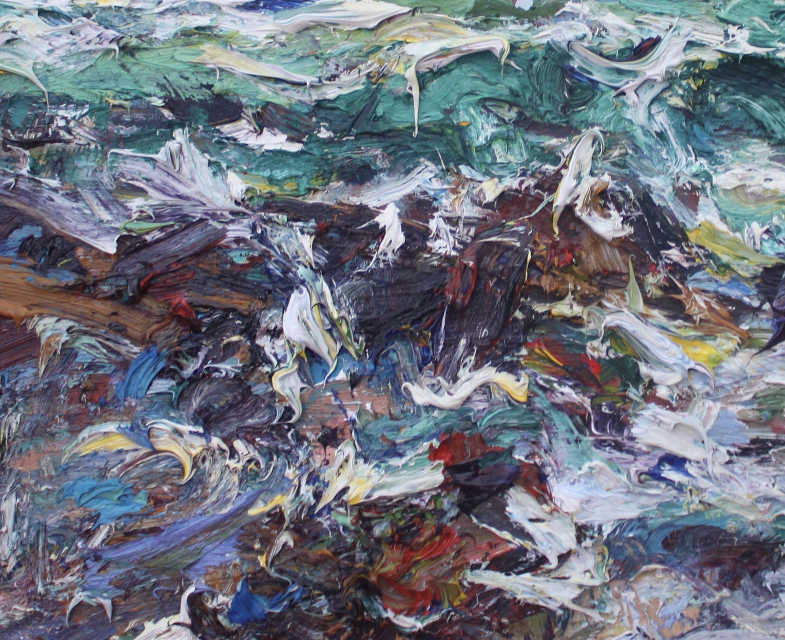 Before painting, Jonathan Shearer totally immerges himself in the wild landscapes and establishes a connection by extensively walking through them, by contemplating them and by visiting them multiple times. On site he draws small oil sketches and takes digital photographs, which he uses as a reference for the final artworks that he paints later at the studio. His way of painting at the studio is strongly gestural and vigorous, causing sometimes the paint to run and drip on the surface.