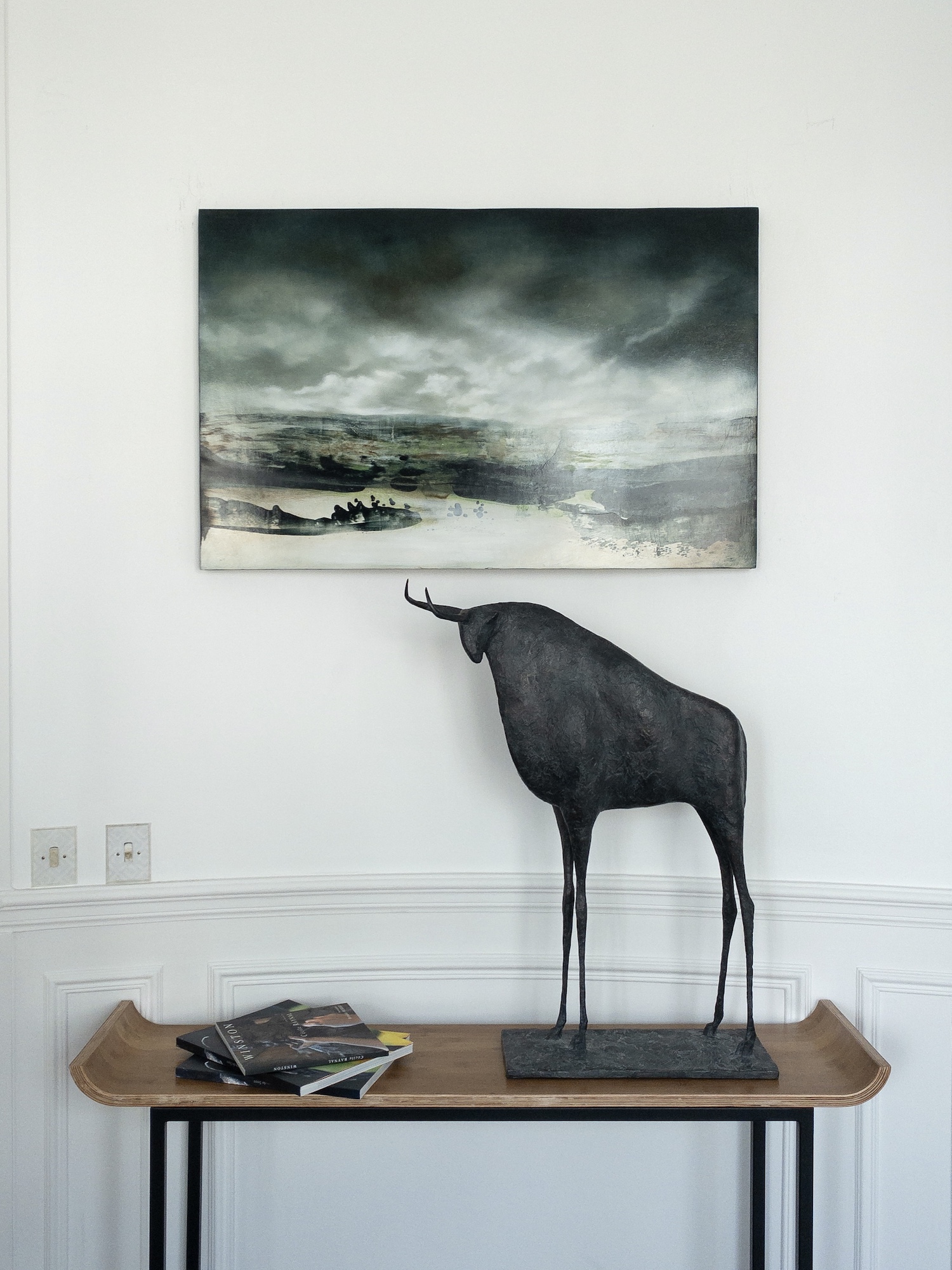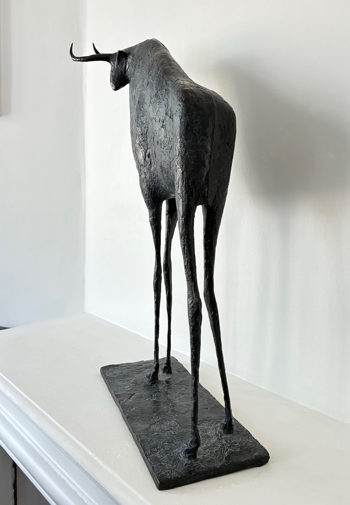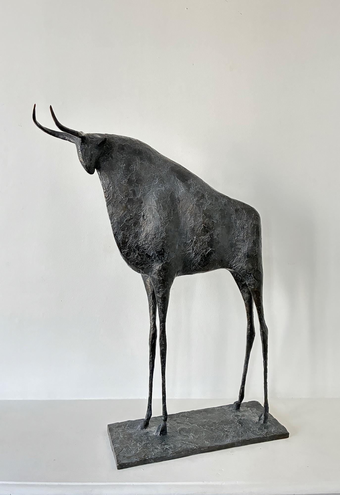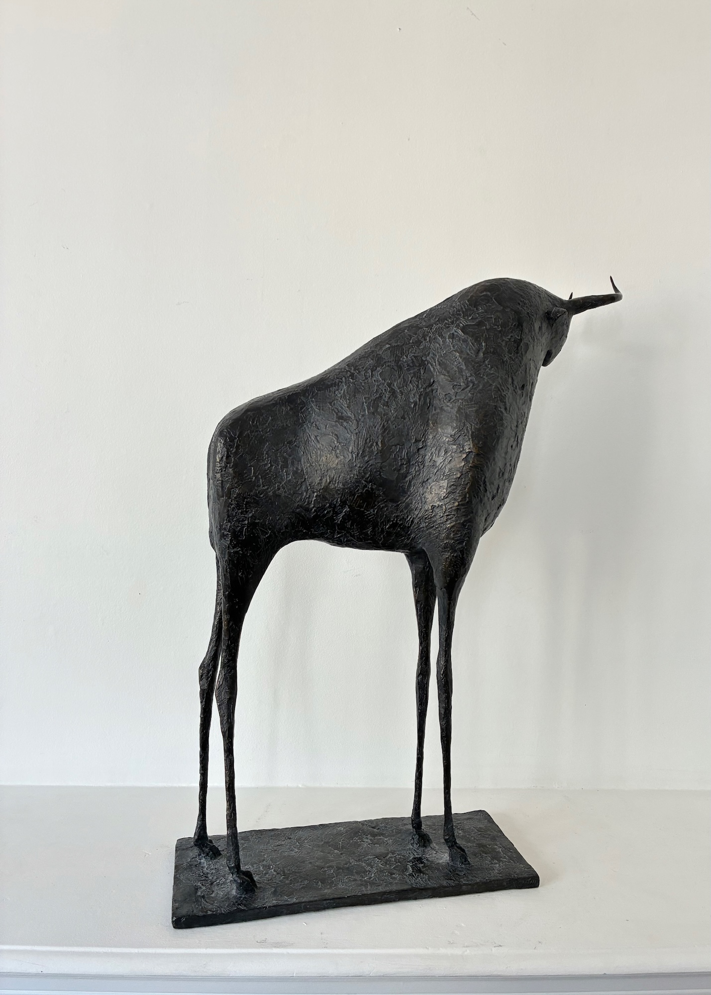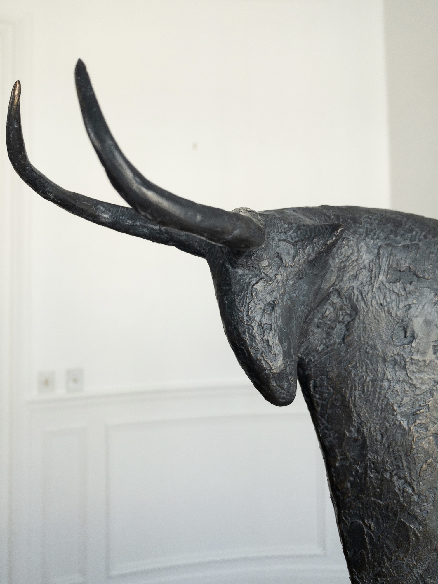 “The Bull is the only male animal in my bestiary. Its silent and serenity comes from its massive torso, supported on long legs accentuating its fragile balance. Its small head is crowned with long horns that evokes neither violence nor aggressiveness. All the energy of the animal is contained in the tension of the volumes. It symbolizes in my view nature’s protective force.”