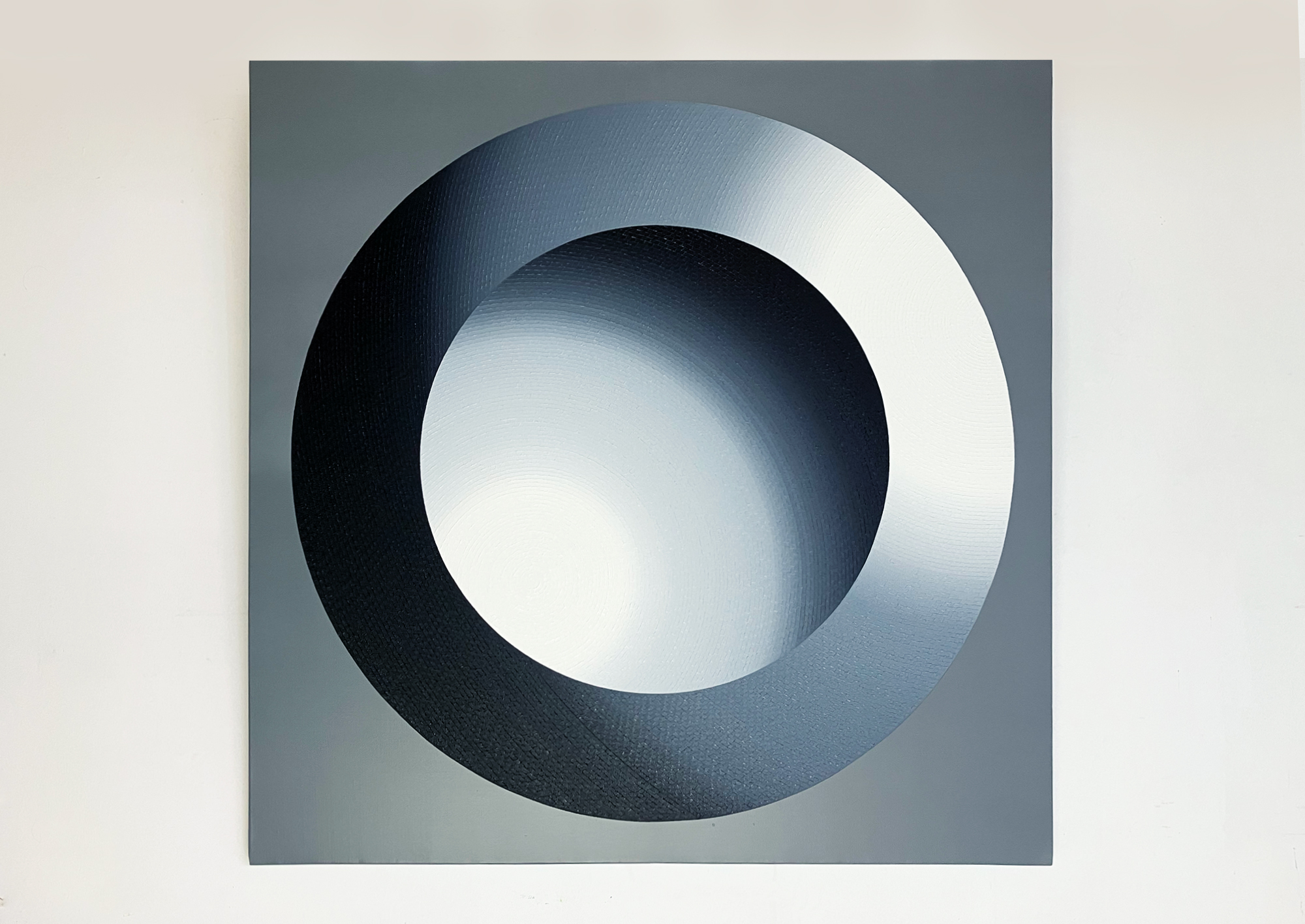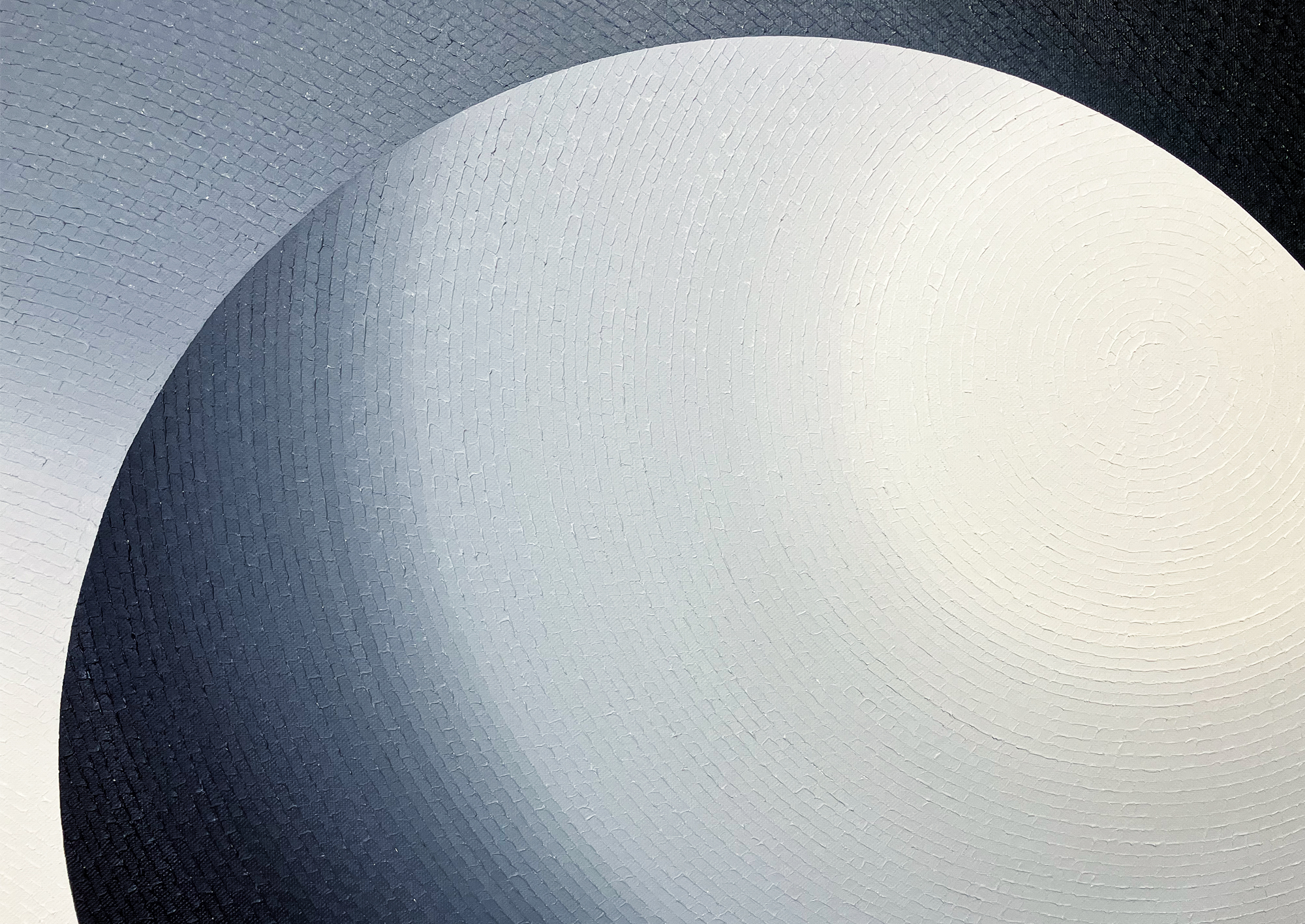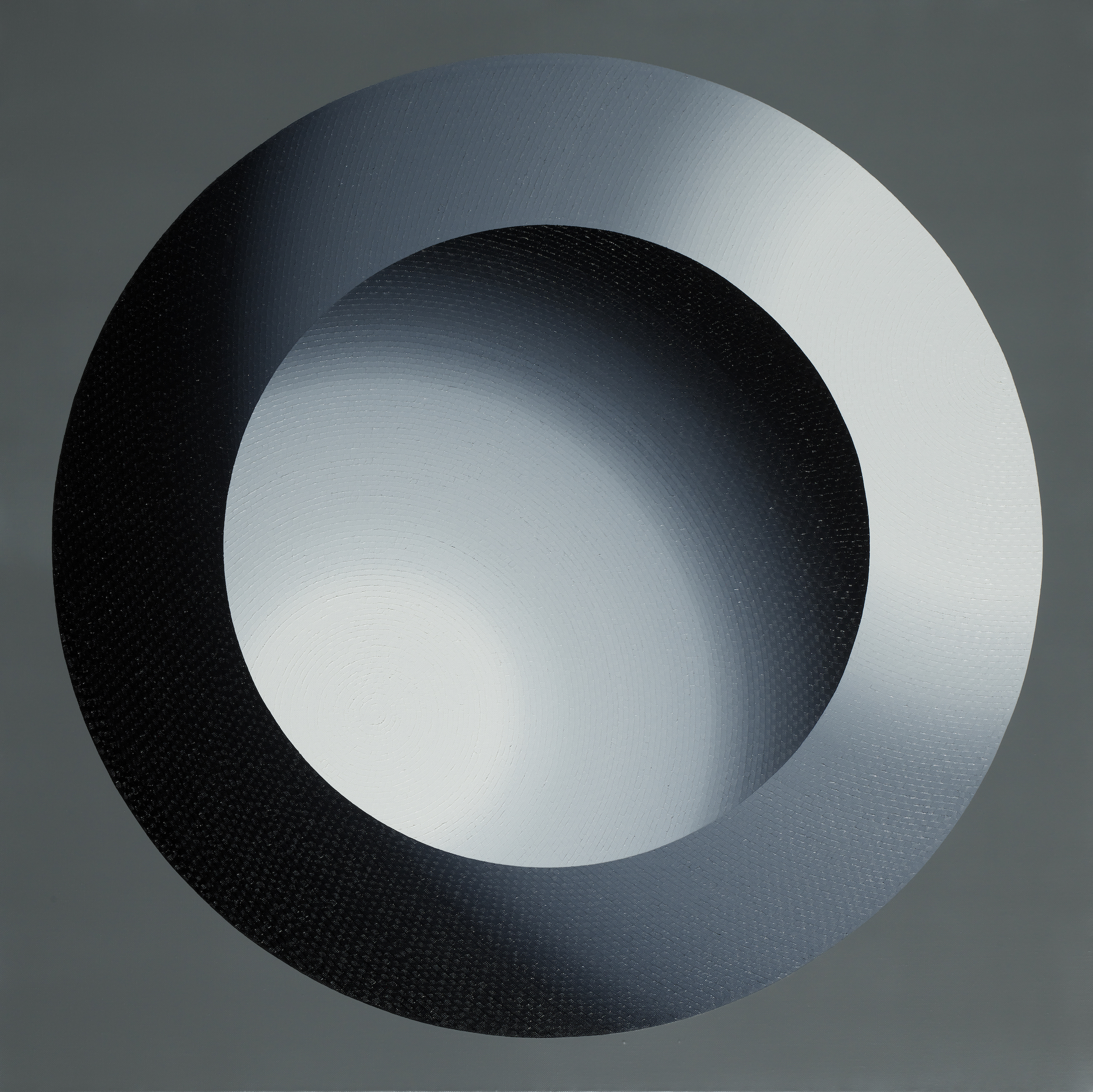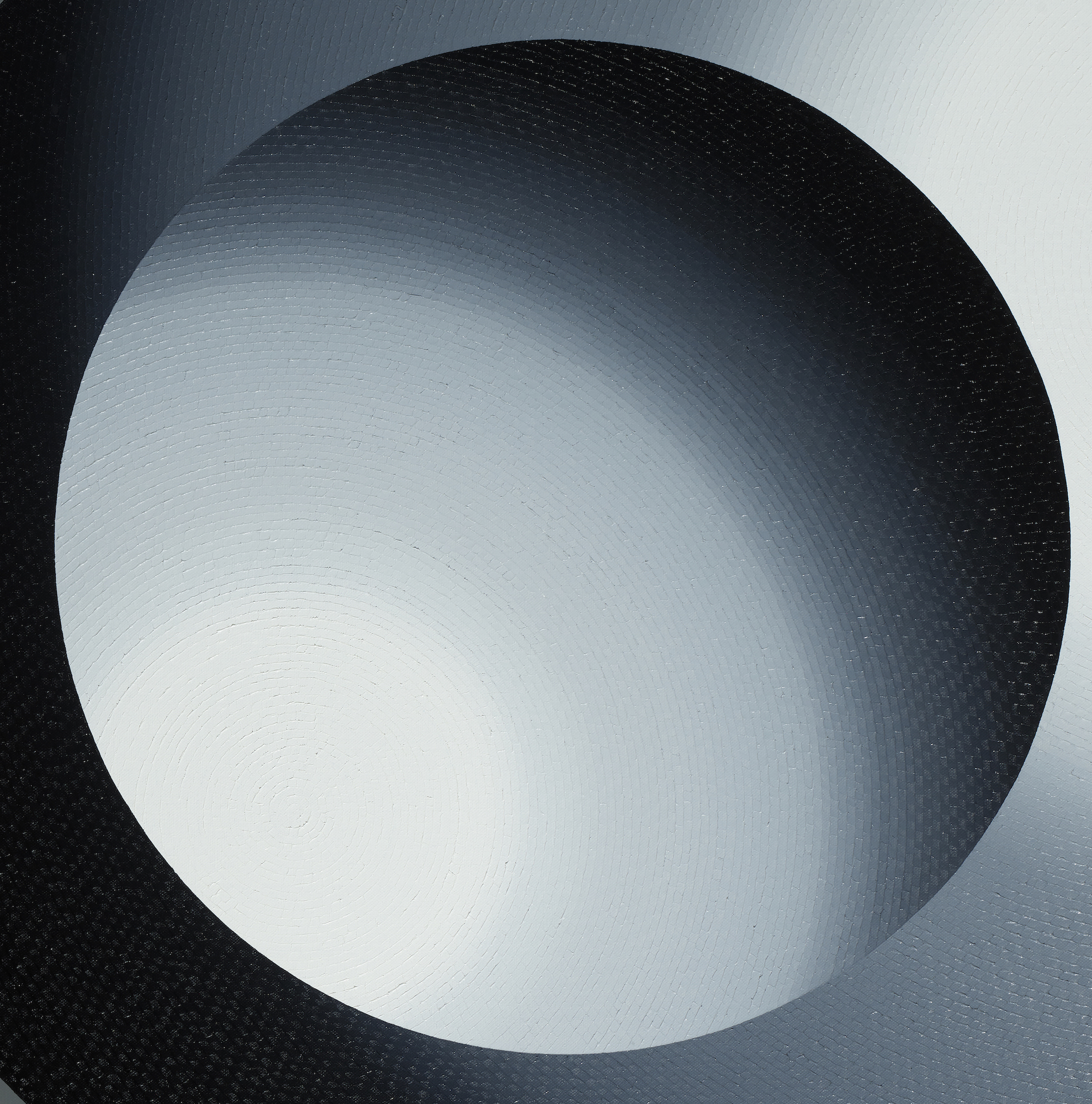 Mathieu Piffeteau works with all colours except red; for this painting, he used shades of black, grey and white. Here, the artist combines two types of paint and techniques, diversifying the texture and reflections on the surface of the work: part is done in oil using his fragmentation technique, while the flat colour is done in acrylic. In this painting, we can appreciate a visual effect of intense luminous radiation, an optical illusion created by the artist using a long gradation of colours.