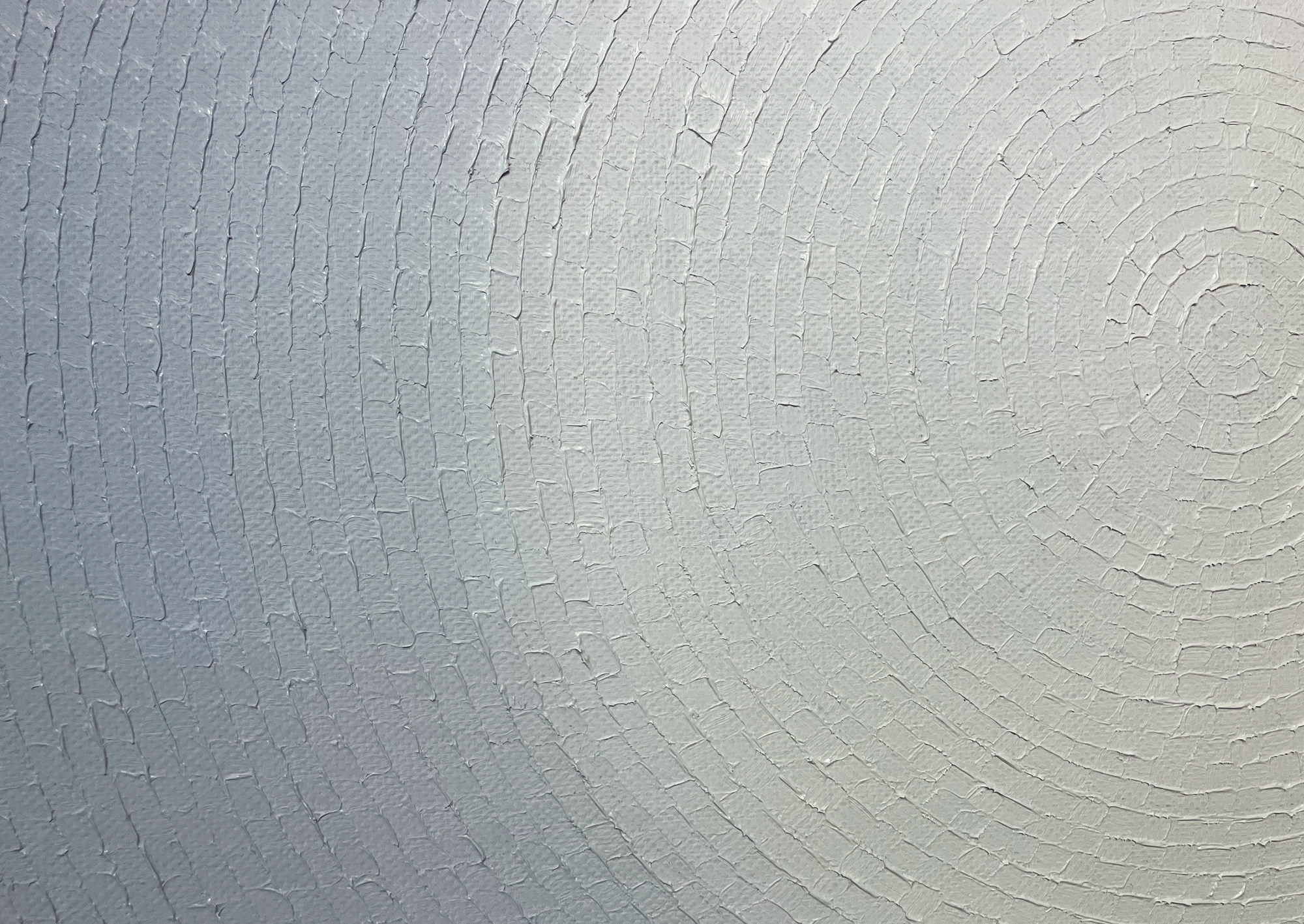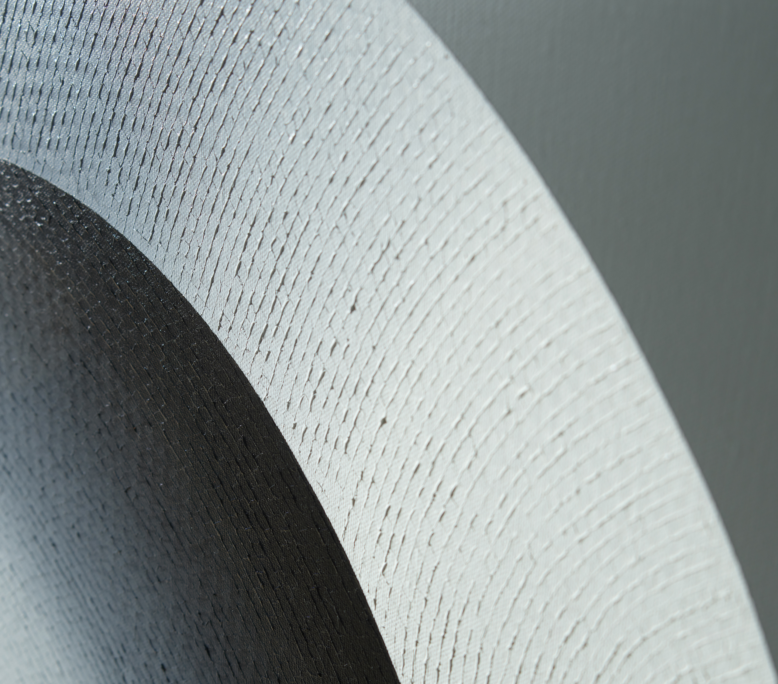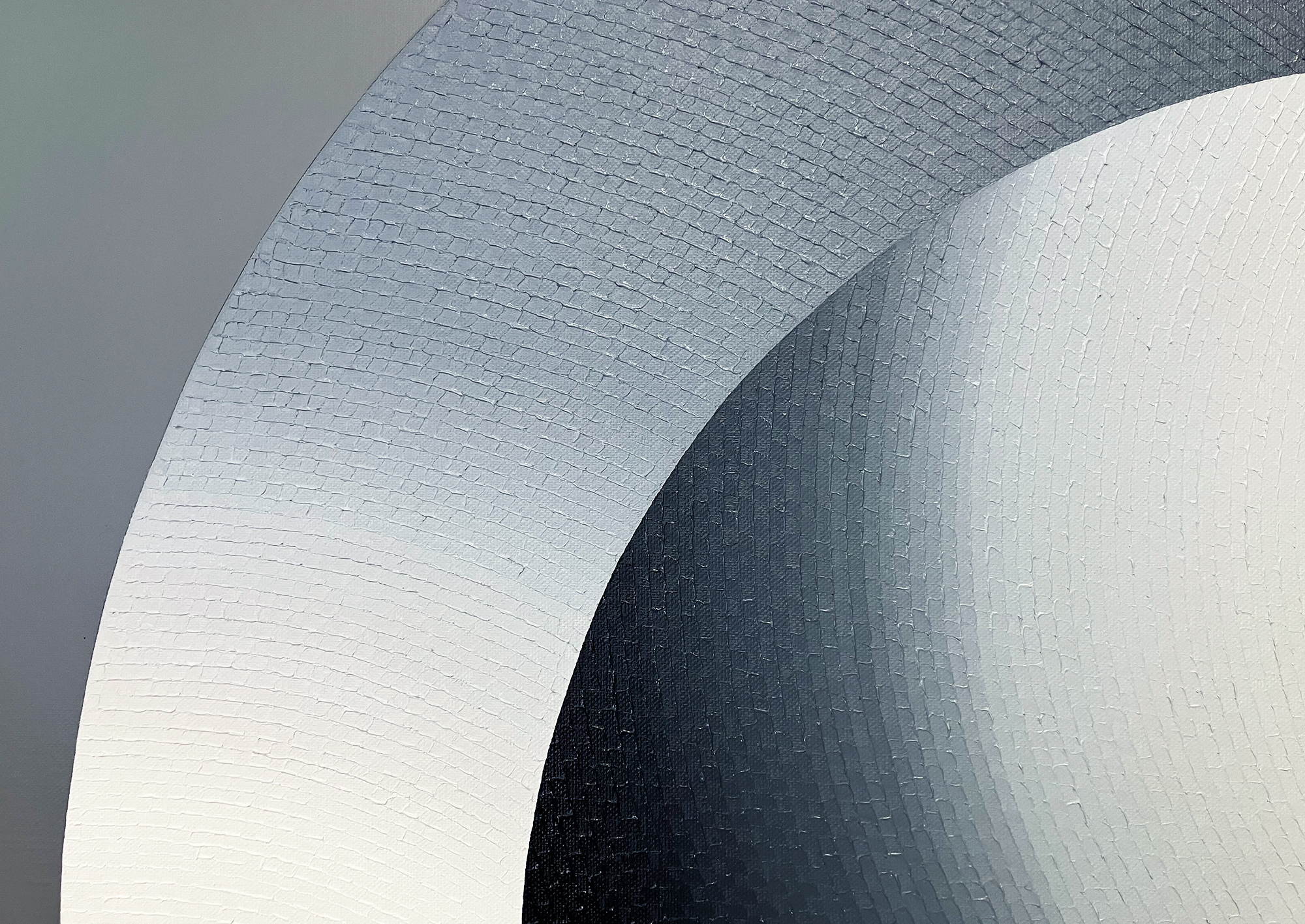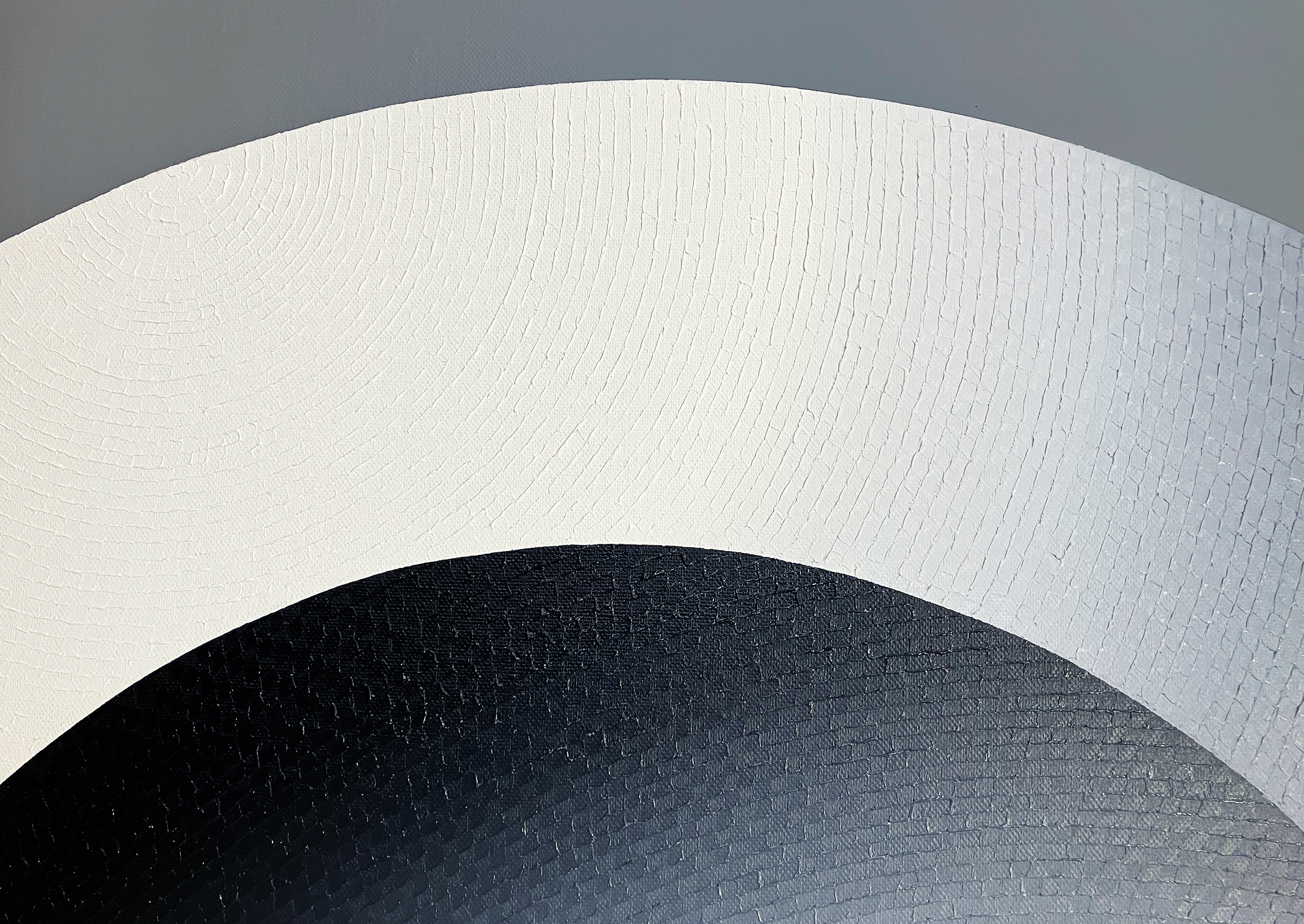 Mathieu Piffeteau works with all colours except red; for this painting, he used shades of black, grey and white. Here, the artist combines two types of paint and techniques, diversifying the texture and reflections on the surface of the work: part is done in oil using his fragmentation technique, while the flat colour is done in acrylic. In this painting, we can appreciate a visual effect of intense luminous radiation, an optical illusion created by the artist using a long gradation of colours.
