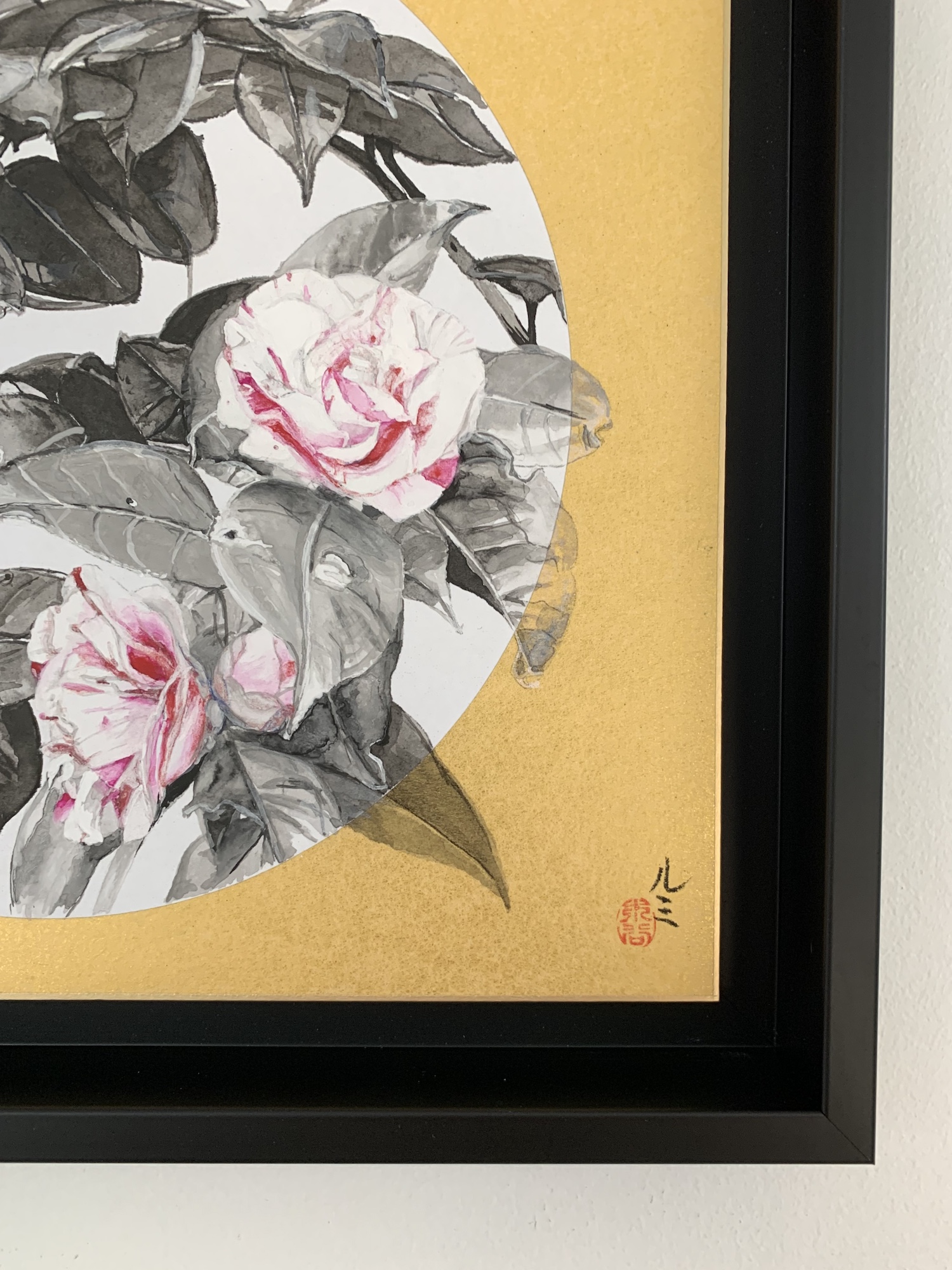 Camellia IX is a painting by contemporary Franco-Japanese artist Lumi Mizutani. On a golden background, she painted a camellia flower with India ink and Japanese pigments.