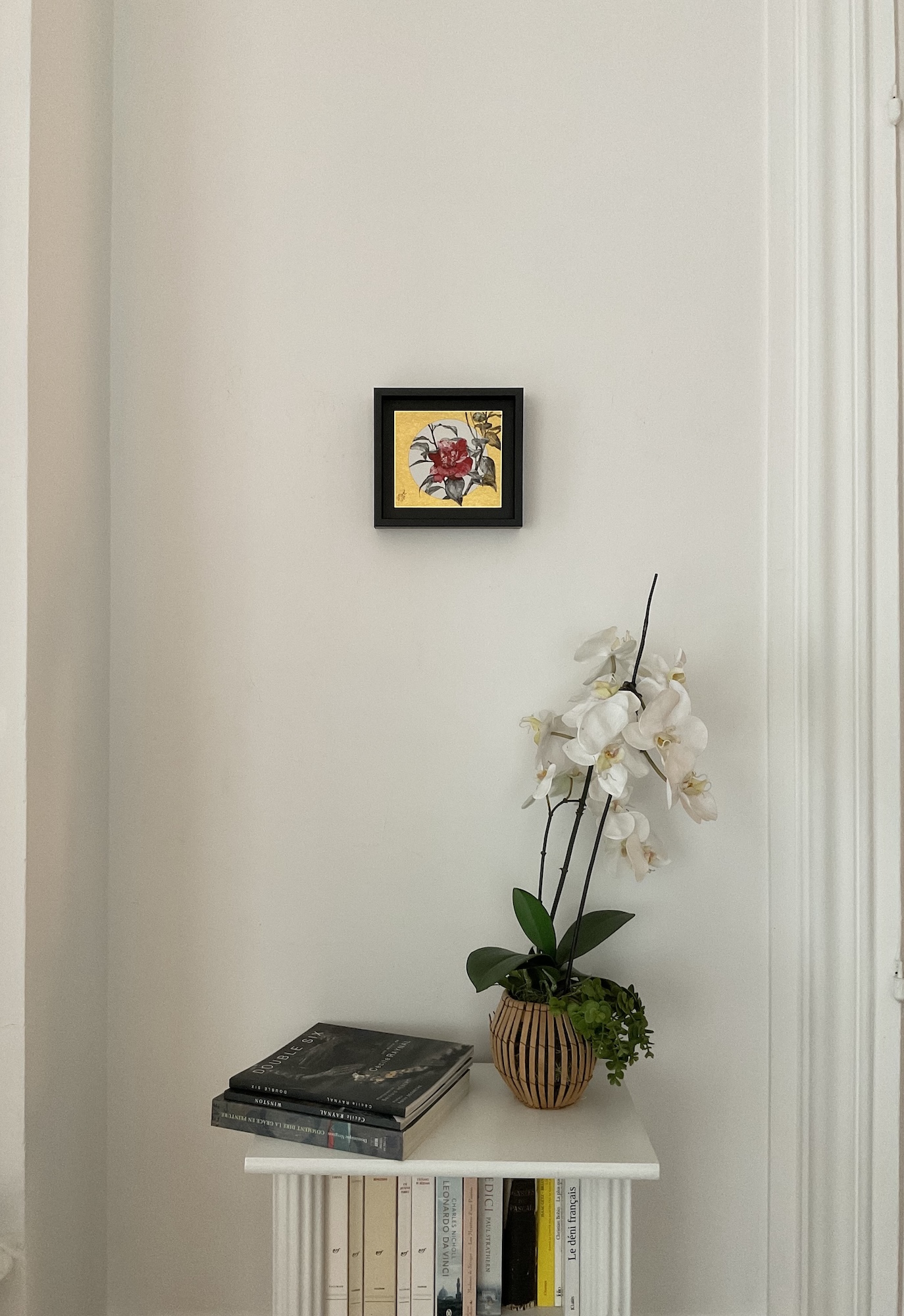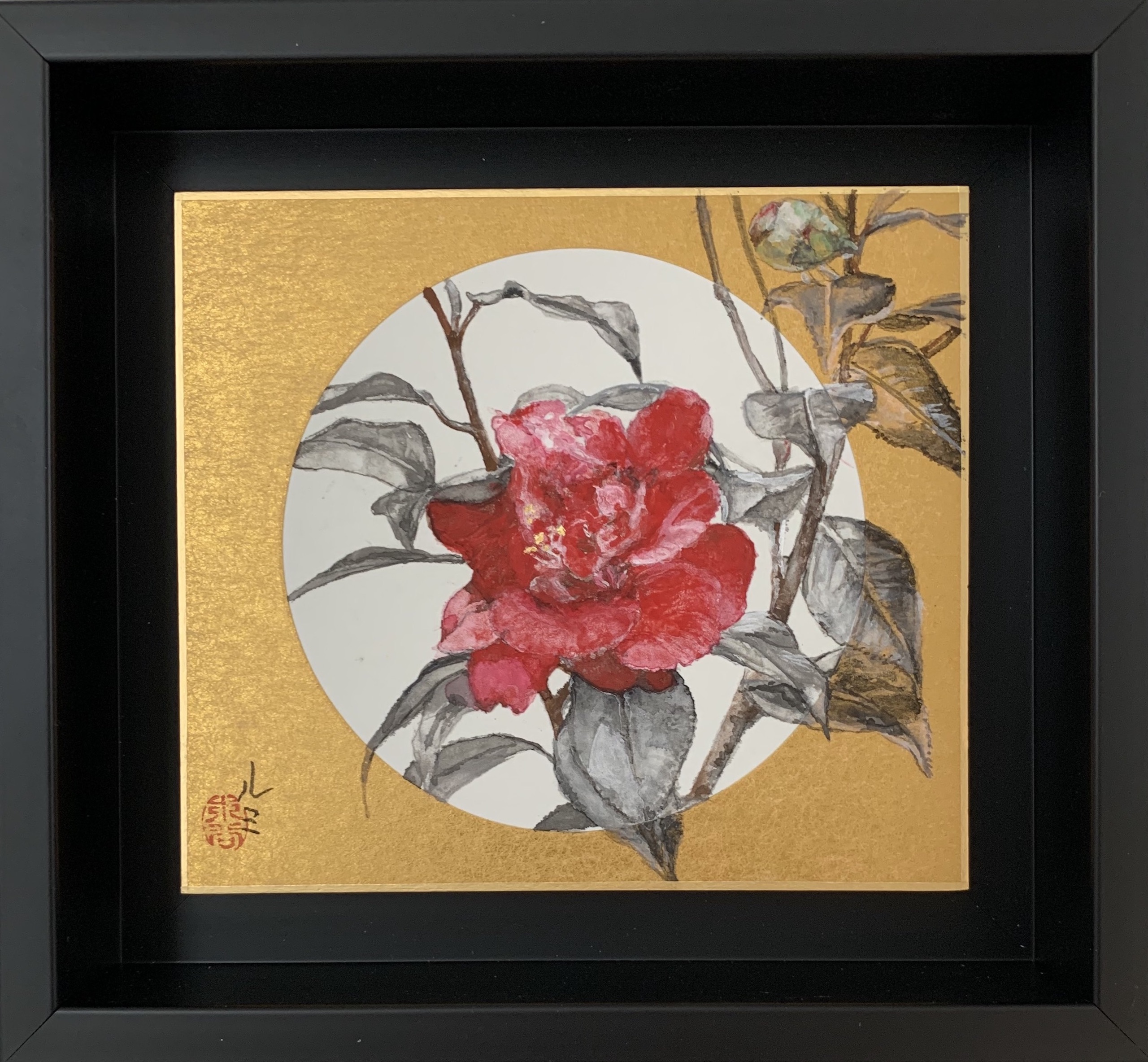 Camellia VIII is a painting by Franco-Japanese contemporary artist Lumi Mizutani. This small sized painting, done in colour pigments and Indian ink, represents leaves and a camellia flower that has hatched. Some of the camellia’s leaves blend in with the painting’s golden background. The delicacy of the lines and colours in this artwork gives a feeling of peacefulness.