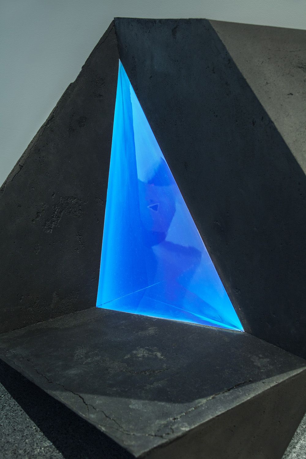 The artist created the Carbon Voids series by combining various geometric ‘positive’ (creating solids) and ‘negative’ (creating voids) shapes. Using geometry, he wanted to explore the relationship between man and the objects he uses; thanks to the intrinsic presence of voids, the artworks have the potential to change into containers or seats. It is up to the public to decide whether the piece is functional or purely sculptural, by placing it on one facet or another. In Carbon Void Blue, a resin triangle is nestled in coal like a gemstone in rock, reflecting light through its translucent surface.