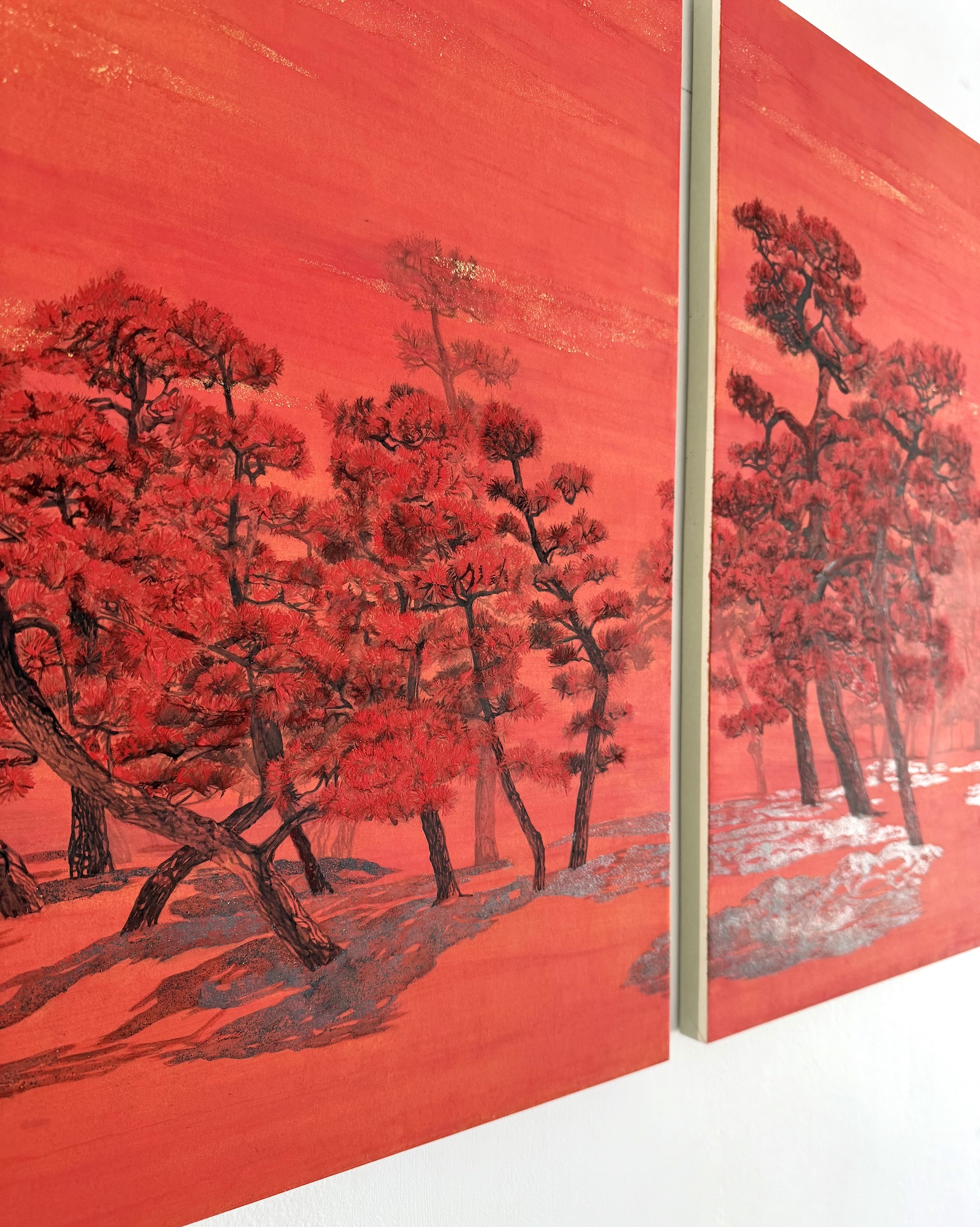 This diptych is of a pine forest, a tree often found in Lumi’s work. Among the trees, that she has labelled ‘chatty’ in the title, are three groups of trees that standout, allowing us to see the pine trunks movements and the branches that seem to stretch, leaning out in different directions. On the diptych’s lefthand side, is a V formation of migrating birds in a red sky.