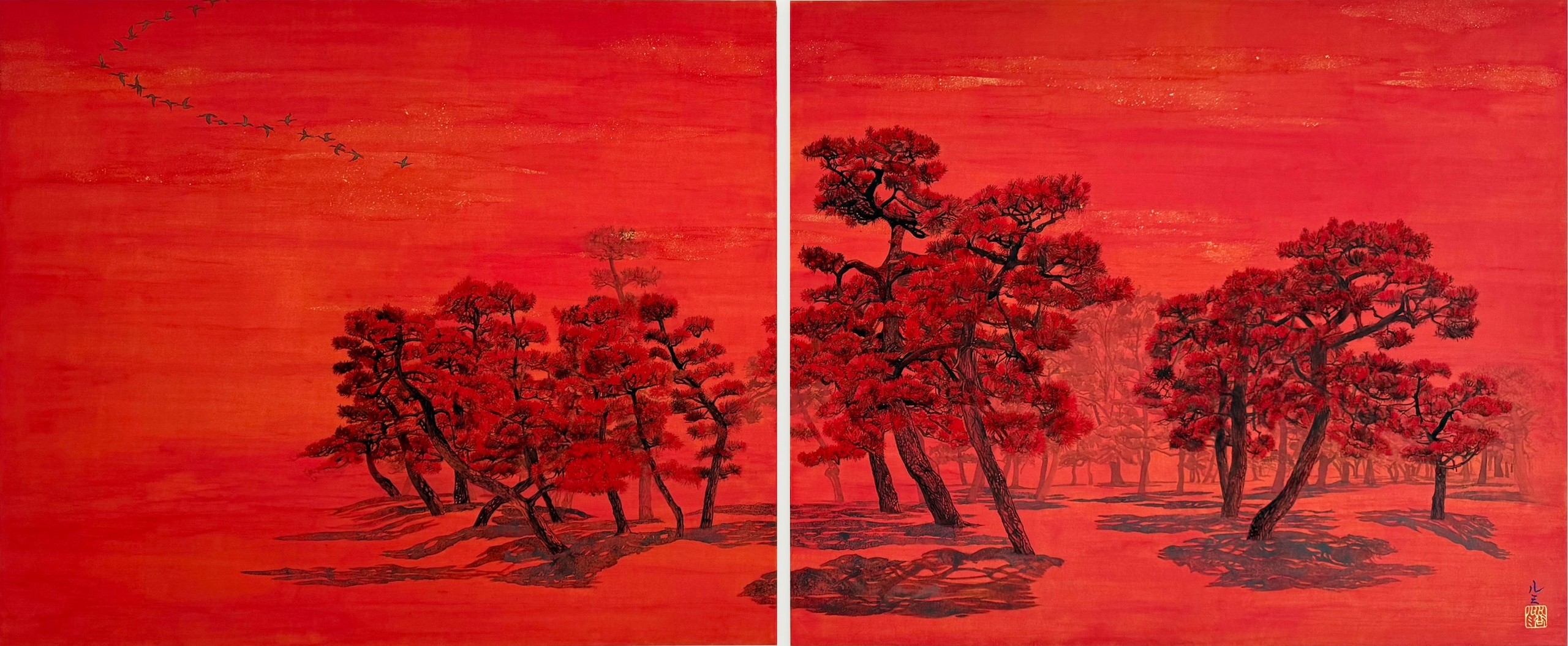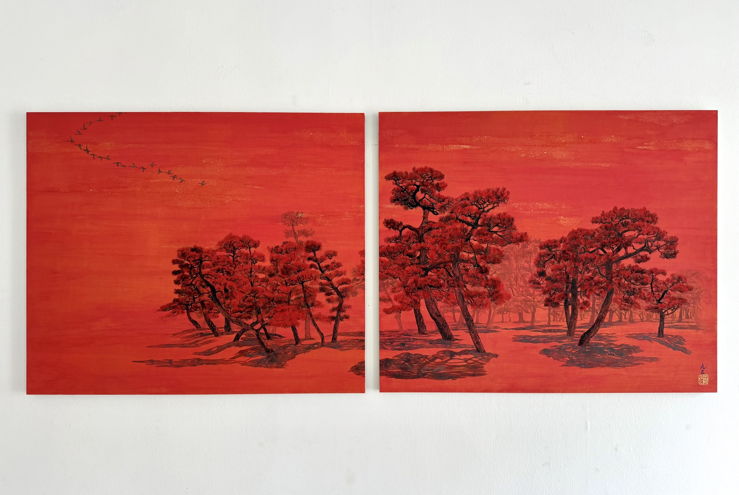 | Tags | bird|diptych|forest|gold leaf|ink|Japan|Large-scale painting|pigment|red|tree |