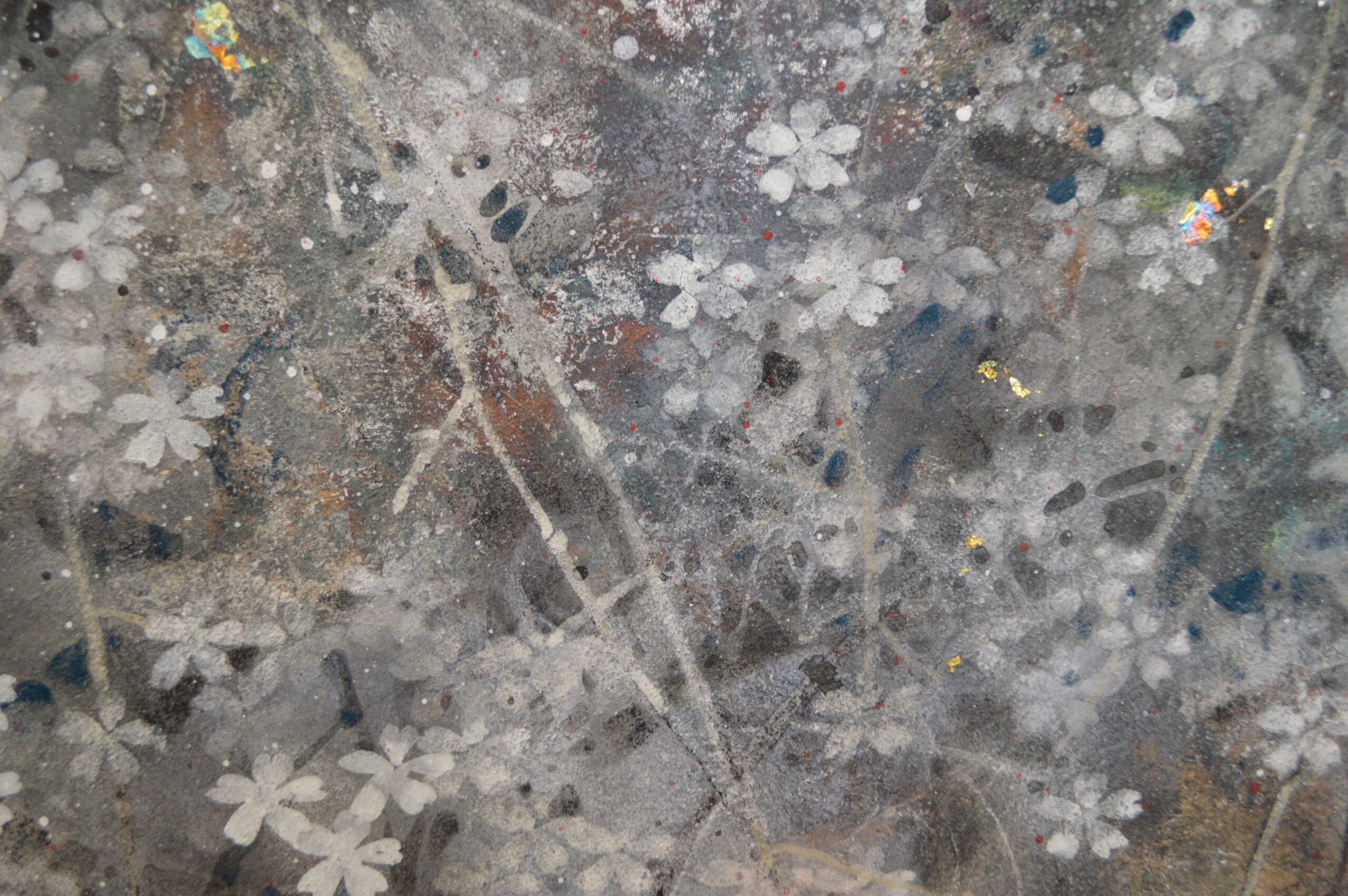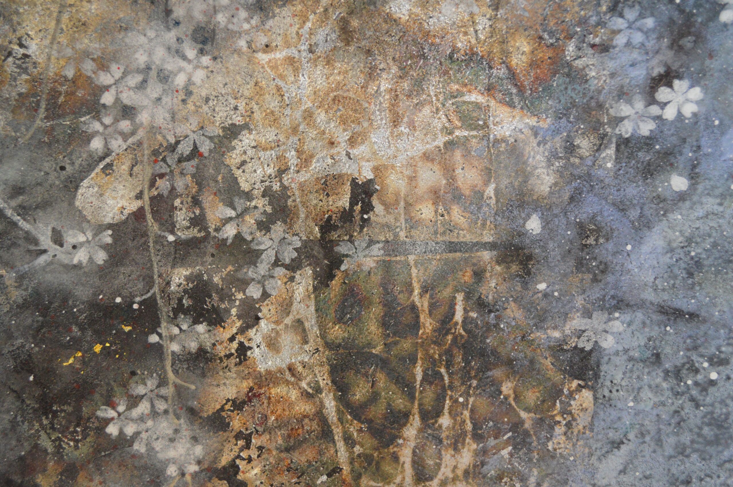 | Description | Mineral pigments, silver leaves on Japanese paper mounted on wood |