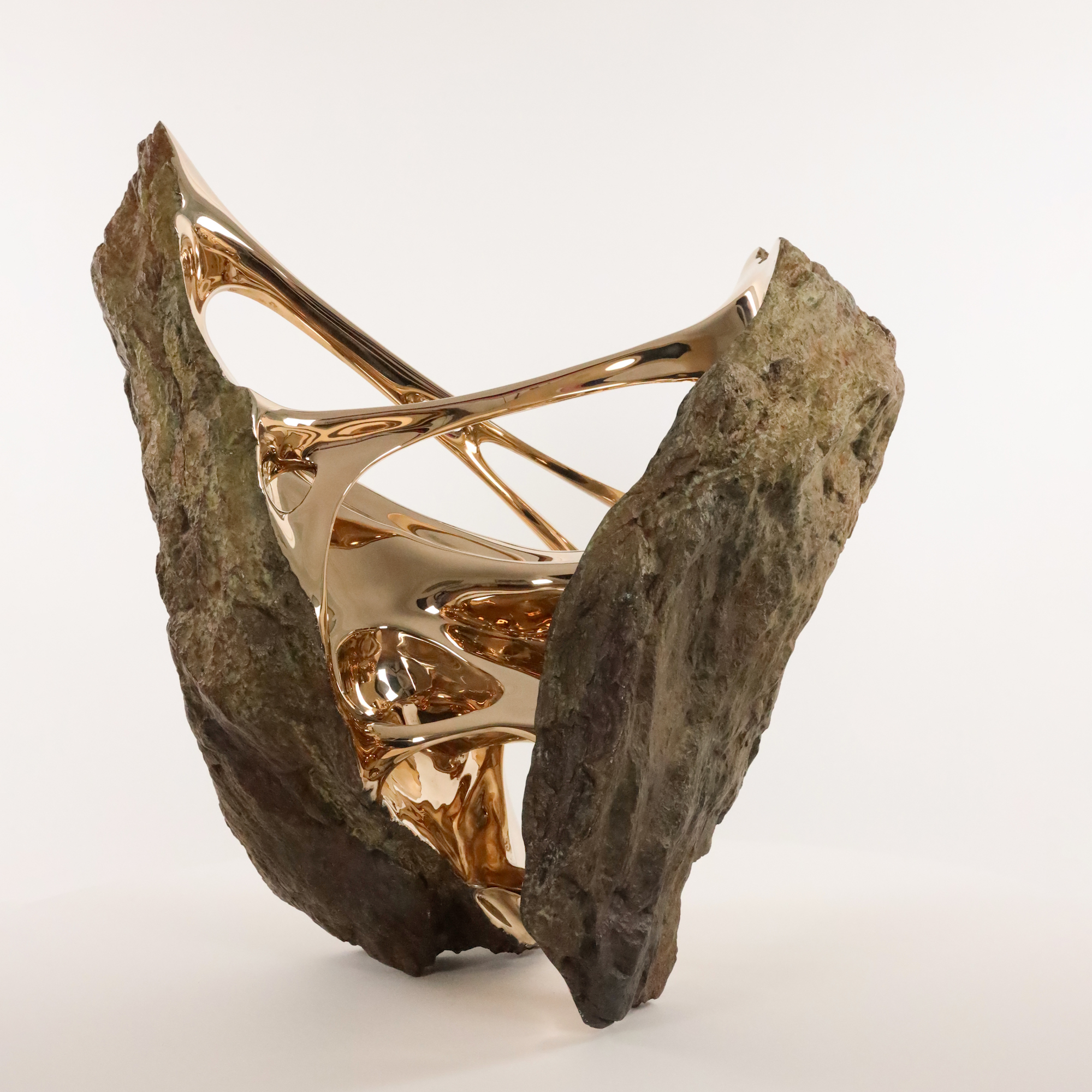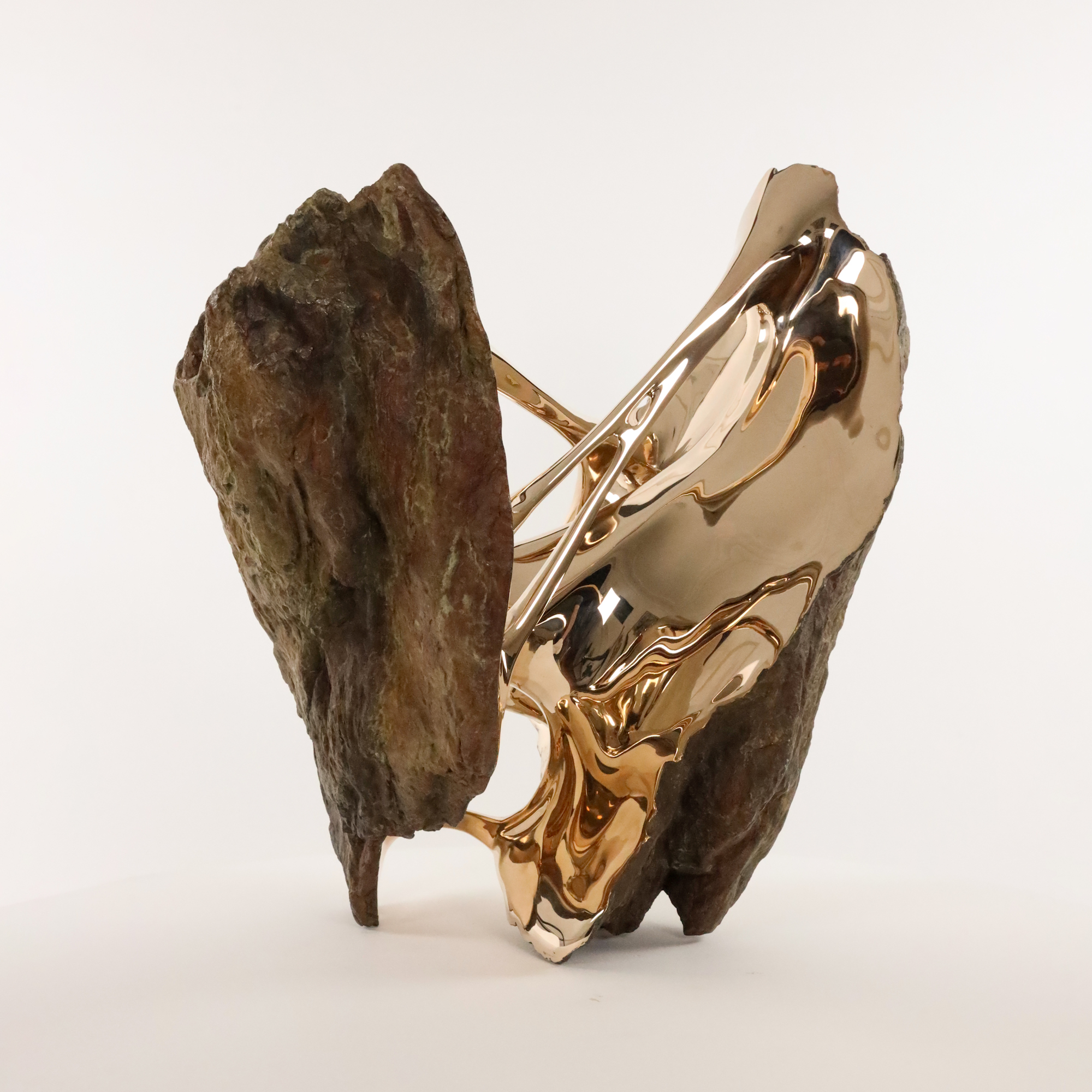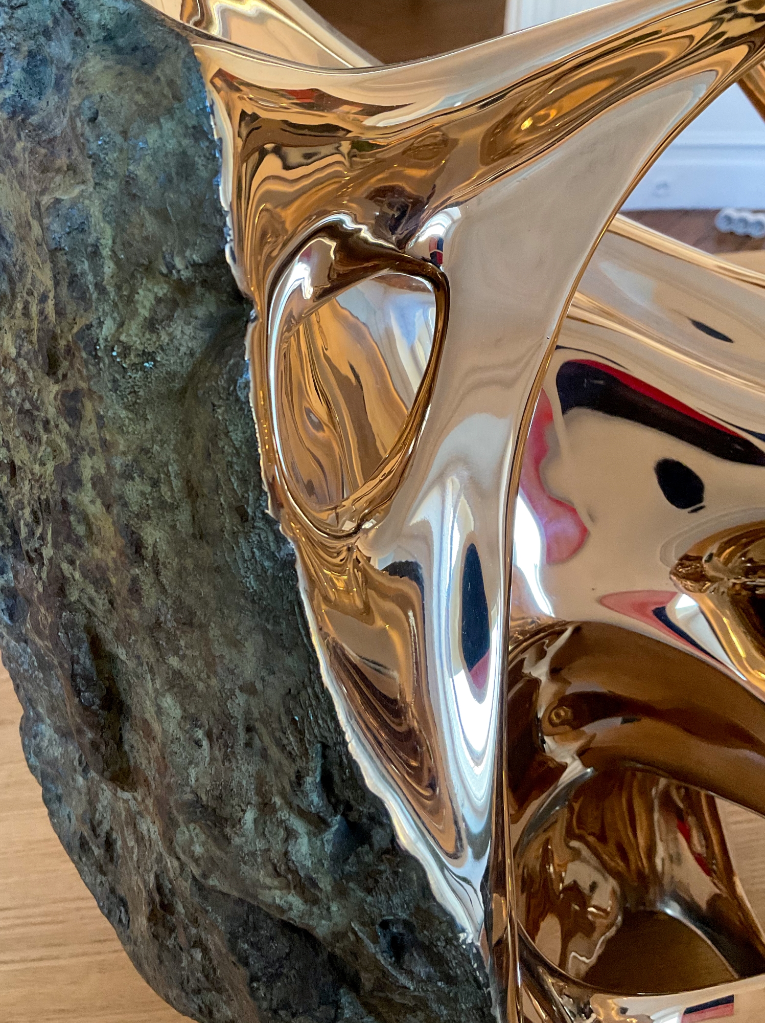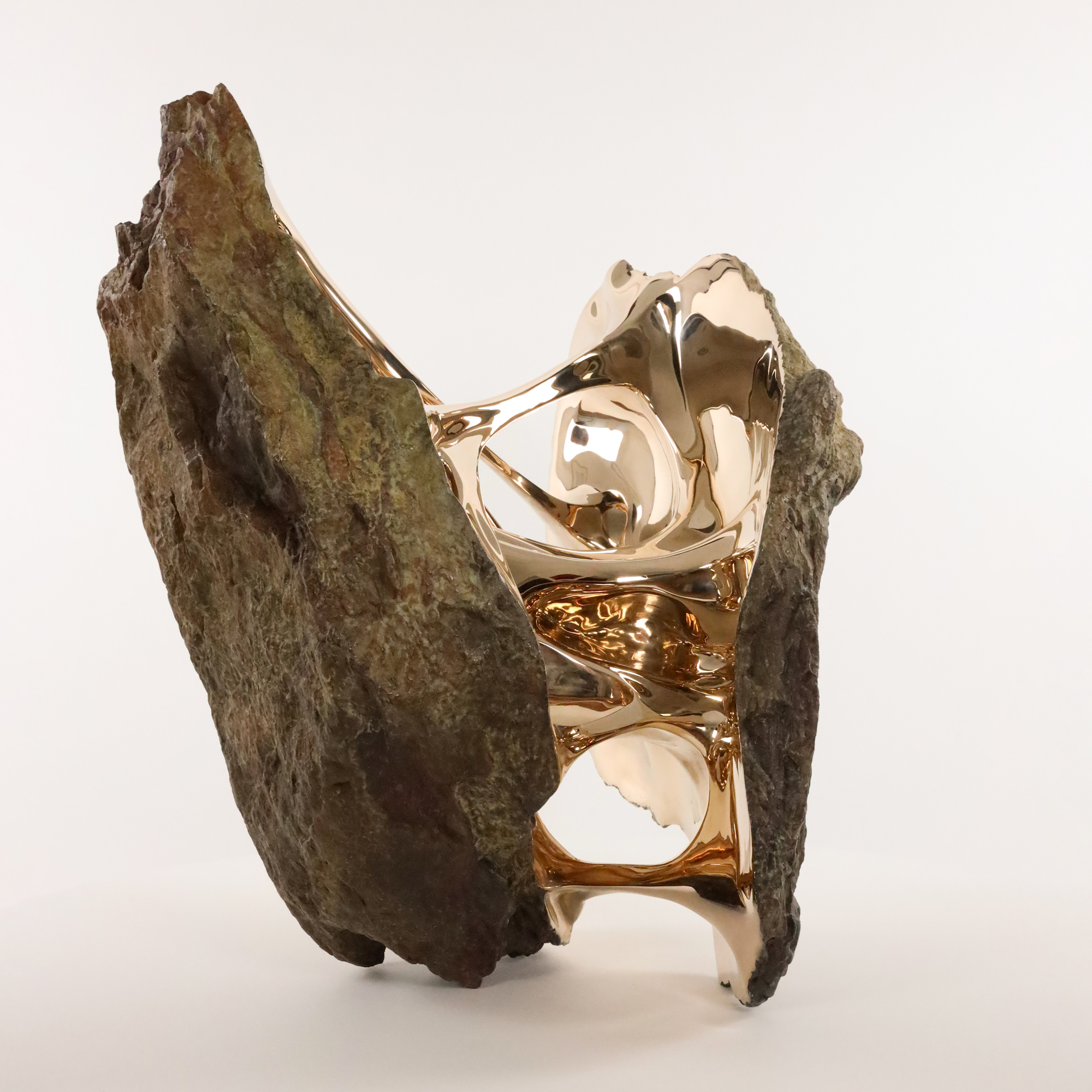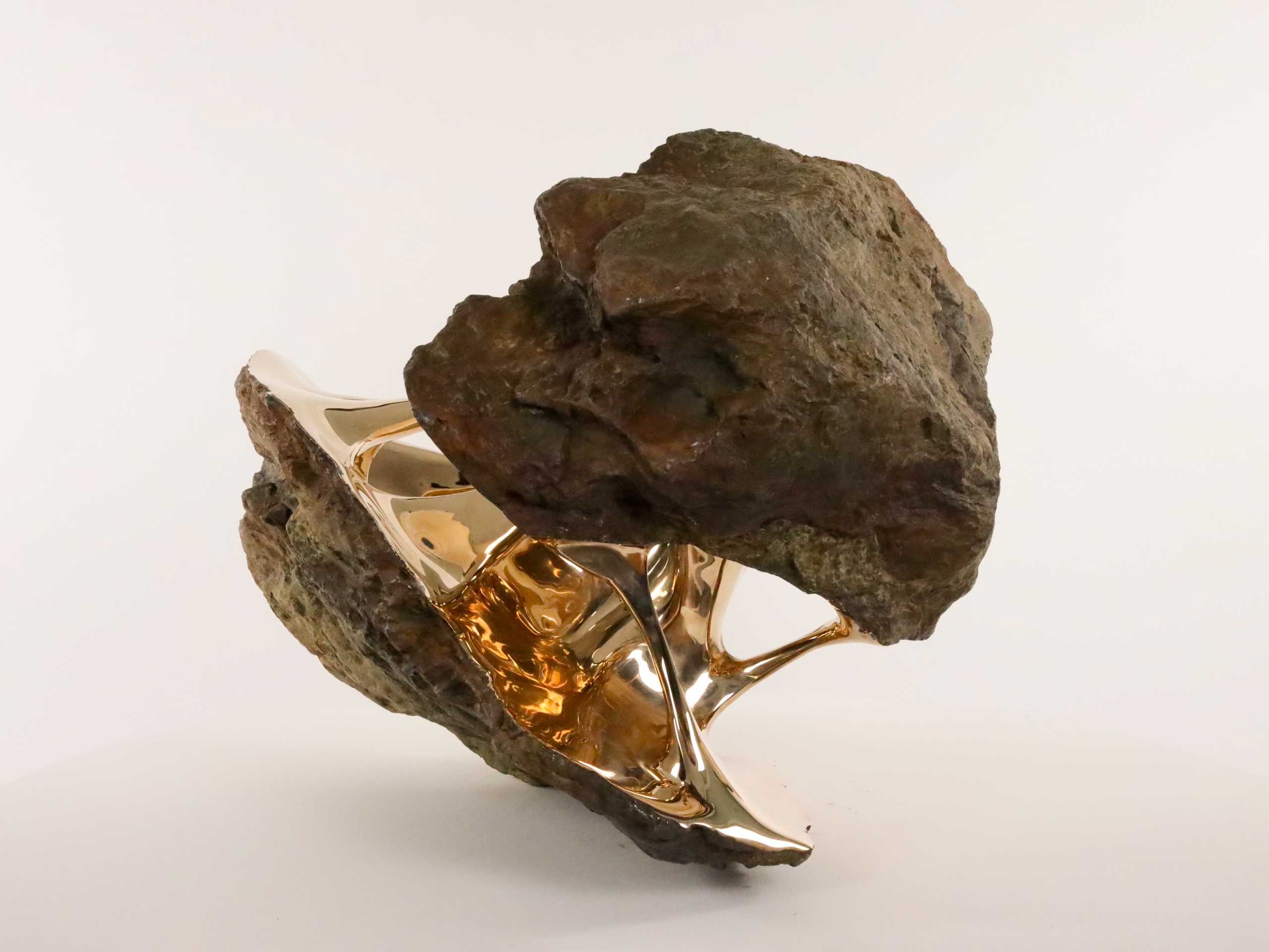 In this bronze sculpture, Romain Langlois very realistically imitates the aspect of rock. The textures are obtained in the casting process and the colours through different patinas. The interior is polished so as to give the bronze this golden hue and glints of light. The difference in patina between the inside and outside, together with the changing shapes of the sculpture, gives it a dynamic, living appearance.