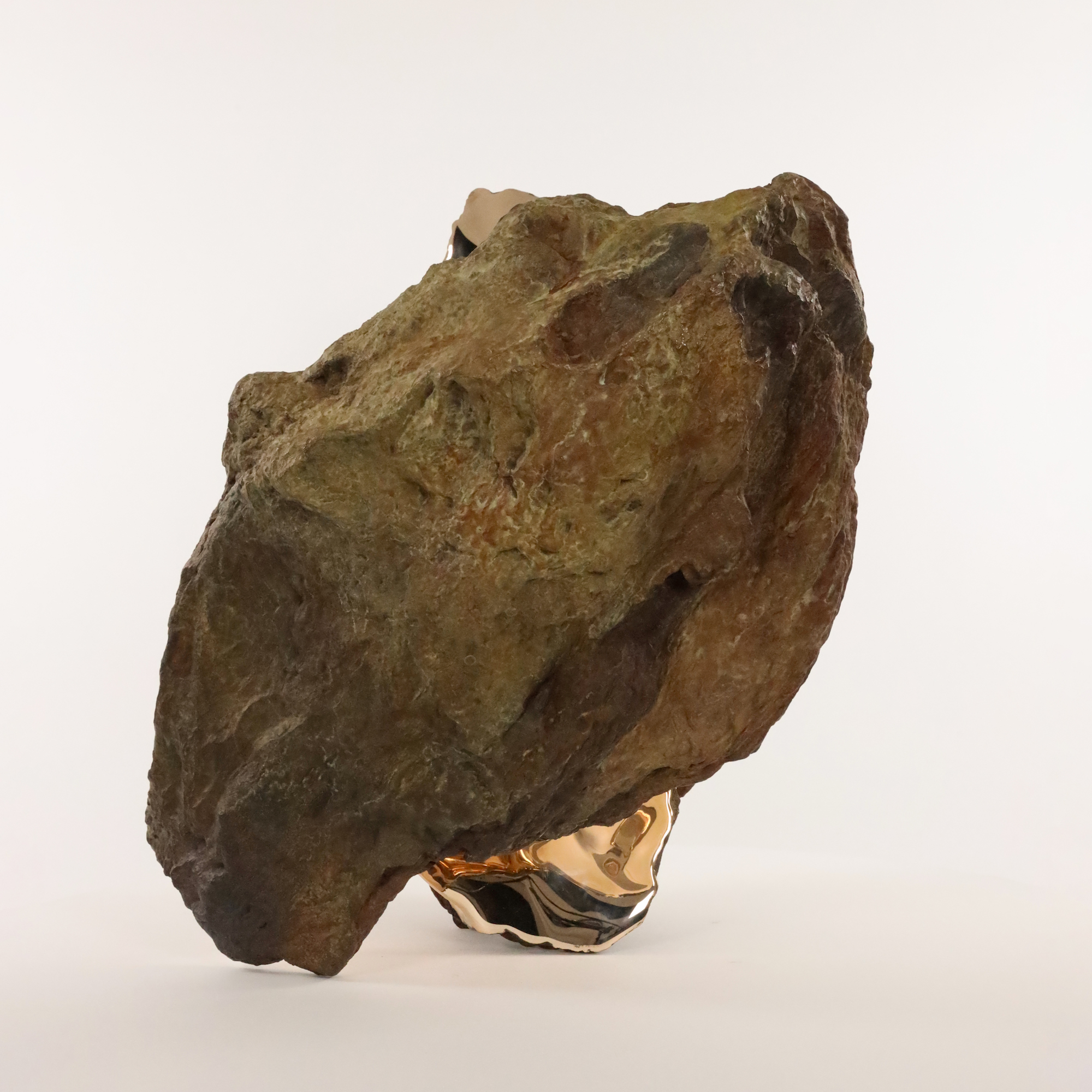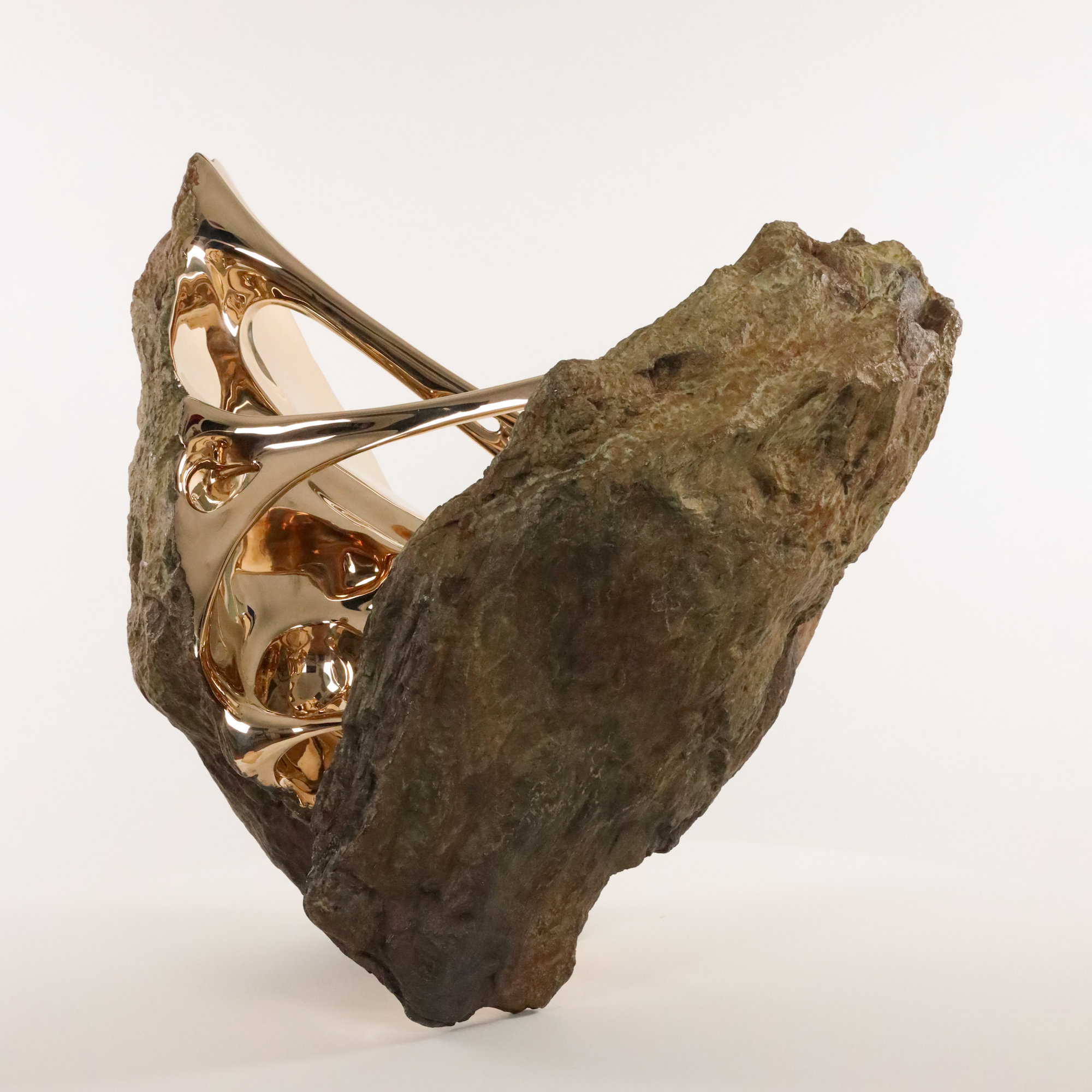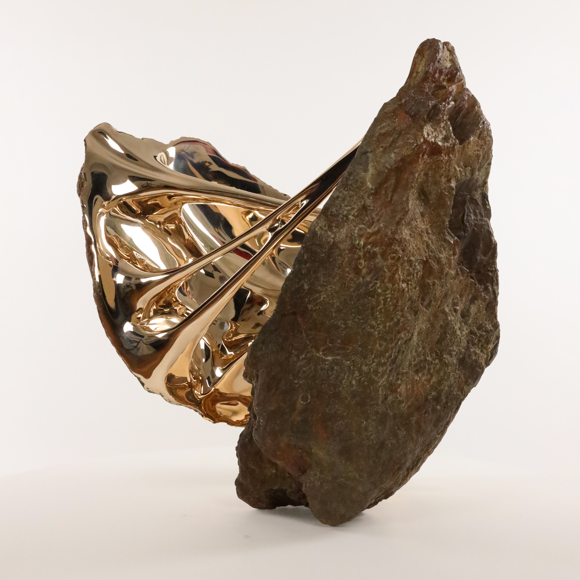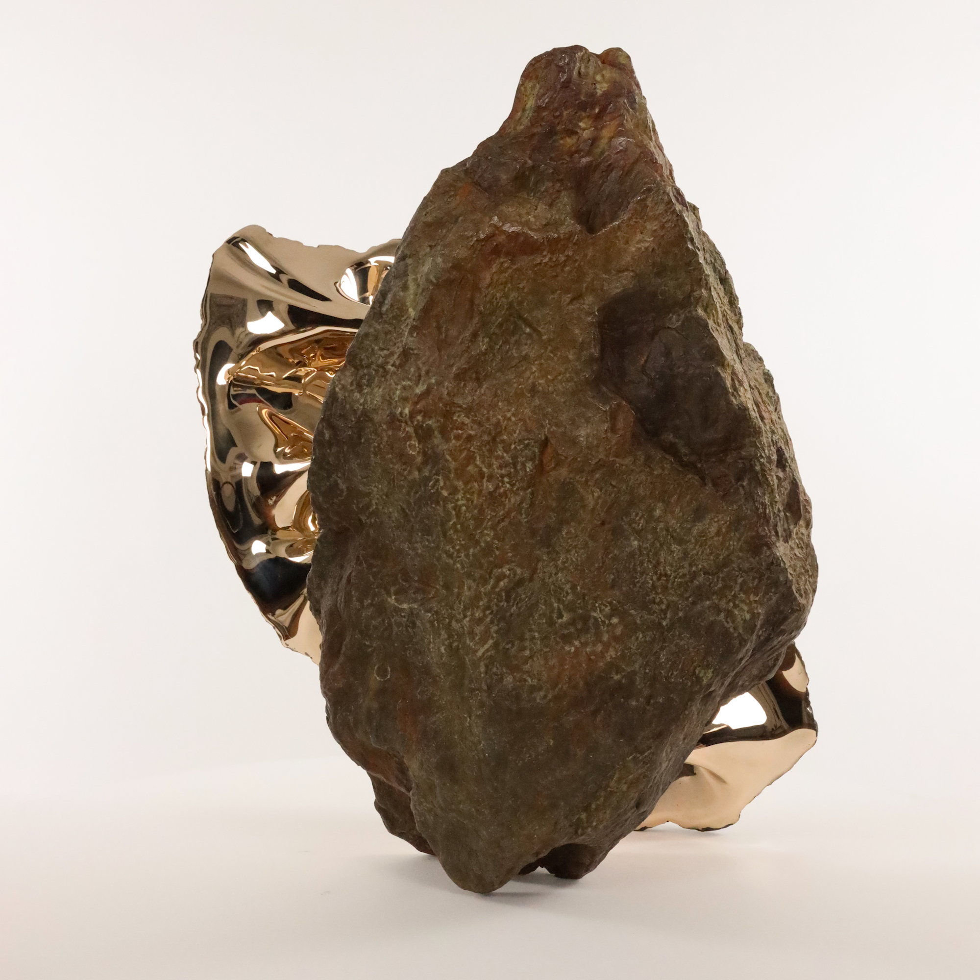 In this bronze sculpture, Romain Langlois very realistically imitates the aspect of rock. The textures are obtained in the casting process and the colours through different patinas. The interior is polished so as to give the bronze this golden hue and glints of light. The difference in patina between the inside and outside, together with the changing shapes of the sculpture, gives it a dynamic, living appearance.