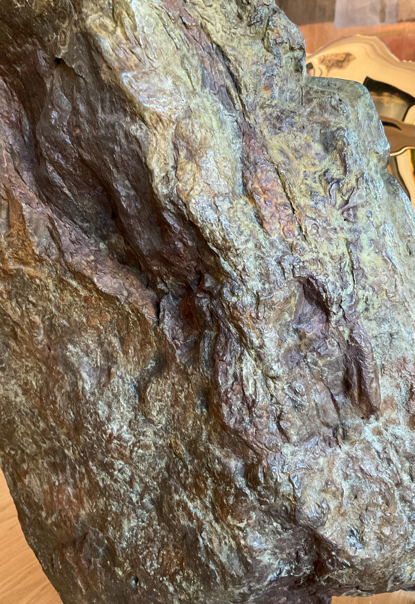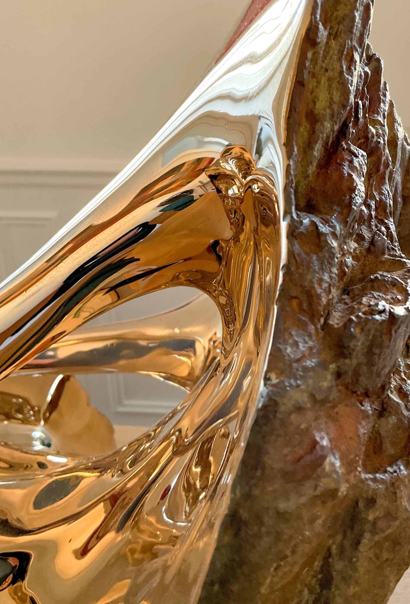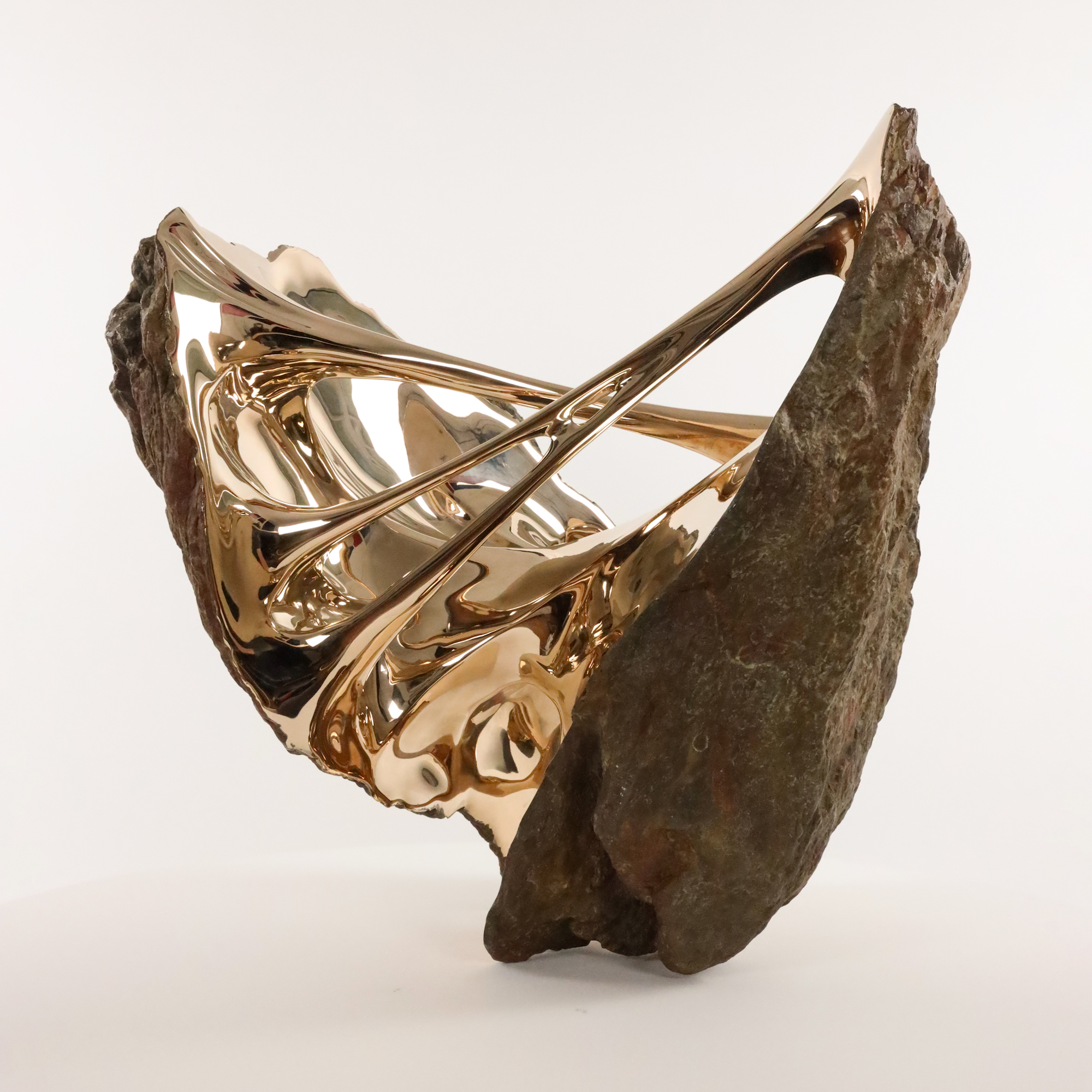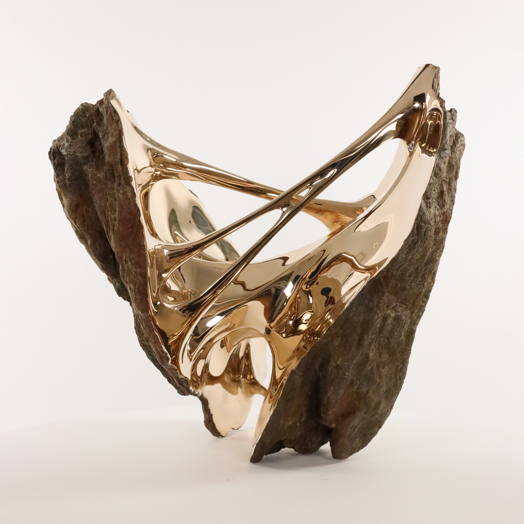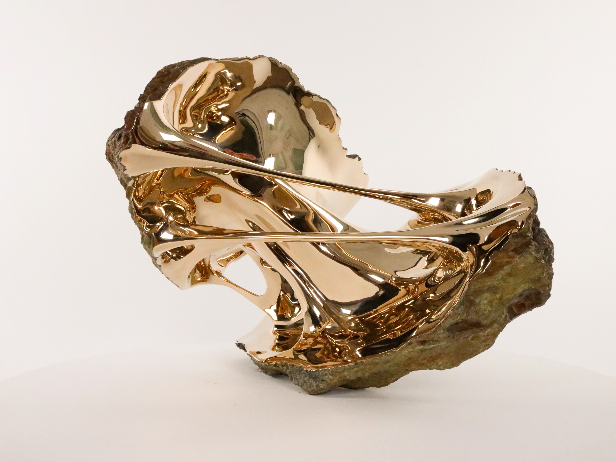 In this bronze sculpture, Romain Langlois very realistically imitates the aspect of rock. The textures are obtained in the casting process and the colours through different patinas. The interior is polished so as to give the bronze this golden hue and glints of light. The difference in patina between the inside and outside, together with the changing shapes of the sculpture, gives it a dynamic, living appearance.