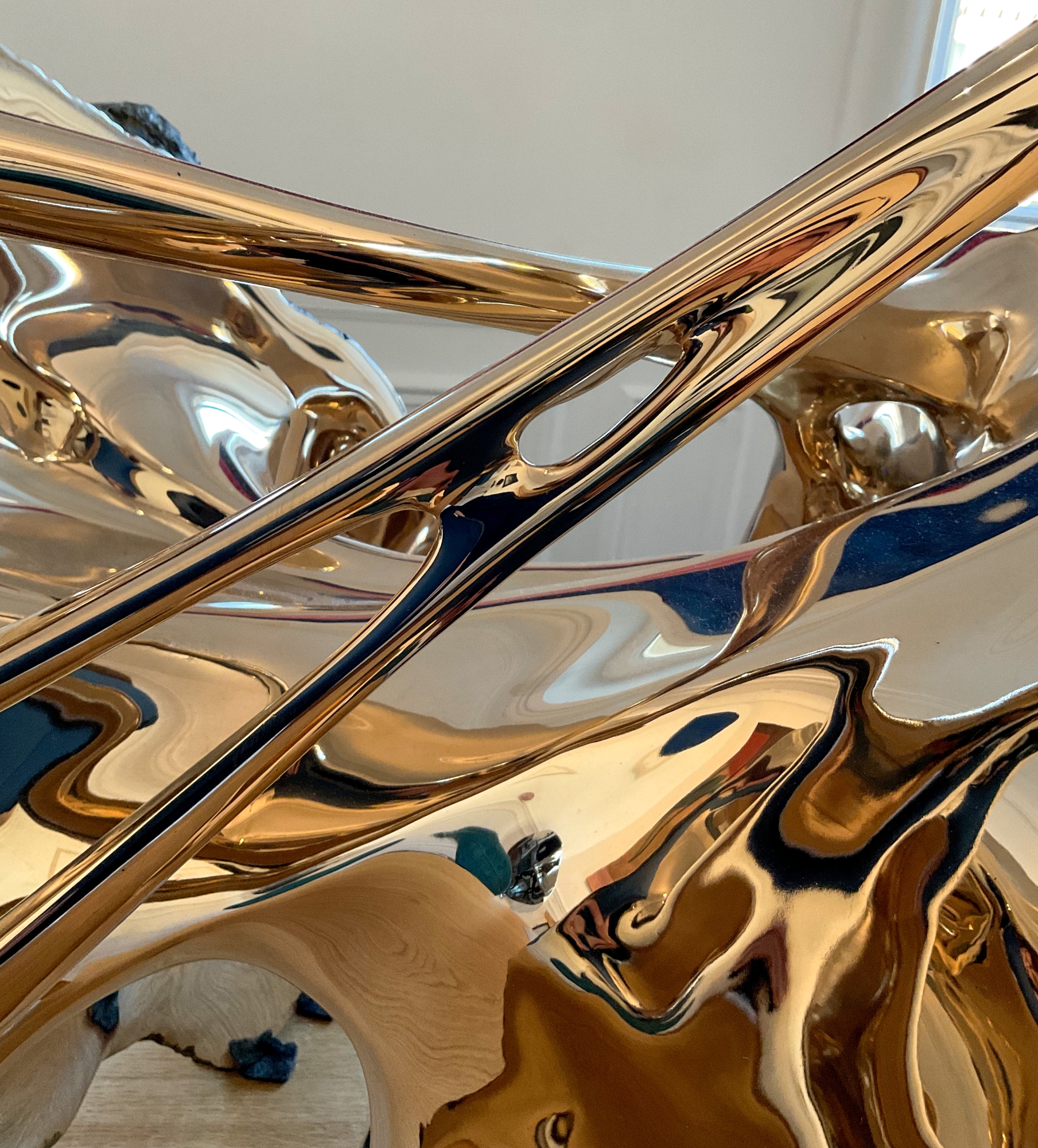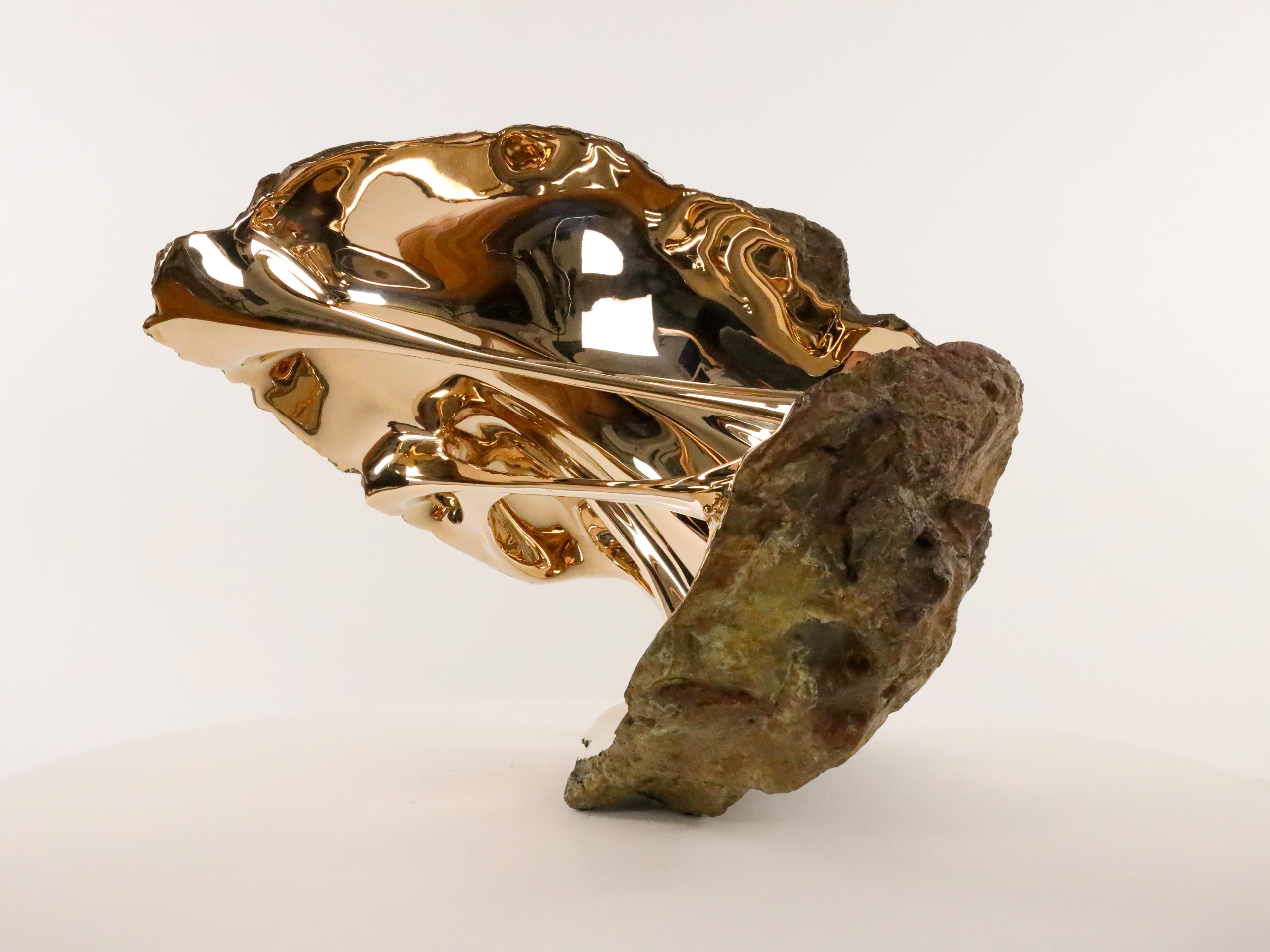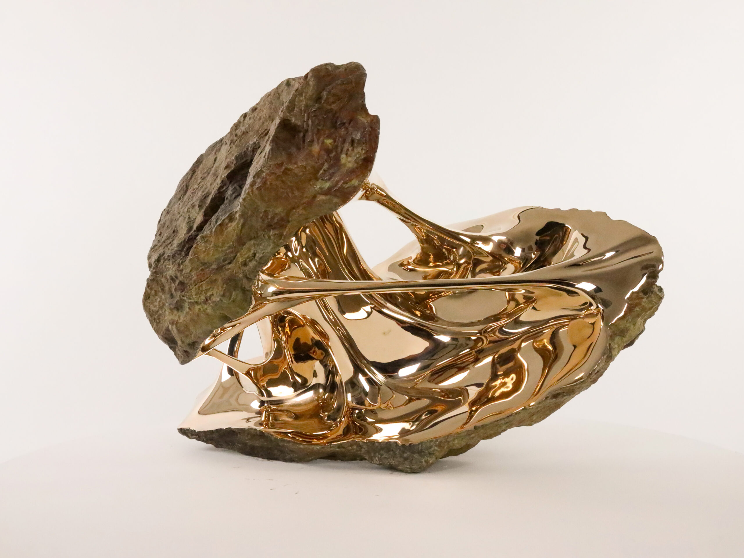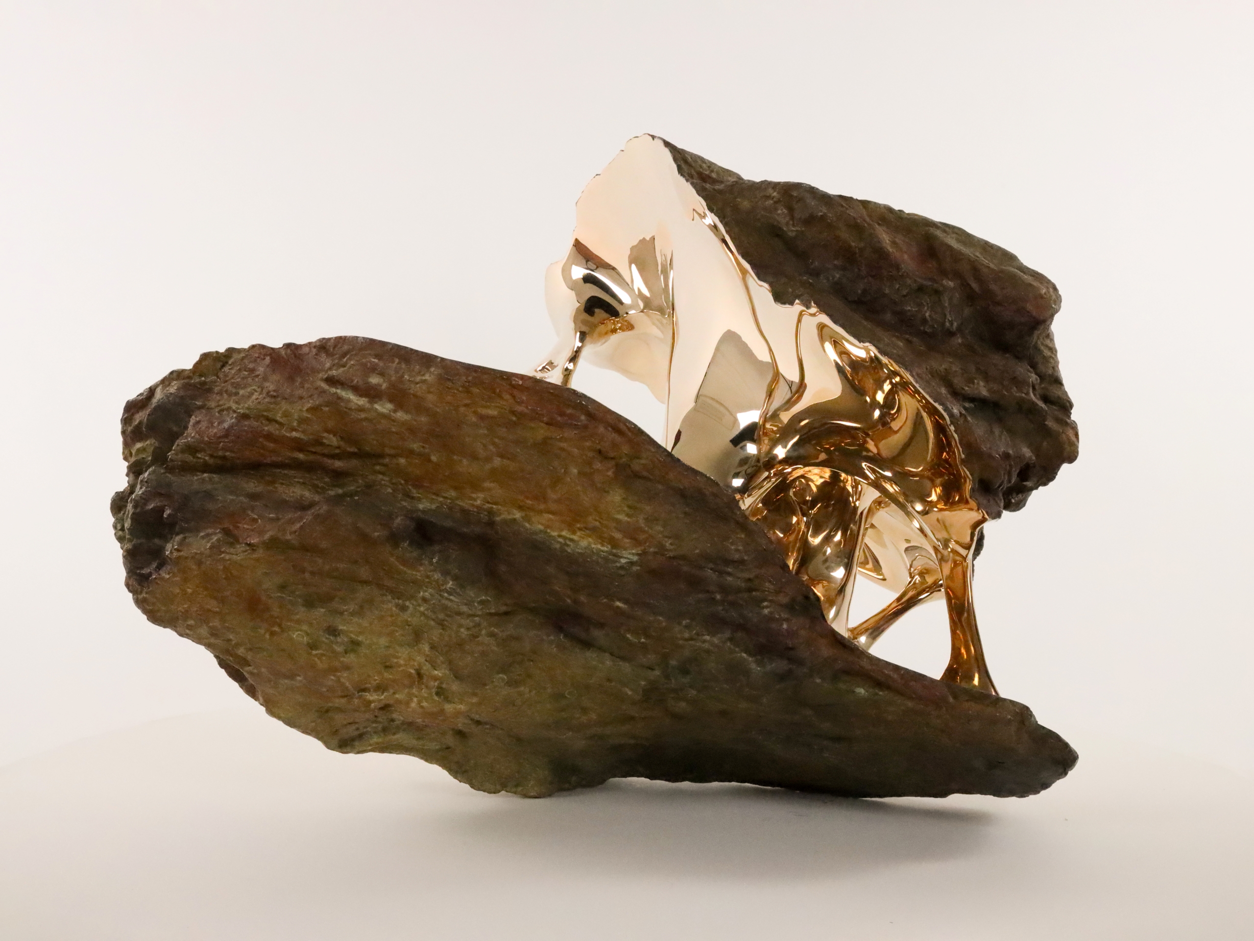 Romain Langlois draws his inspiration from nature. These stumps, rocks, abandoned branches are brought back to life by the artist thanks to his spectacular bronze work. Thanks to the bronze patina, the copied nature is formally transformed as well as substantially: the forms are stretched, hollowed out and a golden material – achieved by polishing the bronze – springs from the object’s core. Precious pieces are created before our eyes, making us forget the unimportance of their origin.