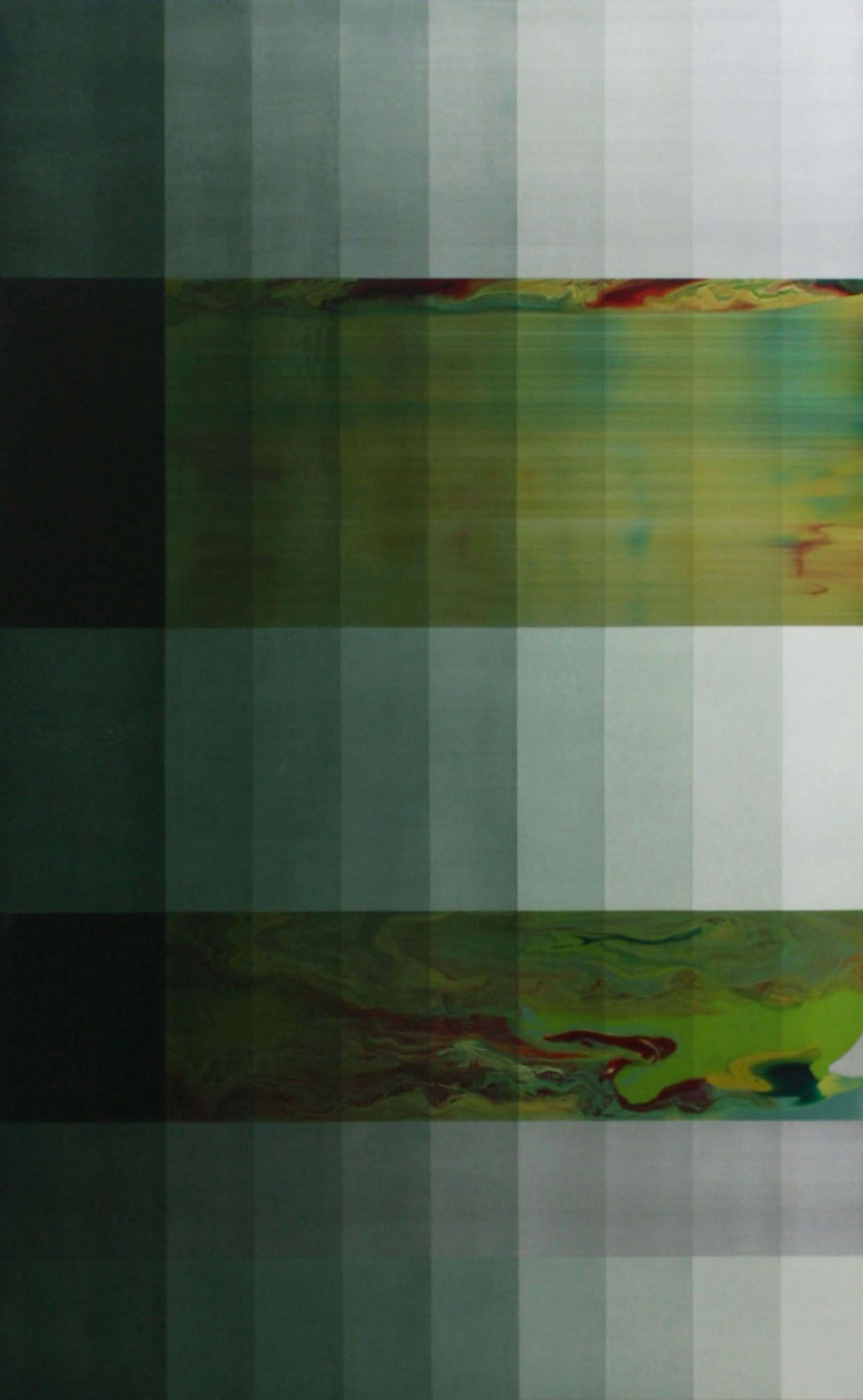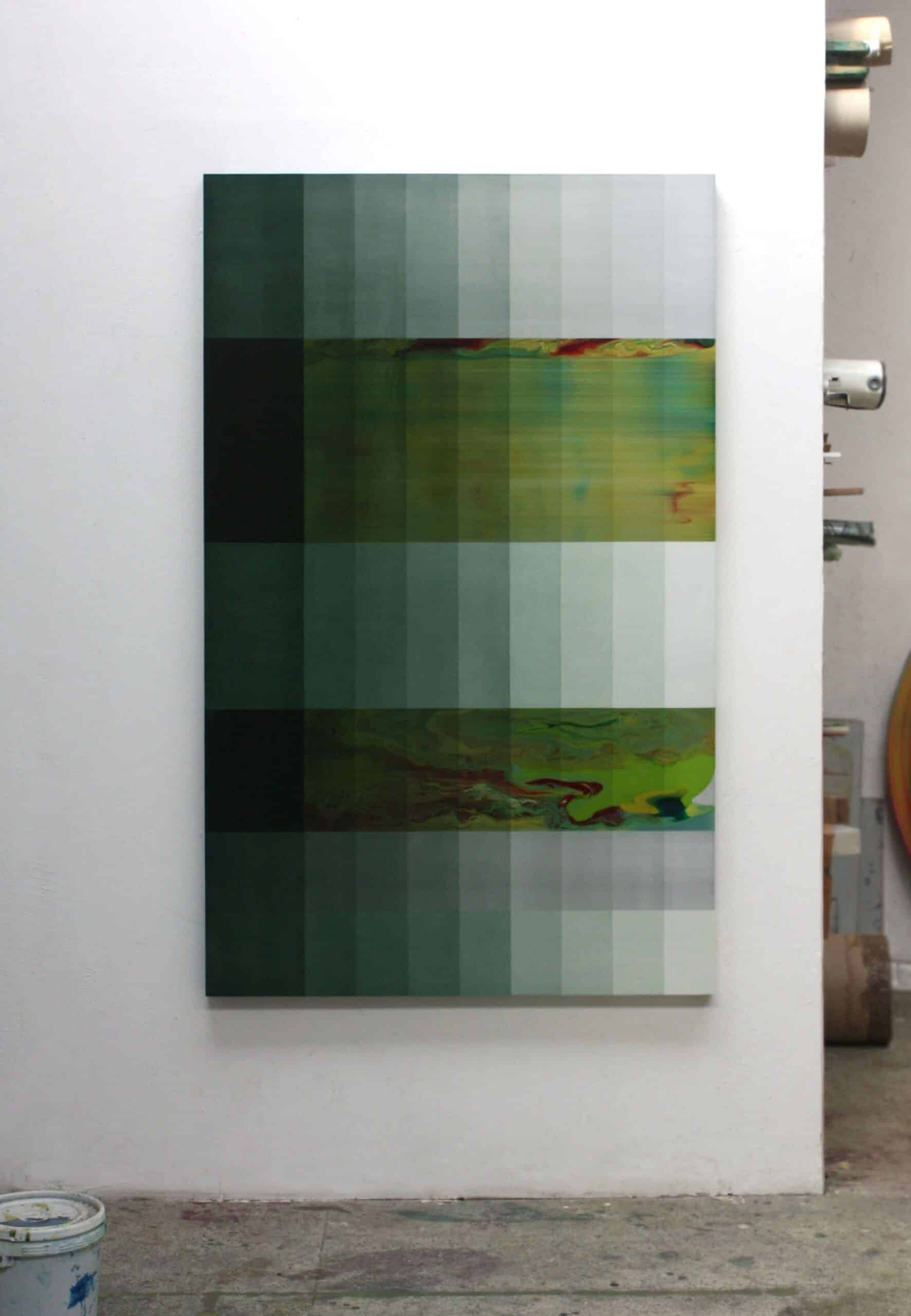 In this abstract painting the artist uses multiple shades of green. She confronts rigid and geometric forms, such as the vertical and horizontal lines that cross over the surface, with more instinctive and irregular ones, such as the mix of the red, yellow and green colors that seem imprisoned inside the horizontal shapes. Ahn Hyun-Ju is looking for the tension between totally mastered painting and a process punctuated by chance happenings.
