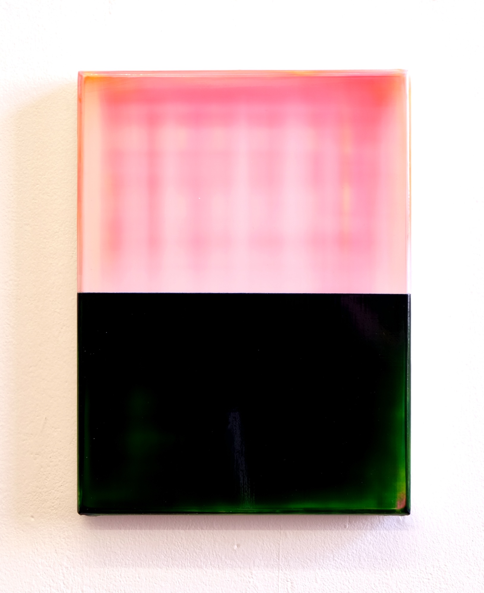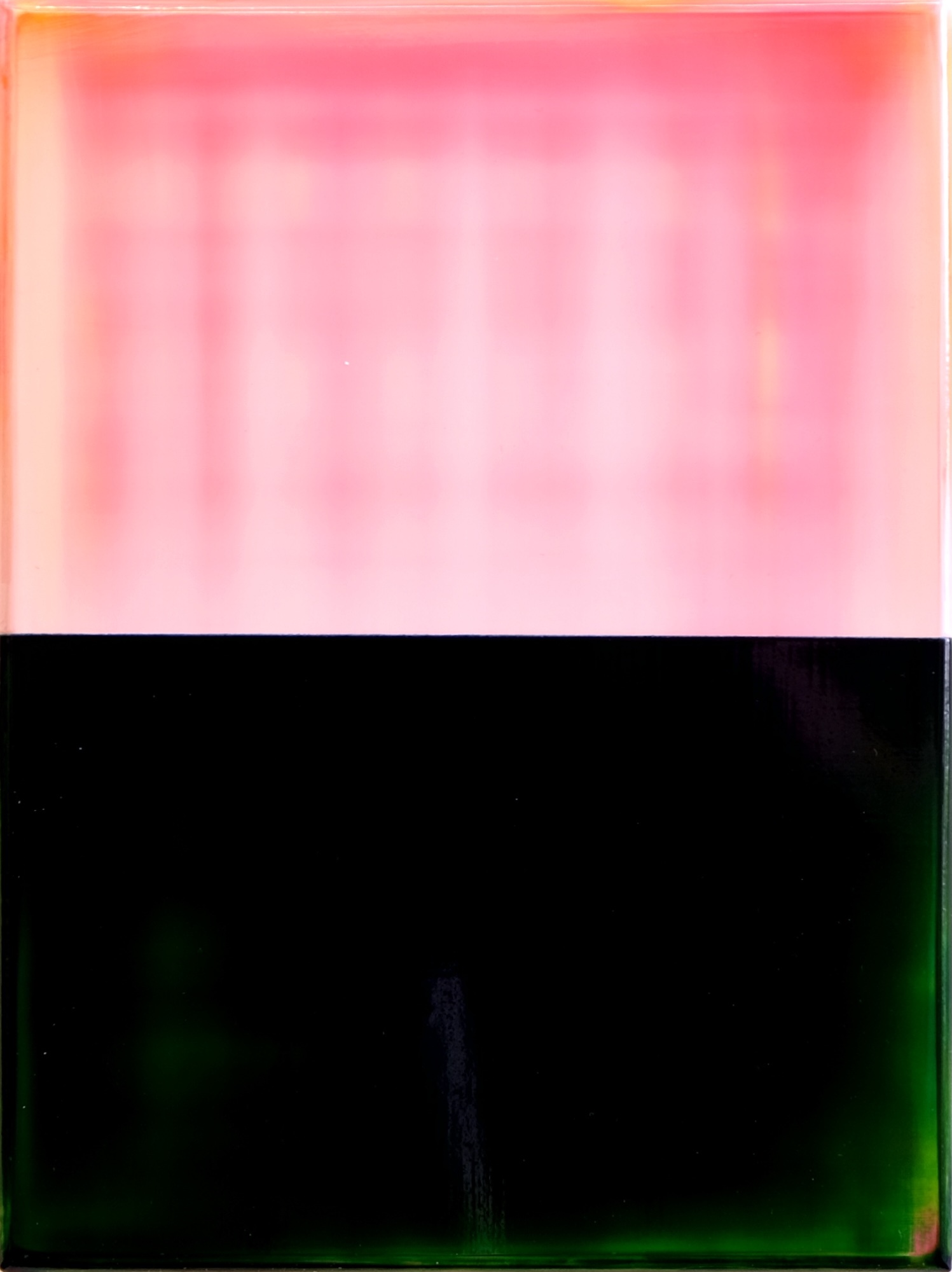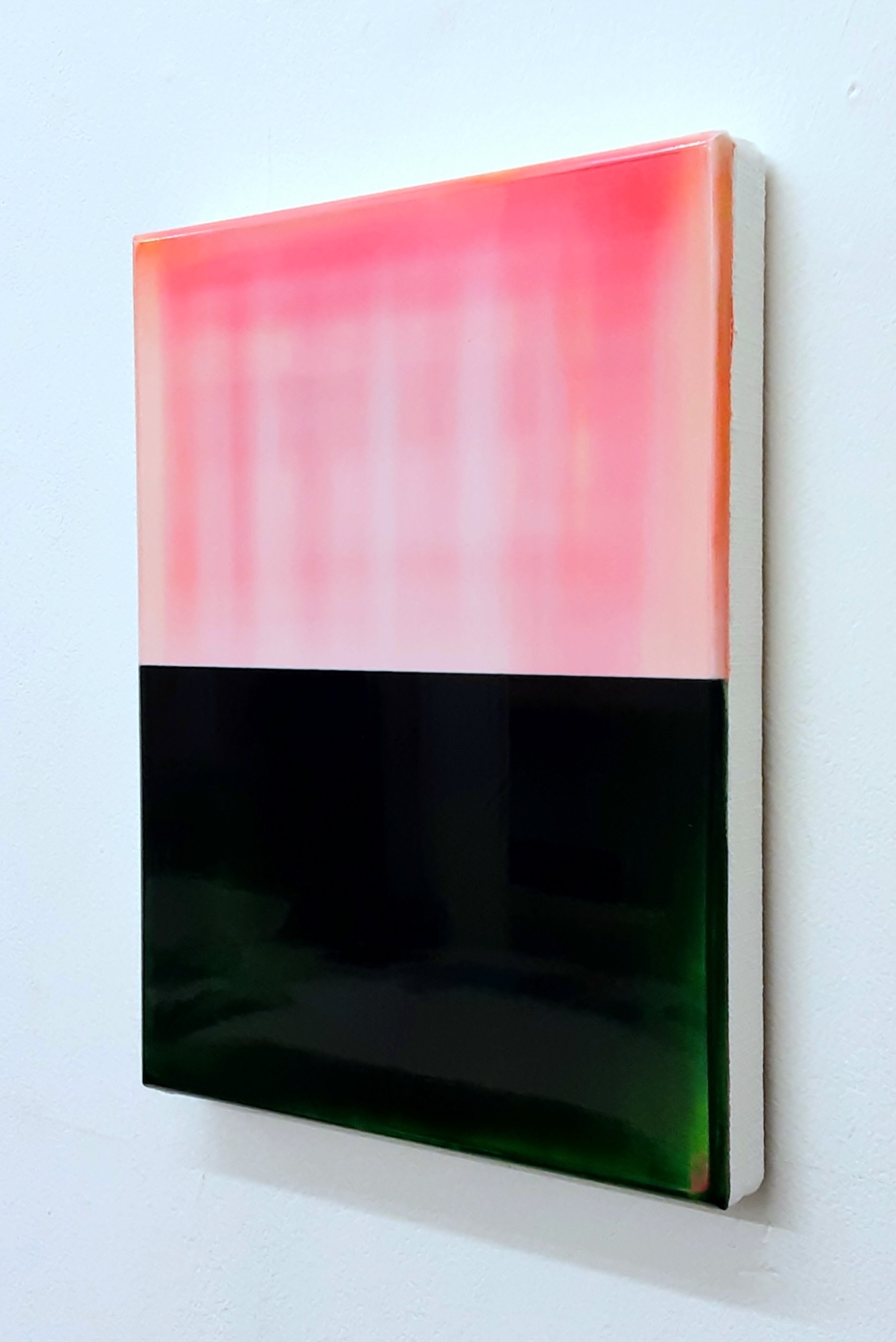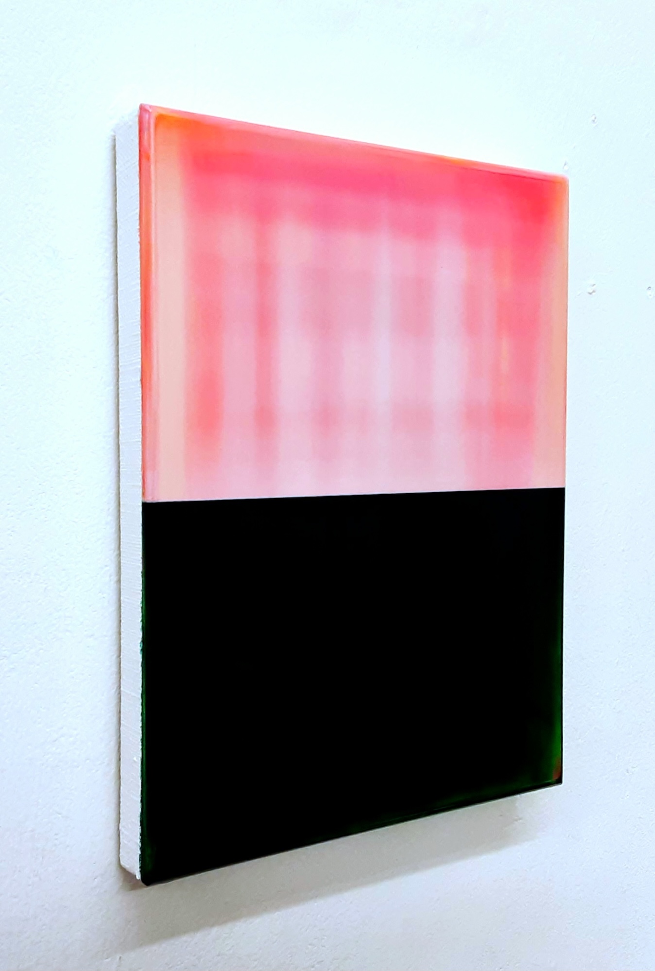 Contrapuntal Painting Study (12/25) is an artwork by Scottish artist James Lumsden. This piece is divided horizontally, showcasing a light pink in the upper section and a deep, dark green below. The colors are highly contrasting yet possess a translucent, luminous quality.