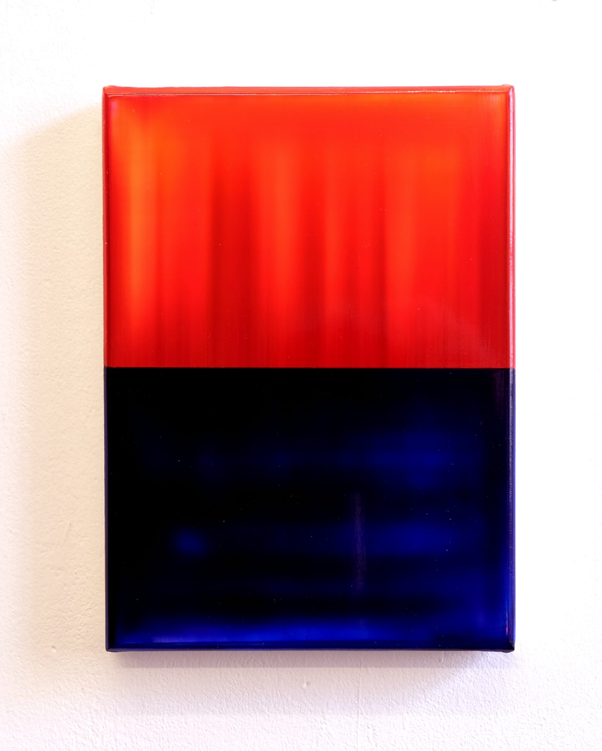 Contrapuntal Painting Study (9/25) is an artwork by Scottish artist James Lumsden. This piece is divided horizontally, showcasing a vivid fiery red in the upper section and a deep, midnight blue below. The colors are highly contrasting yet possess a translucent, luminous quality.