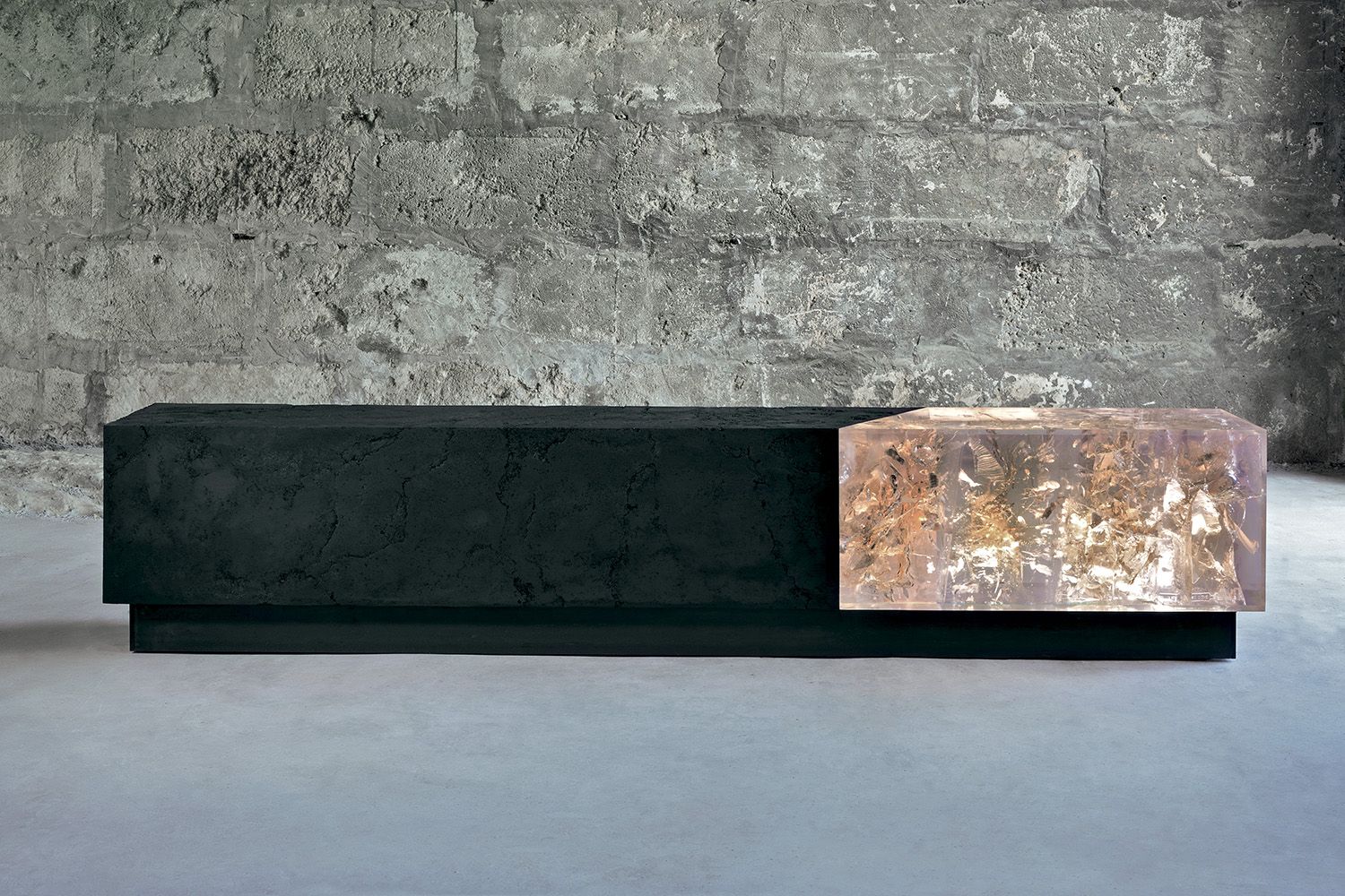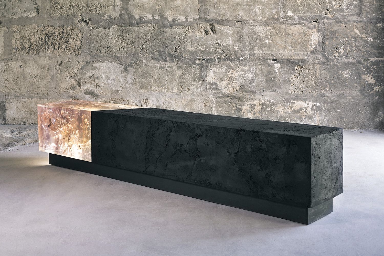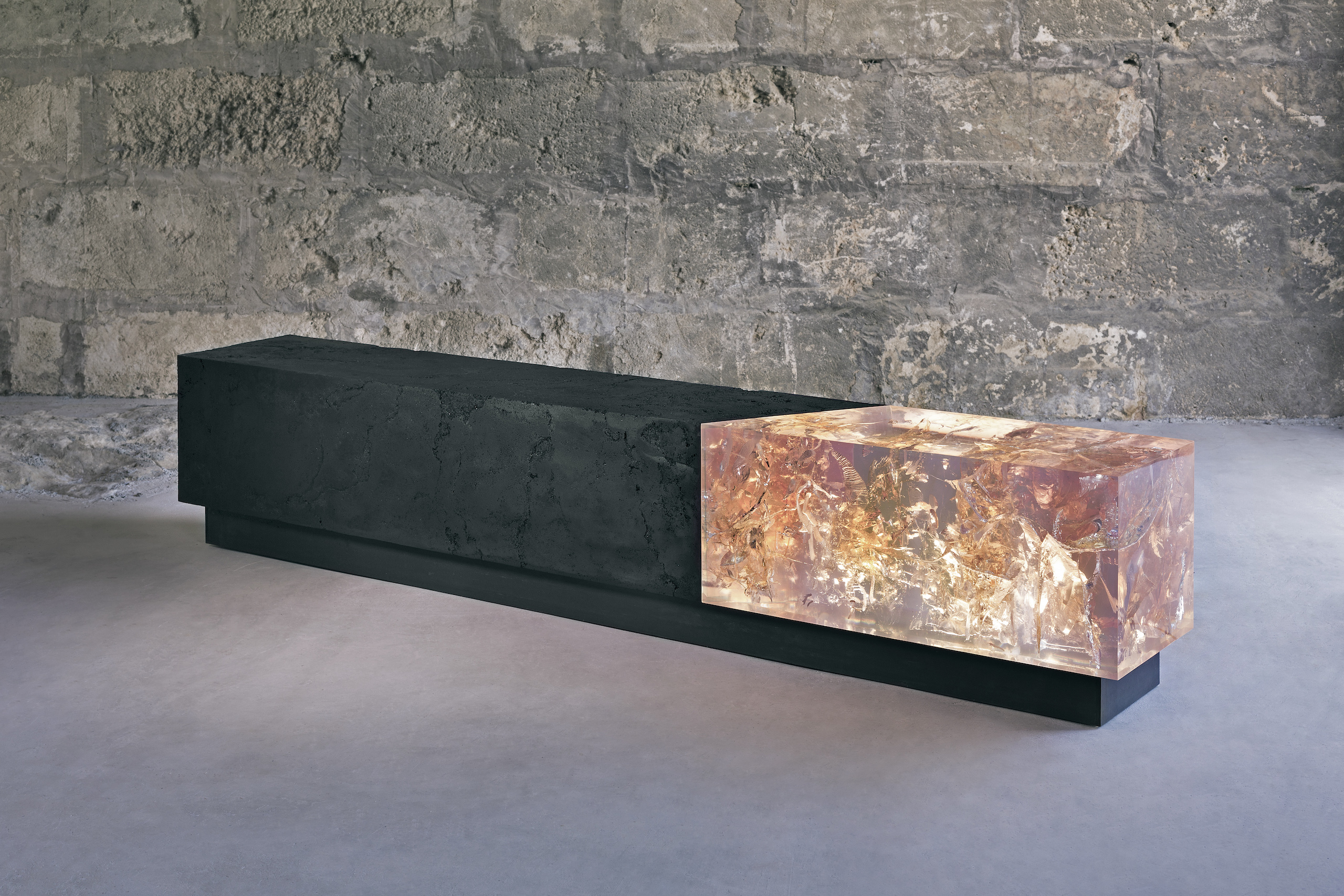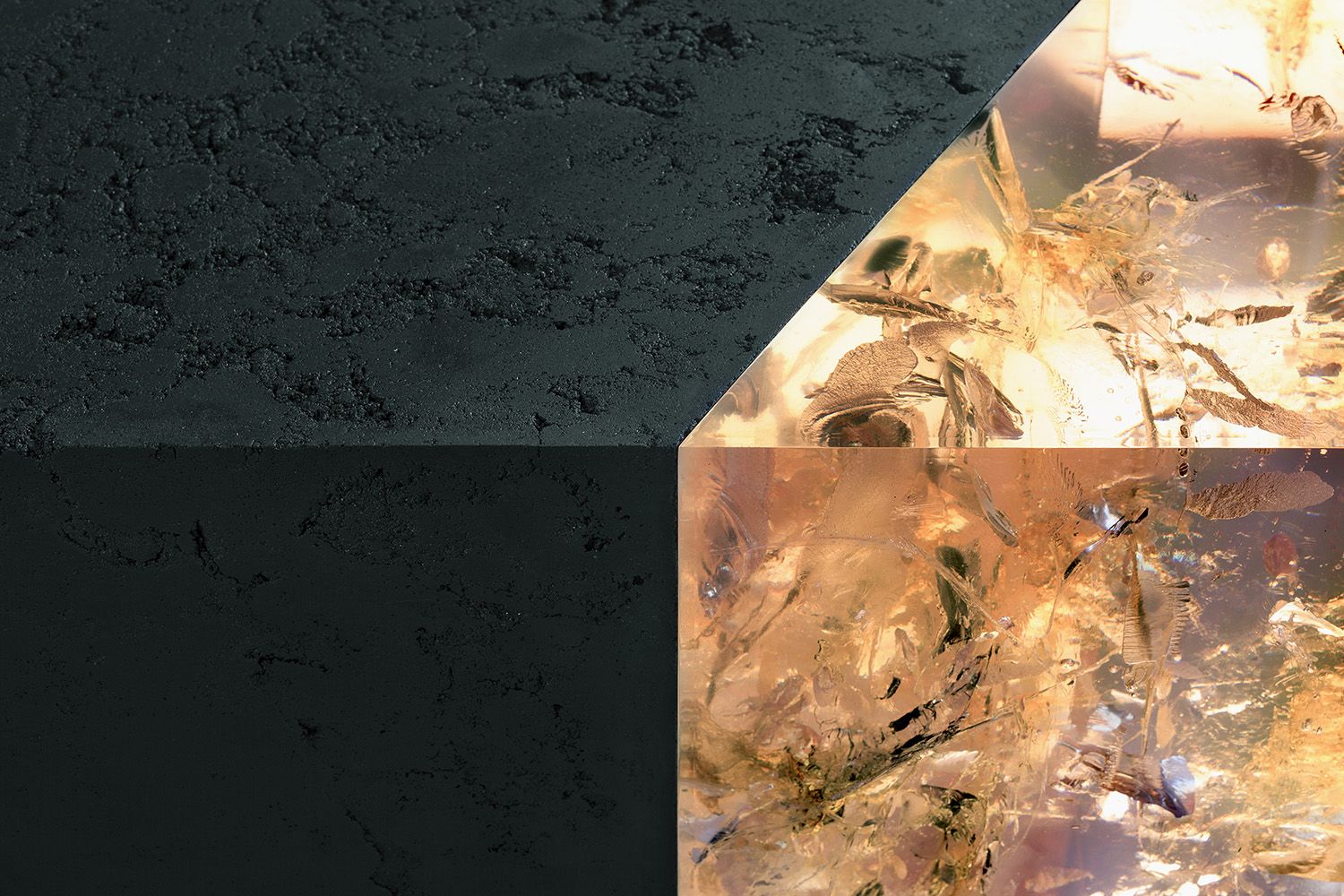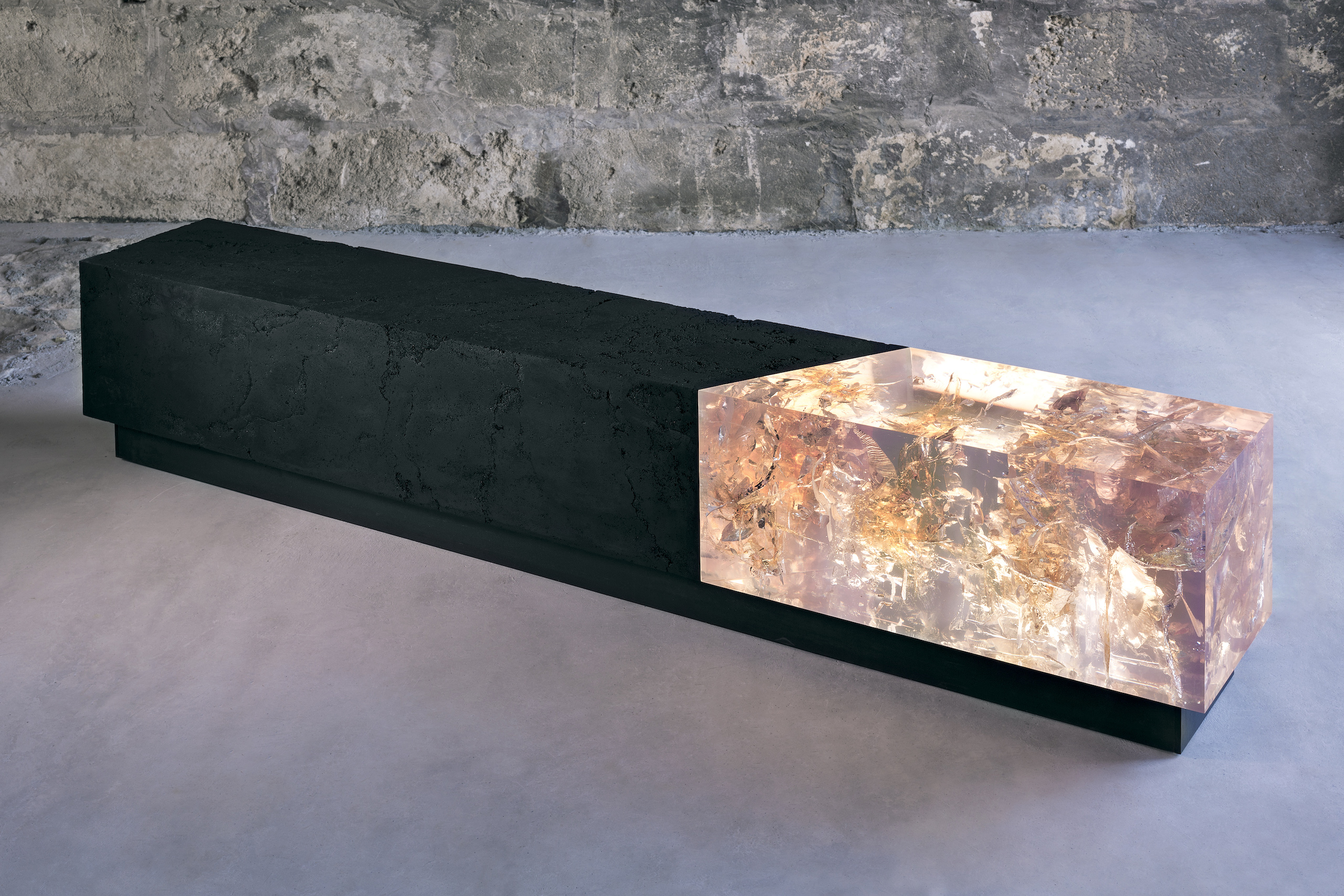 Counterpart (diptych 45) is one of Tom Price’s ‘hybrid’ artworks sitting halfway between art and design: the piece can be seen exclusively as a sculpture or can also serve as a bench. In this artwork, dark and opaque coal is put into relation and opposition with crystalline and translucent resin. However, unlike the Counterpart artwork piece, the contrast of the two materials is presented here within the same element, thus becoming much stronger. Tom Price alludes to carbon’s transformative power, which depending on its molecular structure and level of purity can take on completely different shapes and colours, from graphite or coal to diamond.