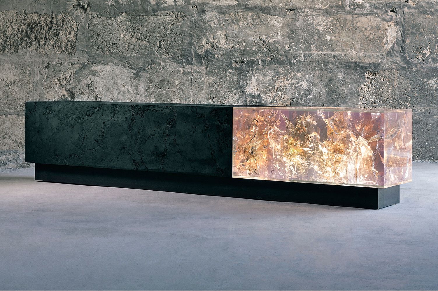 In the Synthesis series, Tom Price forces resin and tar to live in the same space, experimenting with the chemical reactions through heating materials and catalysis process. As the tar fragments inserted into the resin blocks widen, they develop fissures, voids and cracks, modifying the original appearance, colour and characteristics of the resin. A new element is now created by the synthesis of the two. Although the creative process is begun and managed by the artist, the chemical reactions are not fully controlled and the end result is unique each time, exceeding the limits of his imagination. The works of the Synthesis series are pieces of surprising beauty, intriguing and mysterious, drawing in the viewer’s admiration of the detail’s forms, the subtle colour nuances and the changing light reflections.This powerful visual impact is highlighted in some artworks, as in this case, by LED lights (via cable).