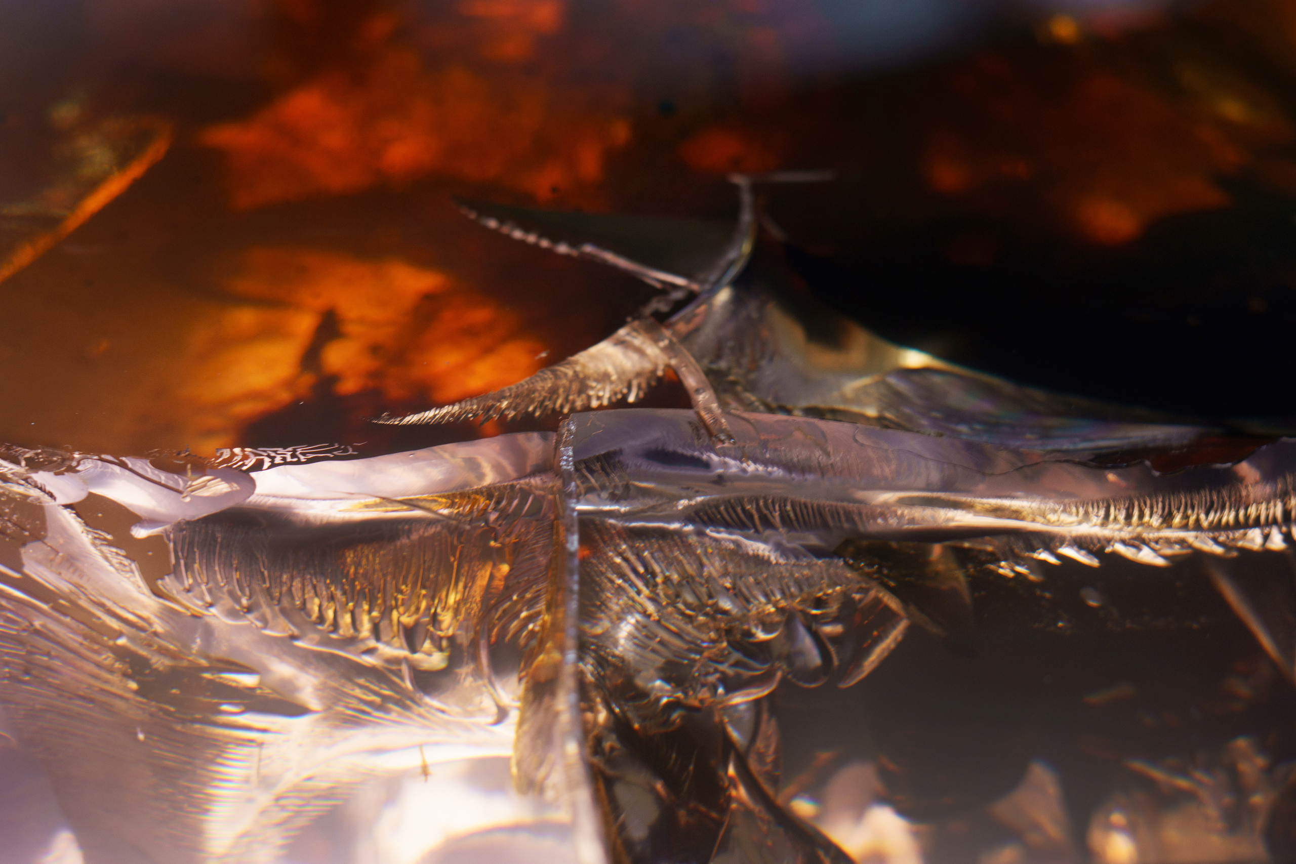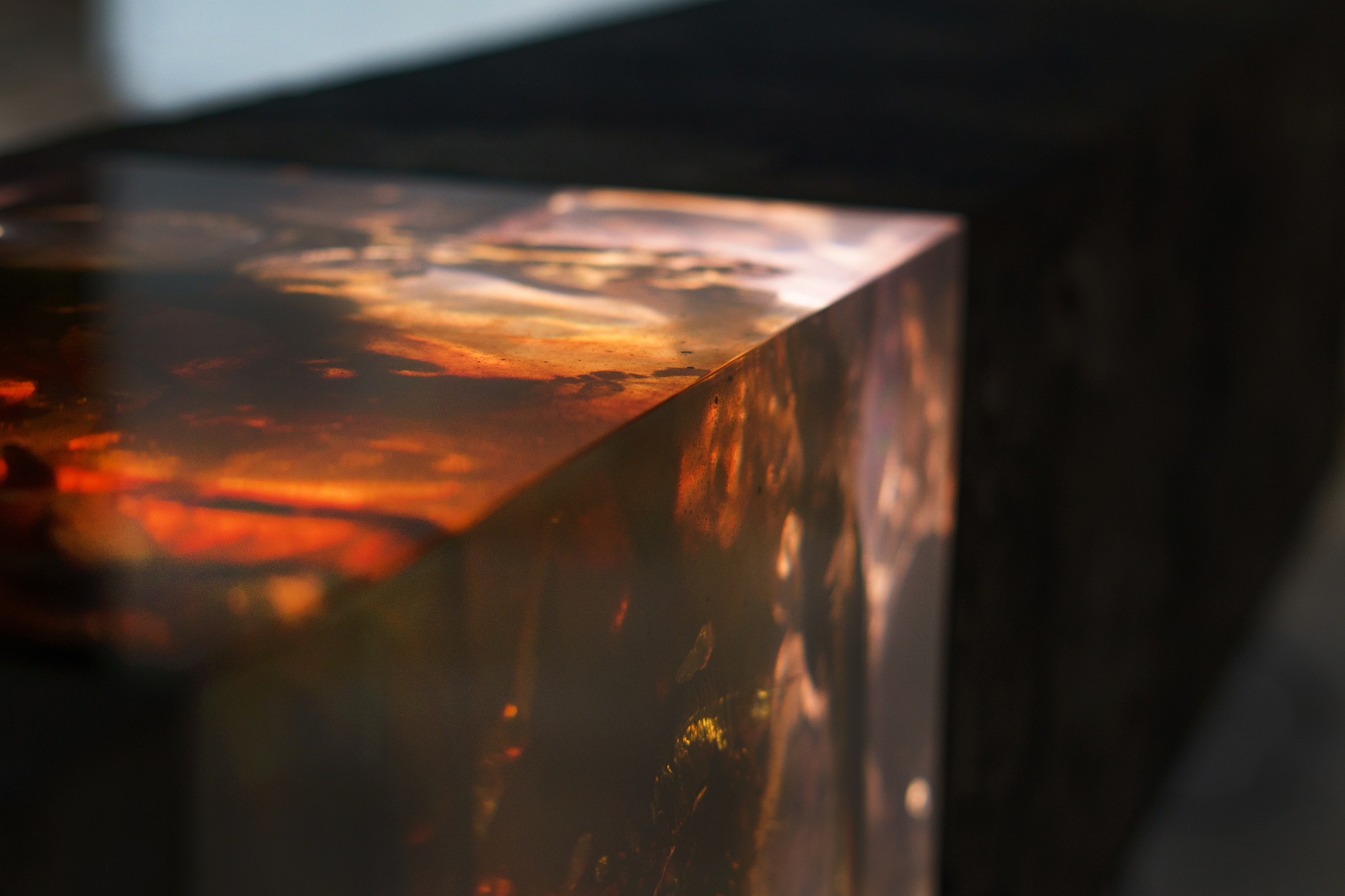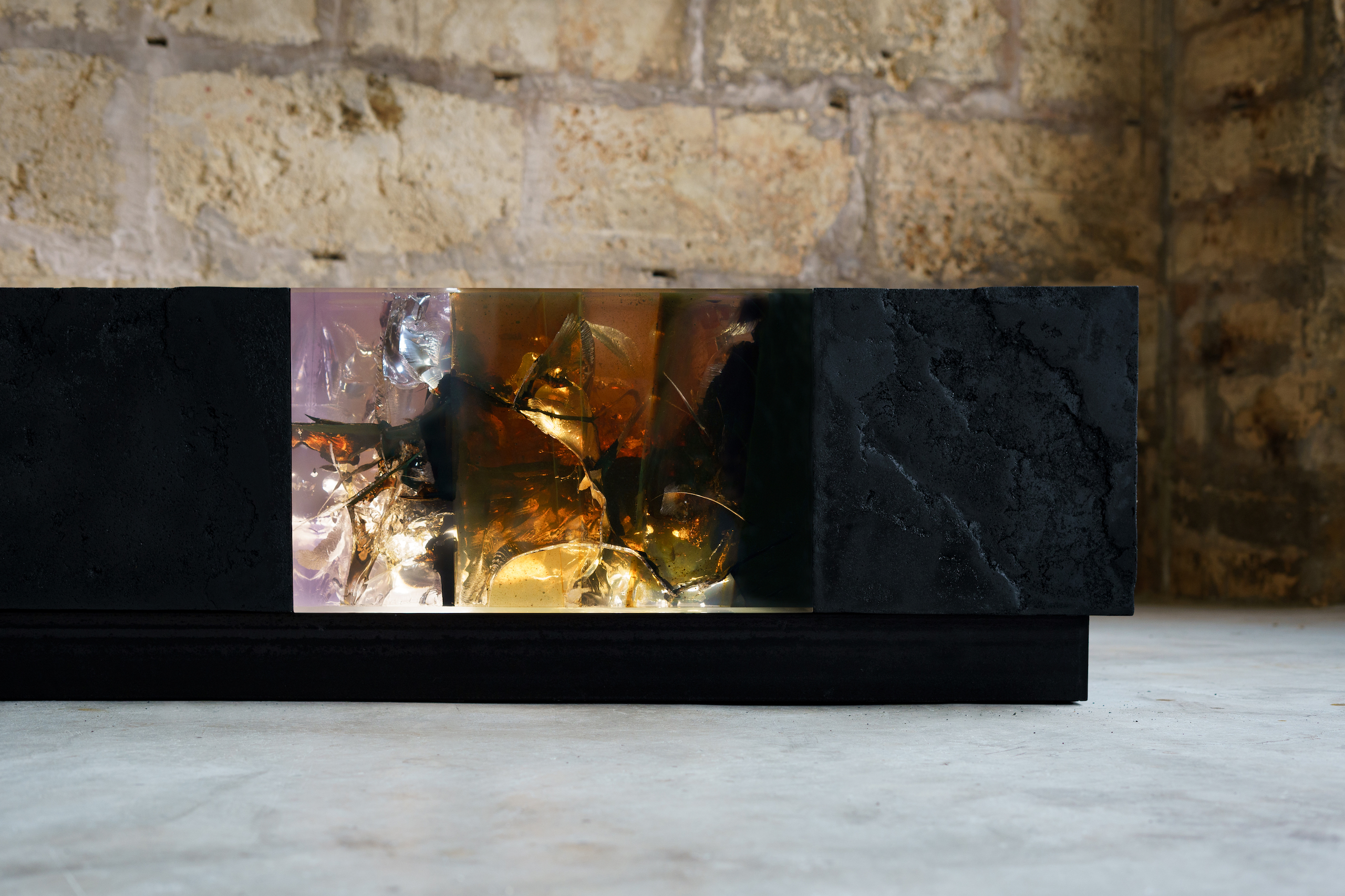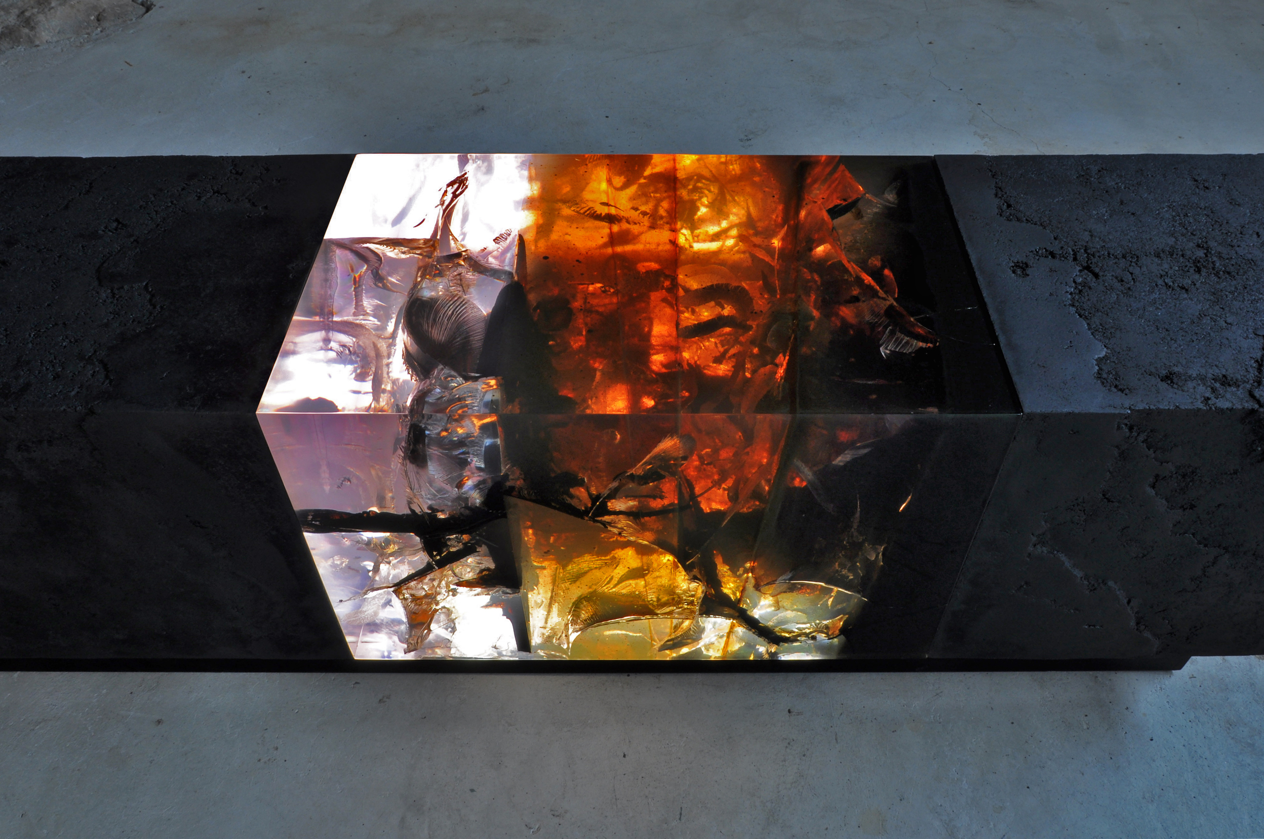 In the Synthesis series, Tom Price forces resin and tar to live in the same space, experimenting with the chemical reactions through heating materials and catalysis process. As the tar fragments inserted into the resin blocks widen, they develop fissures, voids and cracks, modifying the original appearance, colour and characteristics of the resin. A new element is now created by the synthesis of the two. Although the creative process is begun and managed by the artist, the chemical reactions are not fully controlled and the end result is unique each time, exceeding the limits of his imagination. The works of the Synthesis series are pieces of surprising beauty, intriguing and mysterious, drawing in the viewer’s admiration of the detail’s forms, the subtle colour nuances and the changing light reflections.This powerful visual impact is highlighted in some artworks, as in this case, by LED lights (via cable).