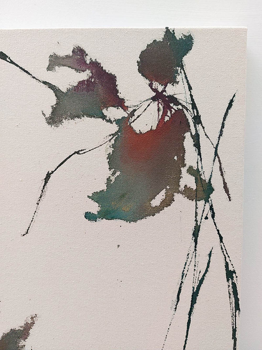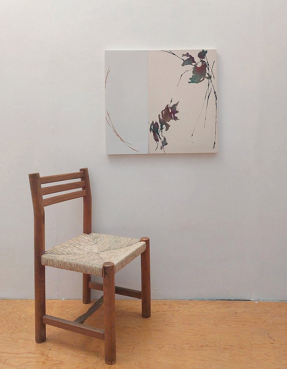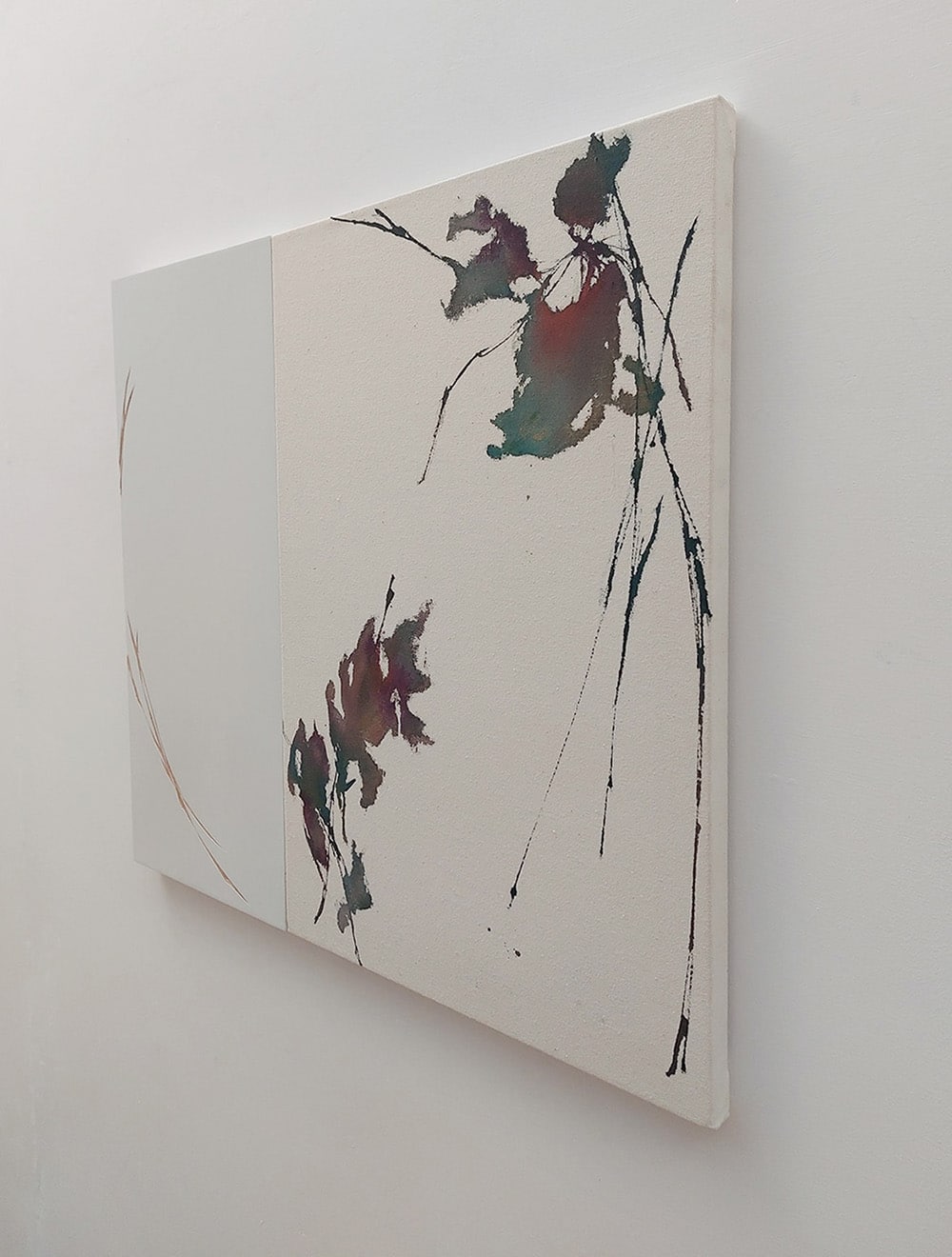 Abstract shapes and patterns complement the paintings, evoking natural elements such as leaves, bird wings and buds. However, Maho Maeda’s works are not representations or imitations of nature, but rather personal interpretations of the sounds of nature materialized in a visual form and a concrete medium.