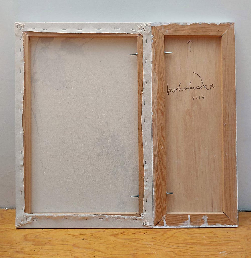 This work is composed of two assembled panels that give the work two different surfaces: canvas and wood. The artist likes to experiment with different mediums and techniques; here she mixes acrylic paint with ink and coloured pencils, and uses a knife to carve her lines into the wood.
