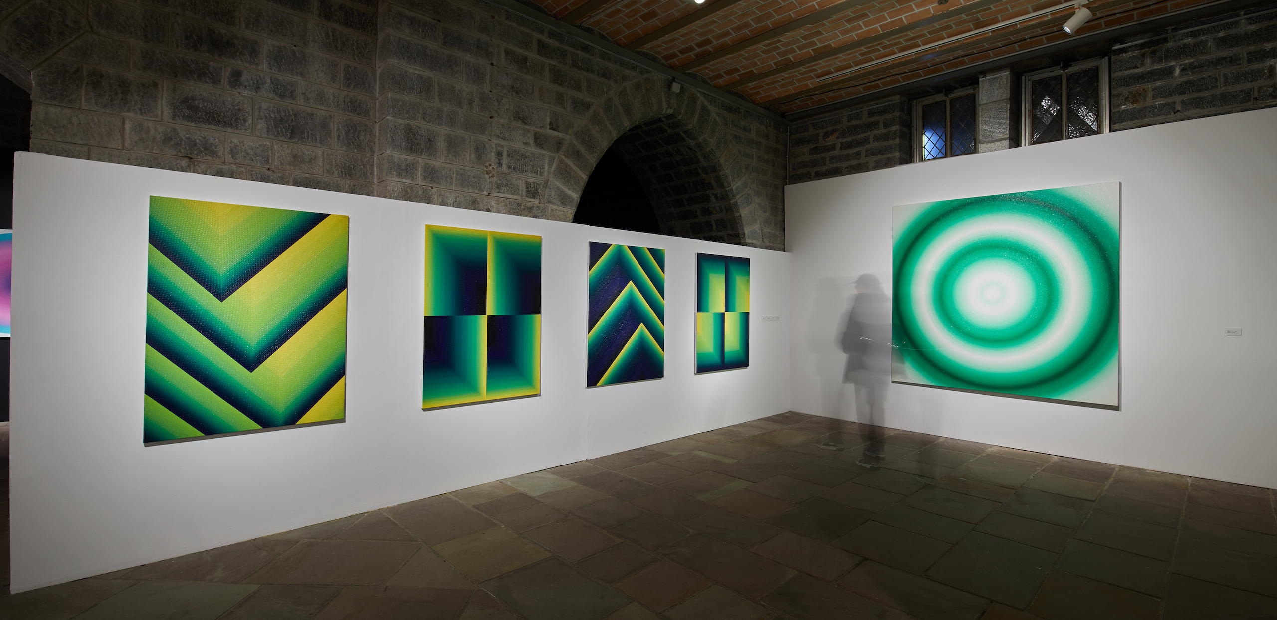Mathieu Piffeteau’s abstract paintings explore the diffusion of light and optical illusions through a harmonious combination of simple, universal geometric shapes (circles, squares, triangles, etc.) with gradations of colour painted in oils. The result is a captivating work that exudes a vibrant energy; the viewer is immersed in pure aesthetic contemplation, a unique and subjective sensory experience.